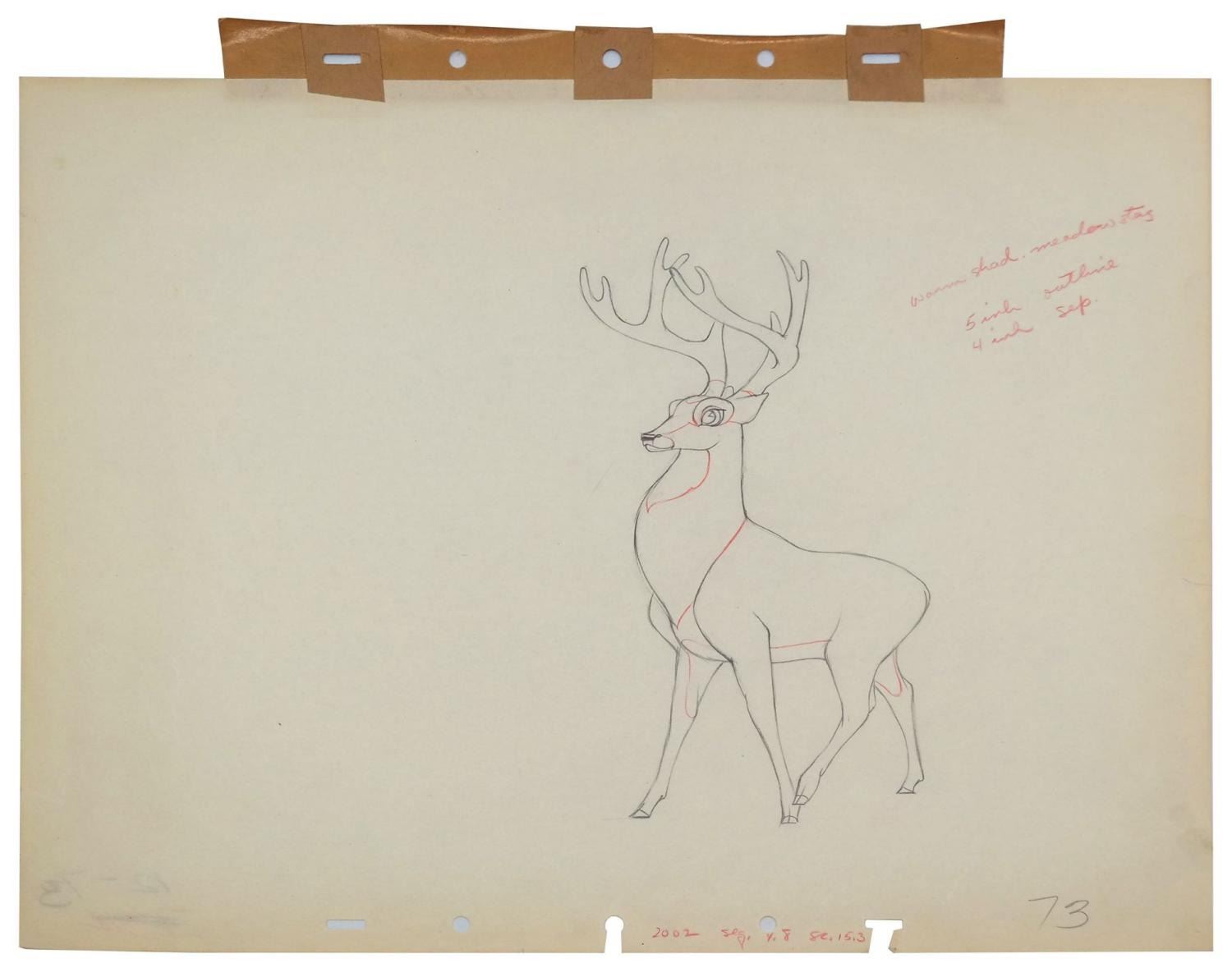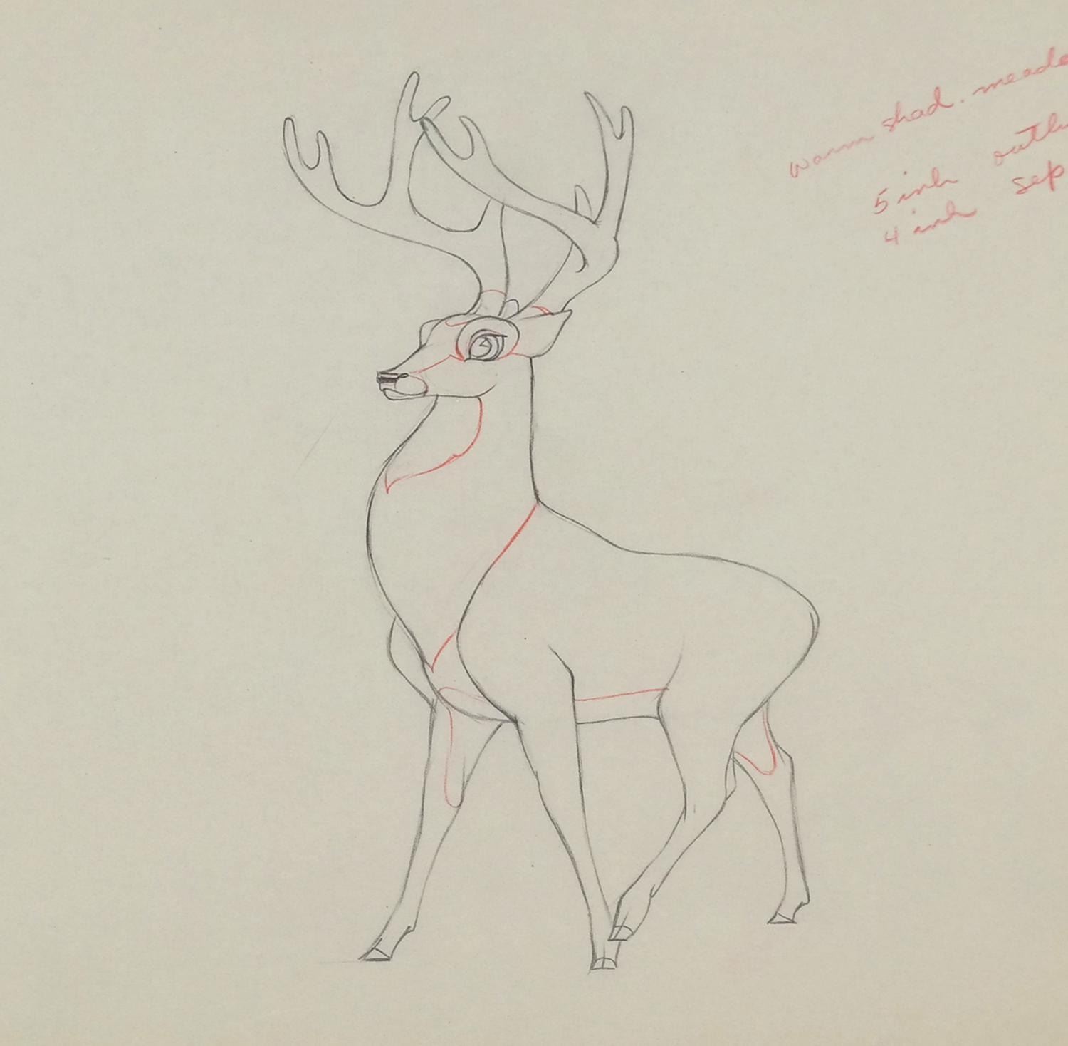 (Disney, 1942) An original production drawing of the Great Prince of the Forest from "Bambi.” Bambi’s dad has an image size of 8.5” x 4” on 12.5” x 15.5” animation paper. The graphite drawing is in very good condition with minor edge wear and an additional peg strip adhered to the top edge of the paper.