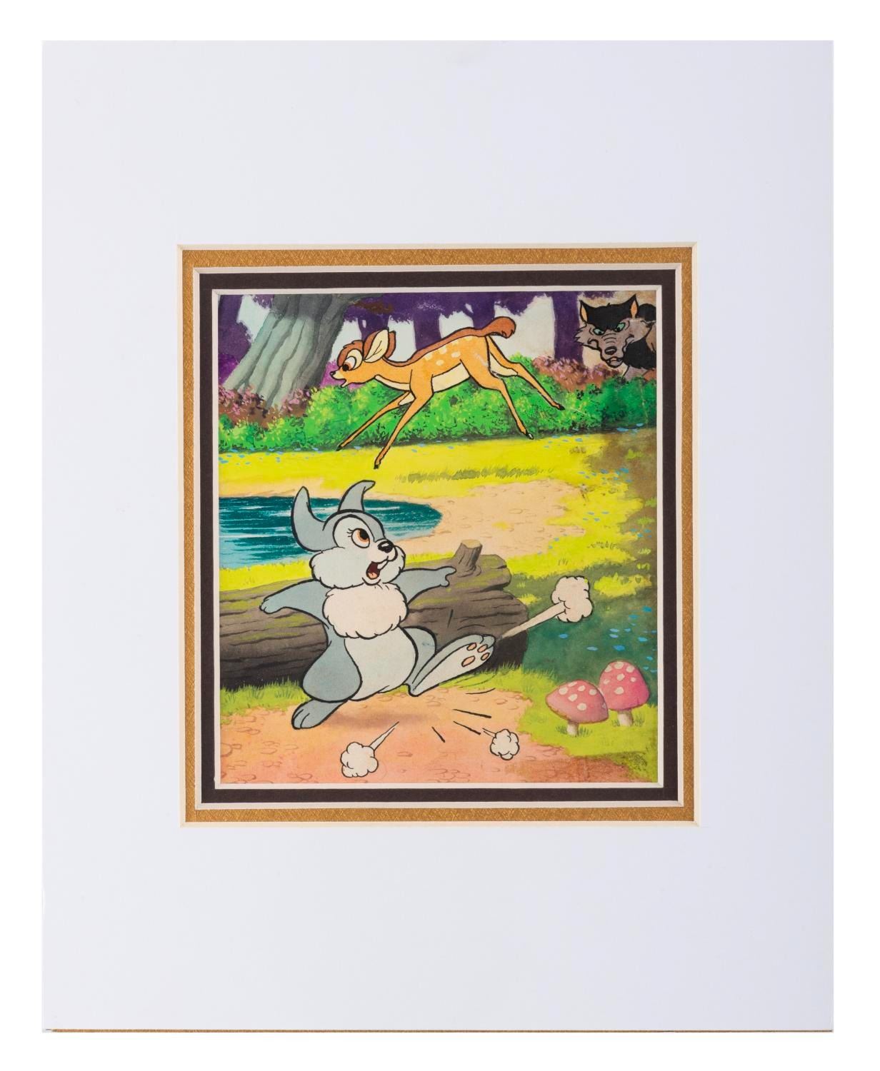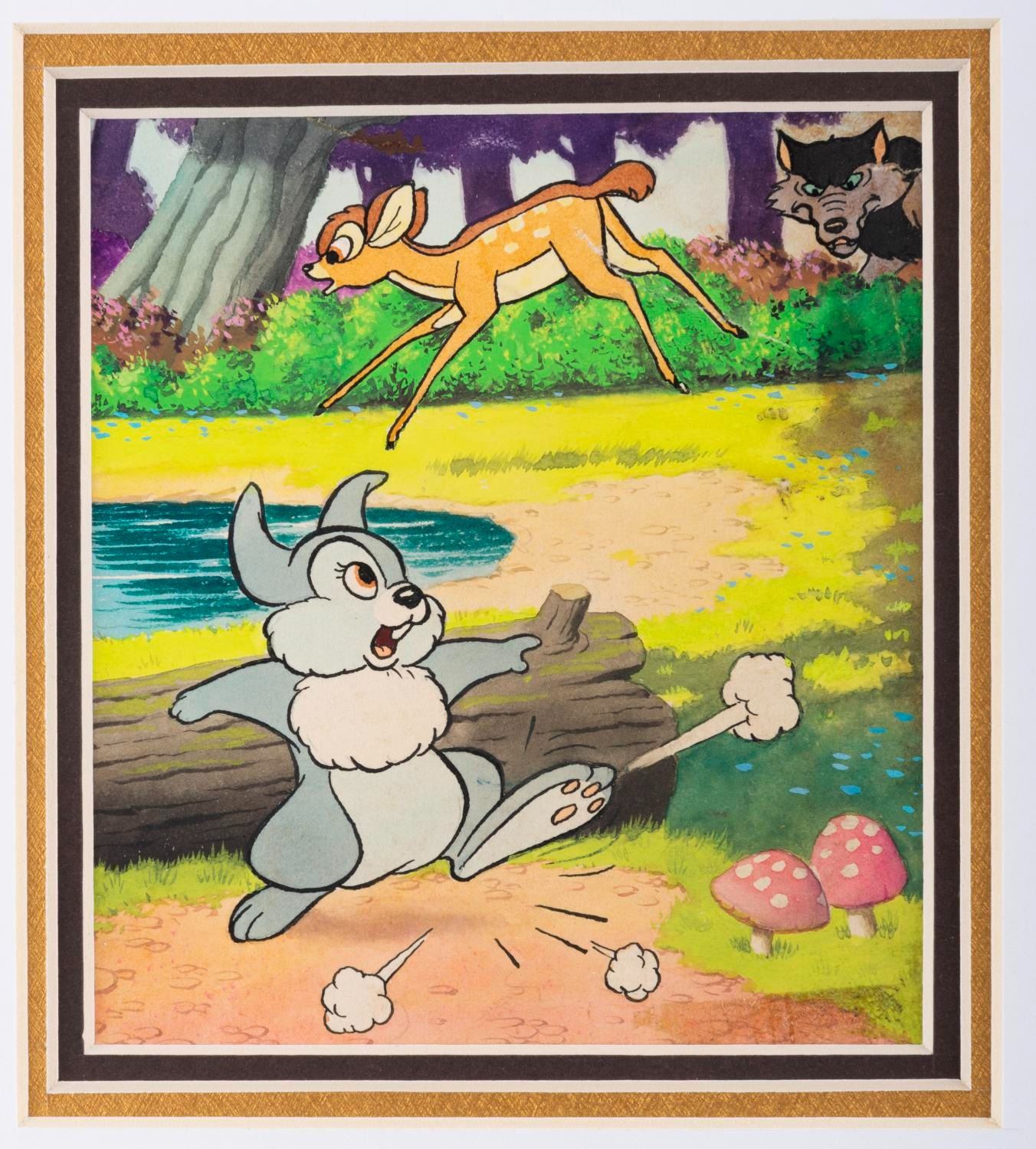 (1950s-70s) A small painting of Thumper warning Bambi of an approaching wolf. Accomplished in gouache, the painting with 4.5" x 5" visible in an 8" x 10" matte is in very good condition, with a small tear repaired above Bambi’s head.