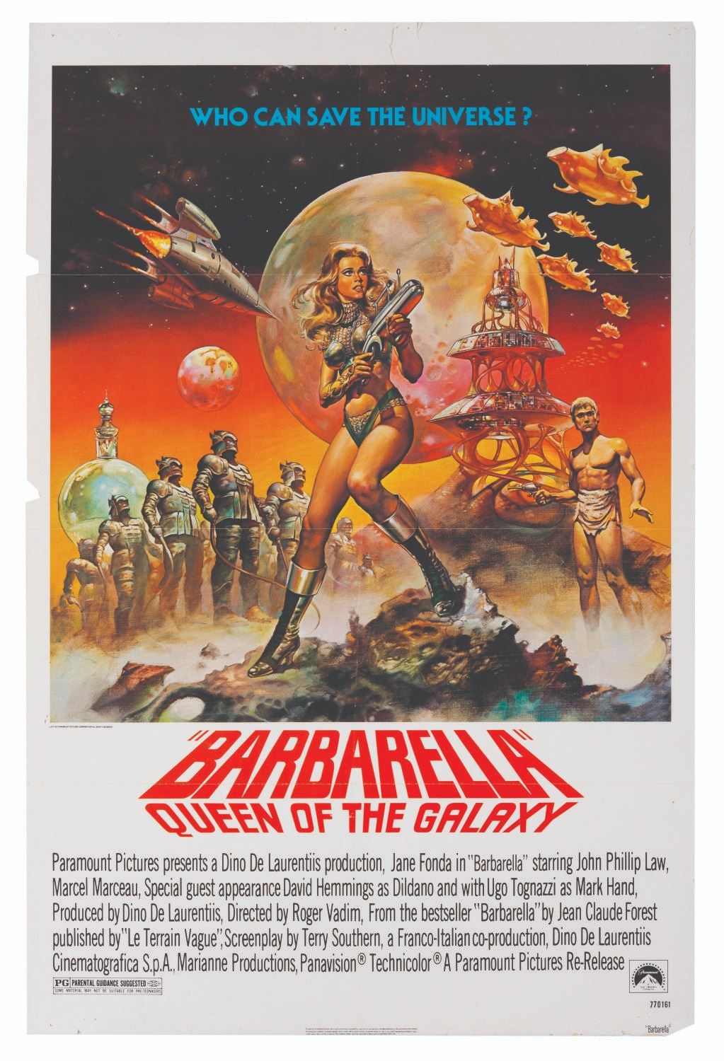 (Paramount, 1977) A rare one-sheet for the 1977 theatrical re-release of “Barbarella: Queen of the Galaxy,” starring Jane Fonda. The poster was designed by acclaimed fantasy artist Boris Vallejo. Measuring 27” x 41”, the poster is in fair condition with heavy edge wear and tears ranging from 0.5” to 2”, pinholes, wear along the folds as issued, light creasing, and tape repair on the reverse.