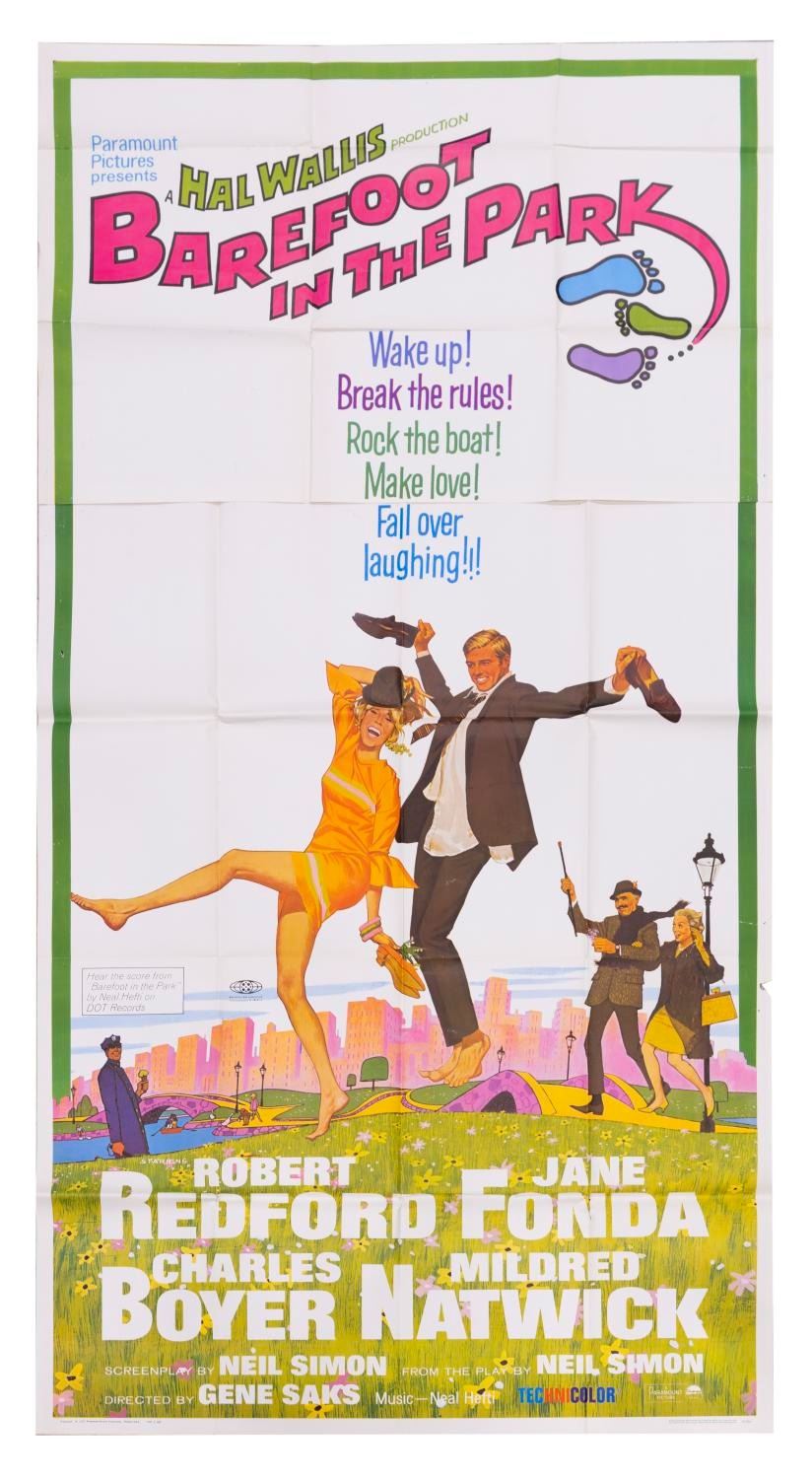 (Paramount, 1967) A rare-sized 3-sheet poster for "Barefoot in the Park," starring Jane Fonda and Robert Redford. Measuring 41" x 81", the poster displays in good condition with pinholes, spots of discoloration, tears, separation at the original folds, and edge tears up to 2" long.