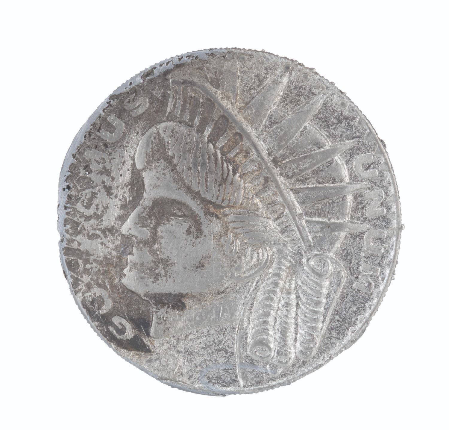 (Warner Bros., 1995) A prop coin for Two-Face, portrayed by Tommy Lee Jones in “Batman Forever.” In the film, Two-Face flips a coin to determine his victims' fates. One side read "Gothamus Unus," while the other side was intentionally scratched to represent the normal and scarred sides of the villain's face. Measuring 2.5” in diameter, the metal prop coin displays in very good condition with light oxidation from age and wear from production use.