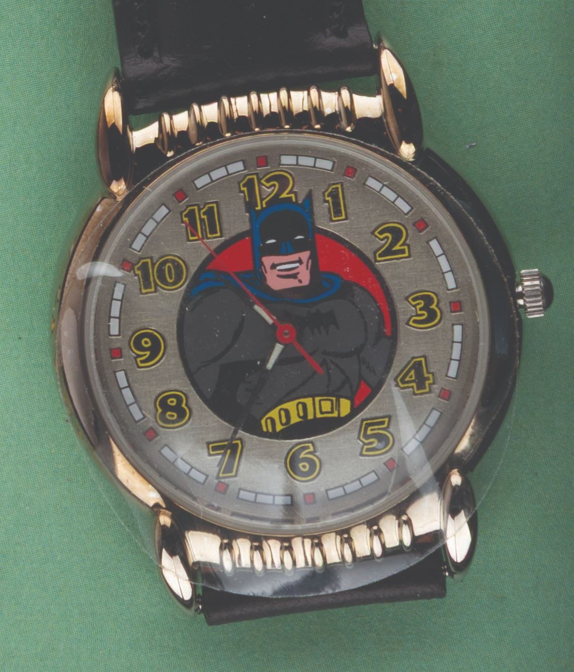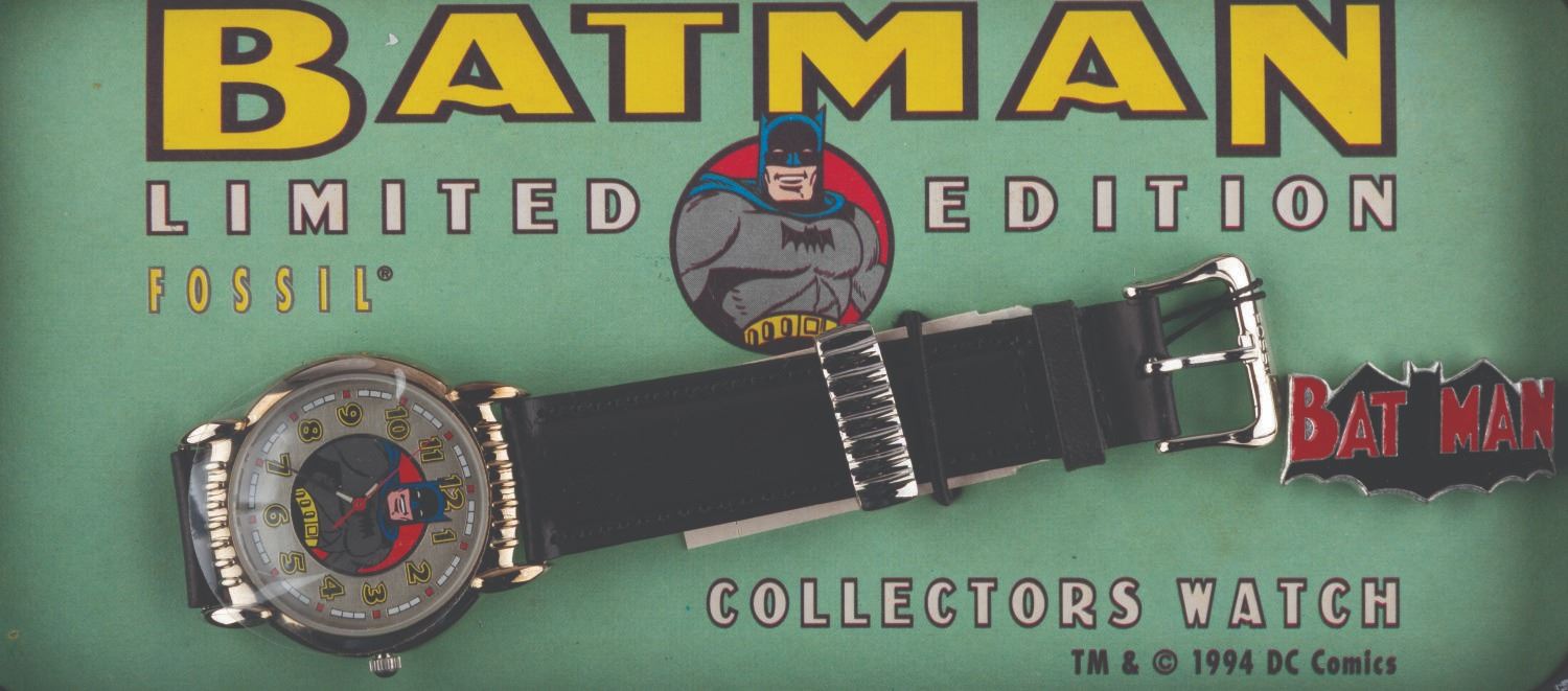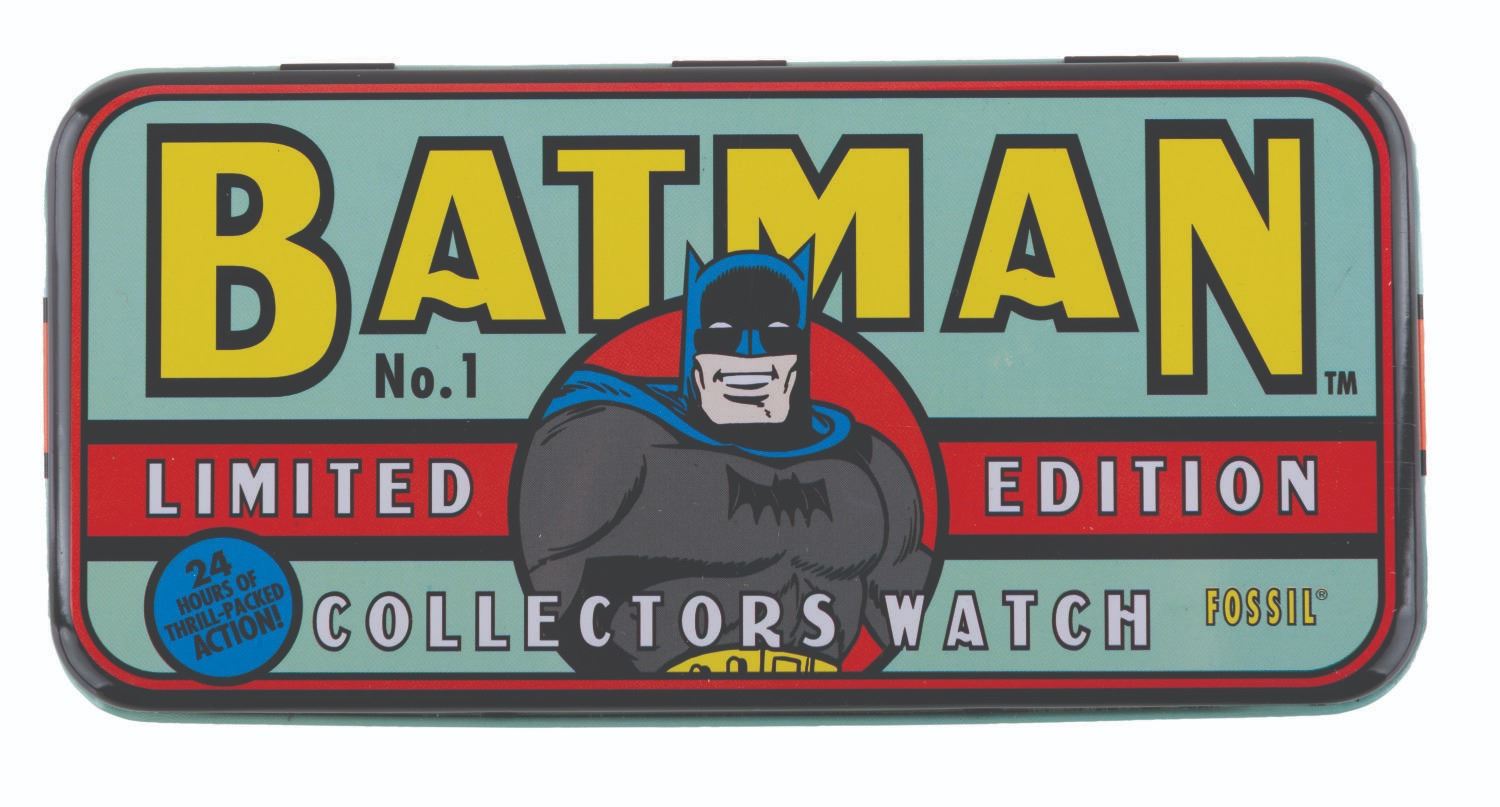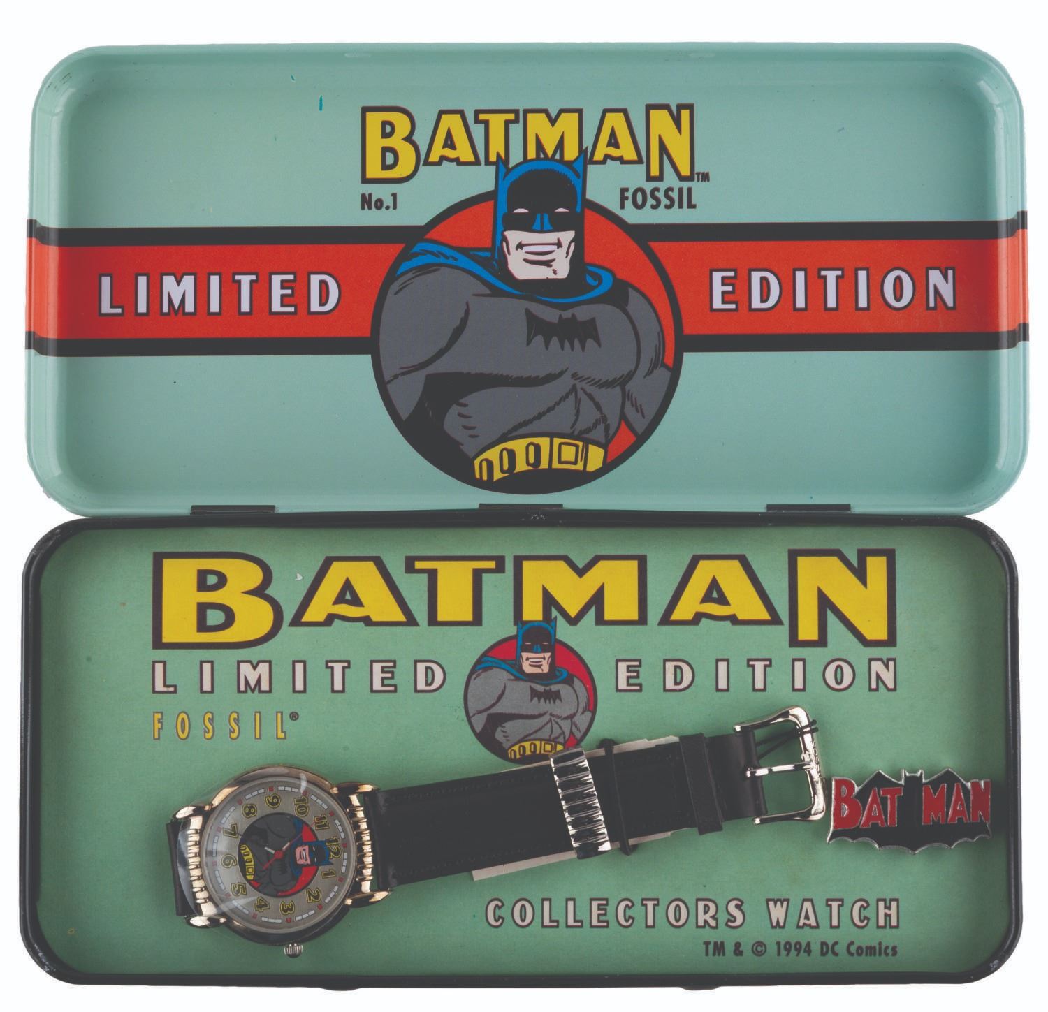 (Fossil, 1994) A "Batman " collector's watch with logo pin and tin, featuring the Dark Knight as he appeared in 1940s comic books. Released in a limited edition of 10,000, the set is in fine condition, requiring a battery and possibly service to function.