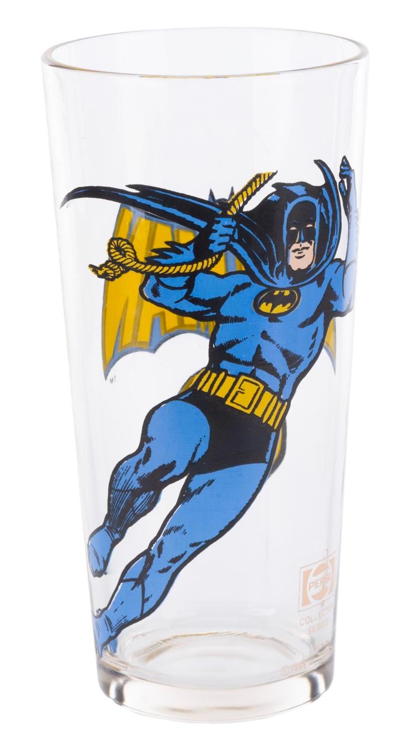 (Pepsi, 1966) A Batman glass from the Pepsi Collectors Series. Measuring 3” in diameter at its widest point and 6.25” tall, the glass is in very good condition with light paint loss to the first “A” in the Batman logo.
