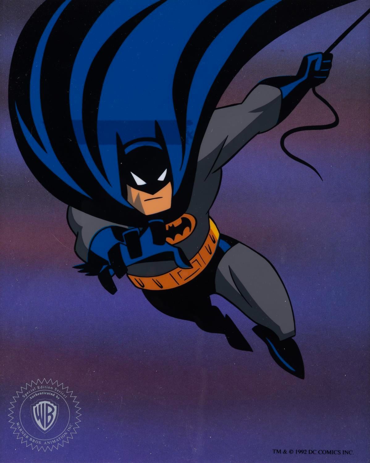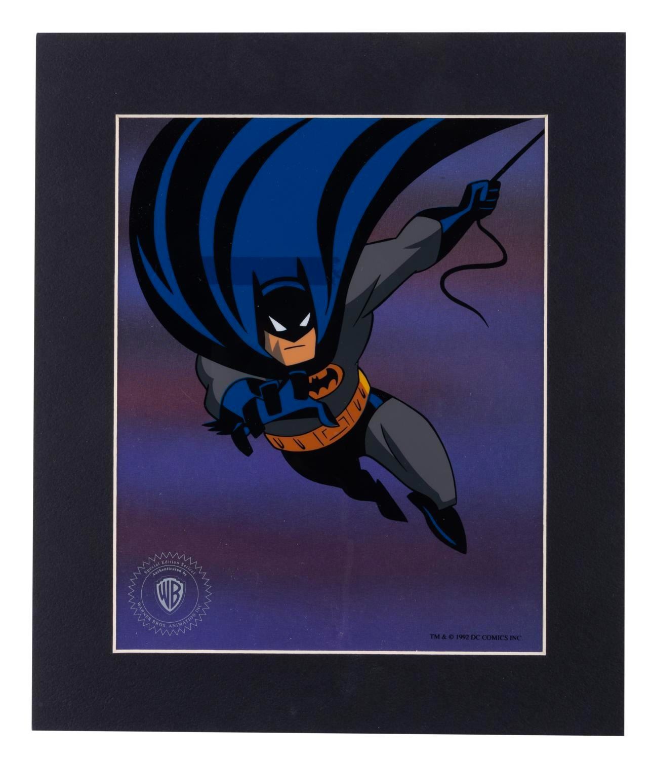 (Warner Bros., 1992) A limited edition sericel of Batman as he appeared in “Batman: The Animated Series,” created for a promotional giveaway. With a character image size of 8” x 7.75” on a 10” x 8” visible cel in a 13” x 11” matte, the piece is in good condition with a 0.5” x 3” area of discoloration on the reverse.