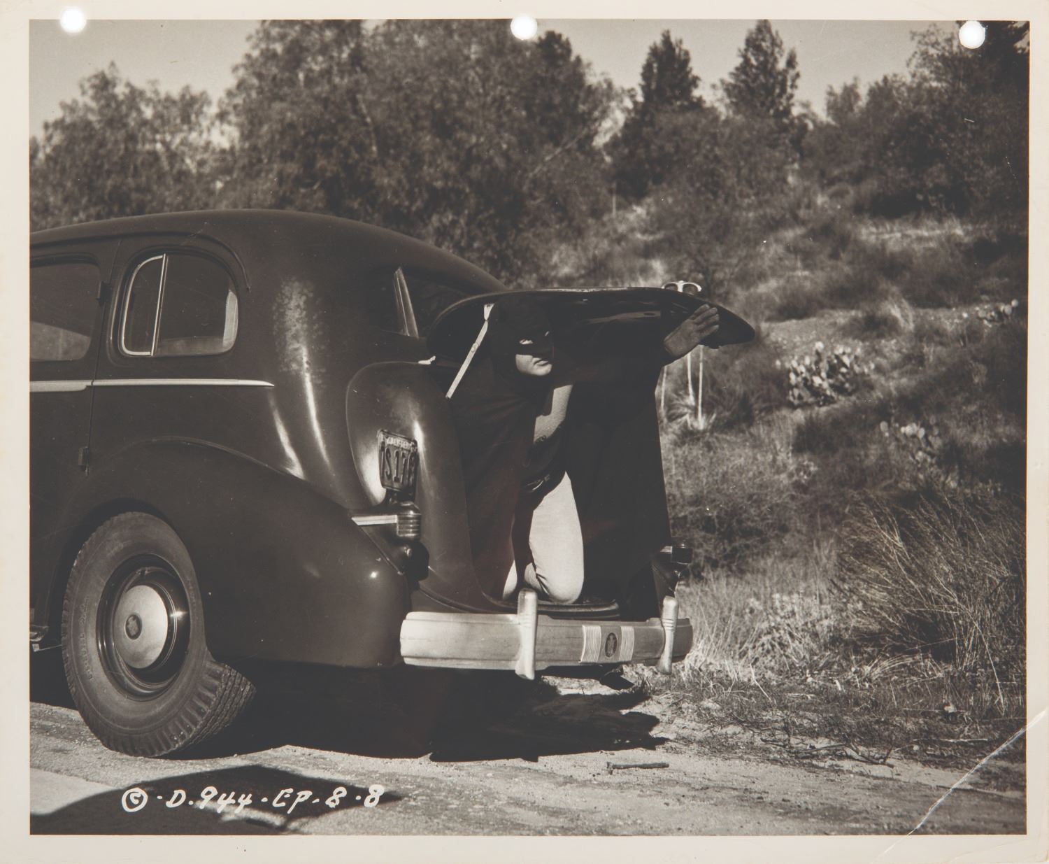 (Columbia, 1949) A publicity photo for Columbia Pictures’ 15-chapter "Batman and Robin” serial, starring Robert Lowry as Batman and Johnny Duncan as Robin. Measuring 8.25” x 10” the photo is in good condition with a clipped caption on the reverse, edge wear and creasing, a 2.25” fold to the lower right corner, and three-ring binder holes punched on the top edge.