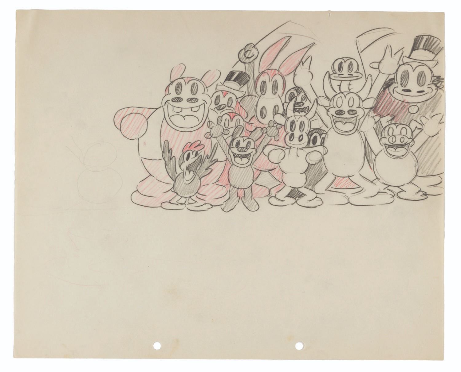 (Harman-Ising, 1932) An original storyboard drawing of a crowd from the Looney Tunes short “Battling Bosko.” Accomplished in graphite and colored pencil, the drawing measures 9.75” x 12” with an image size of 5” x 9.25”, and is in very good condition with light creasing, smudging, and edge wear from production use, and light discoloration from age.