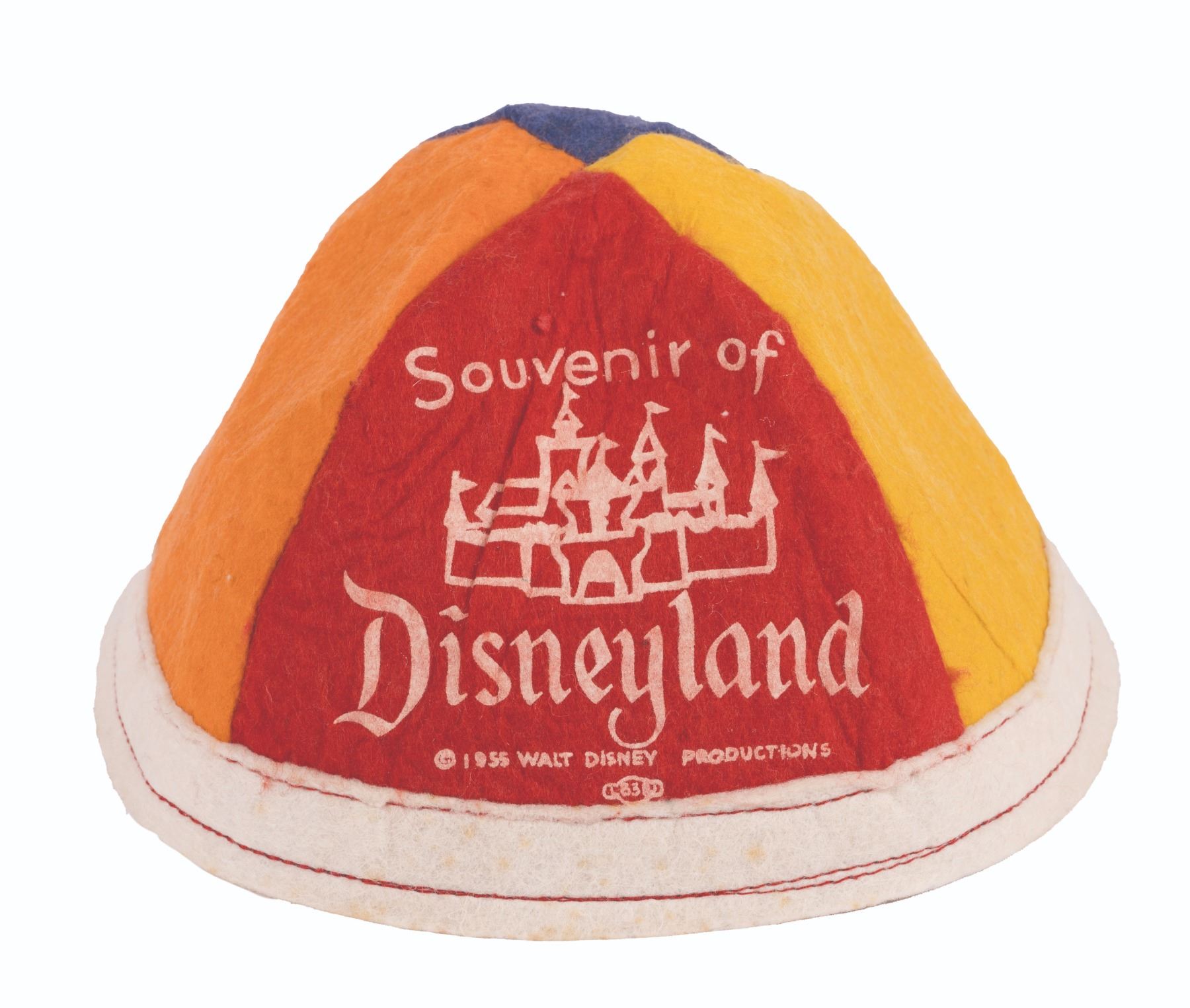 (Disneyland, 1955) An early beanie hat souvenir of Disneyland. This four-color felt hat features printed imagery of Sleeping Beauty Castle and the name of Disneyland. Measuring 6.25" in diameter, the children's hat is in good condition with creases, pilling and minor wear throughout from handling and age.