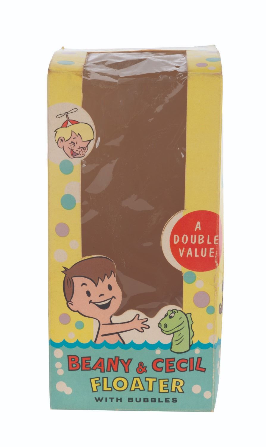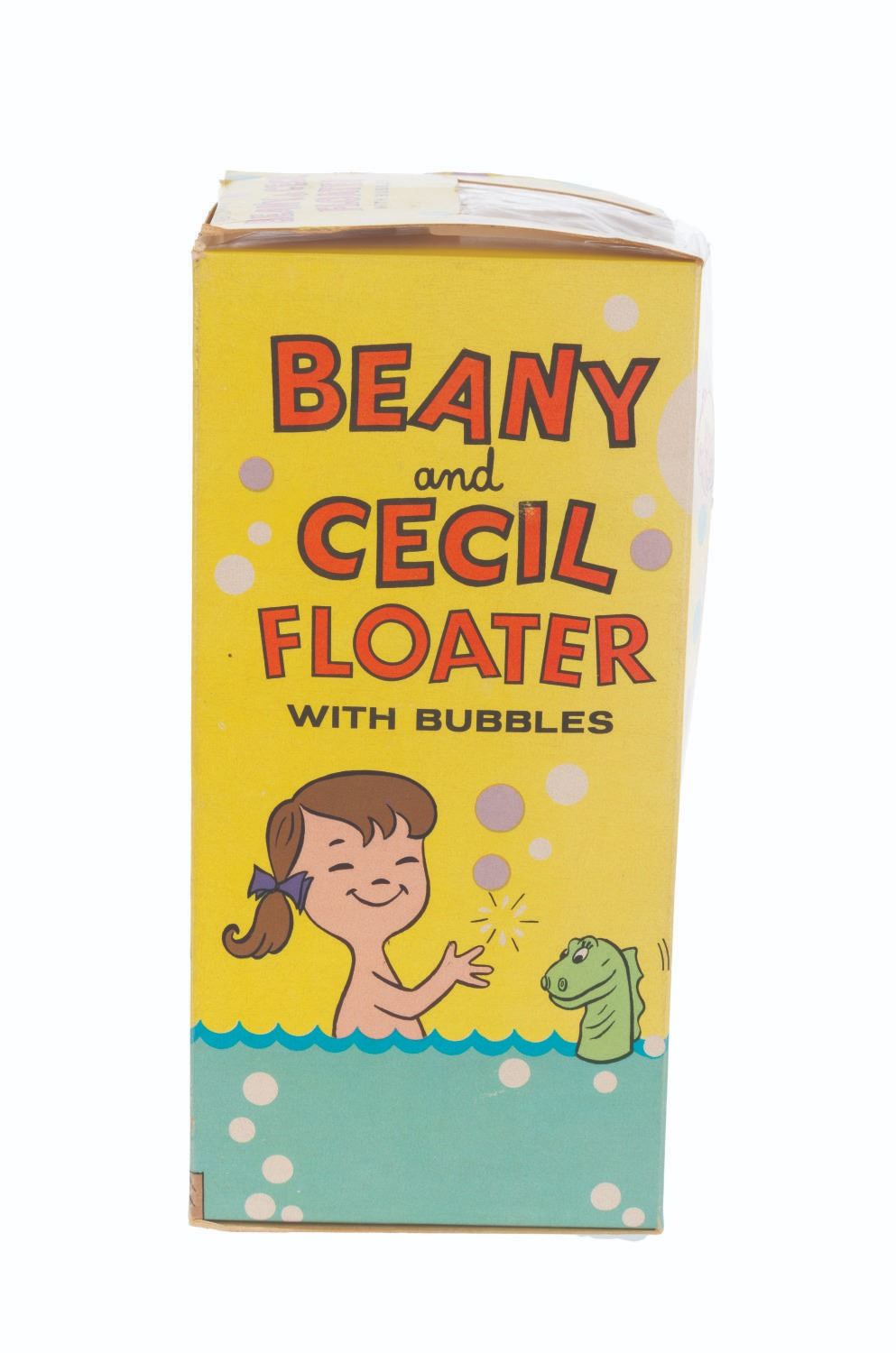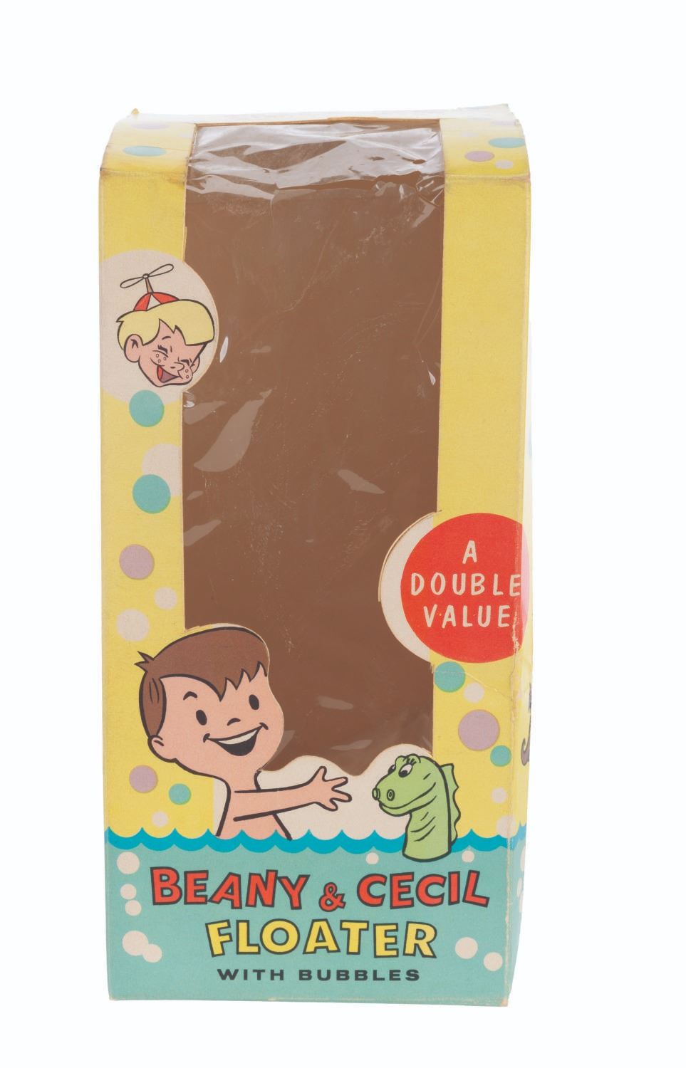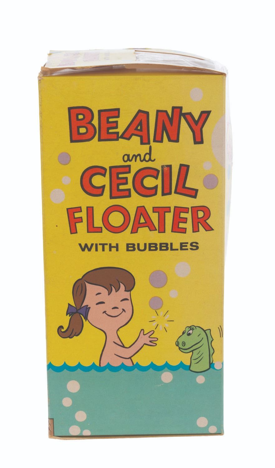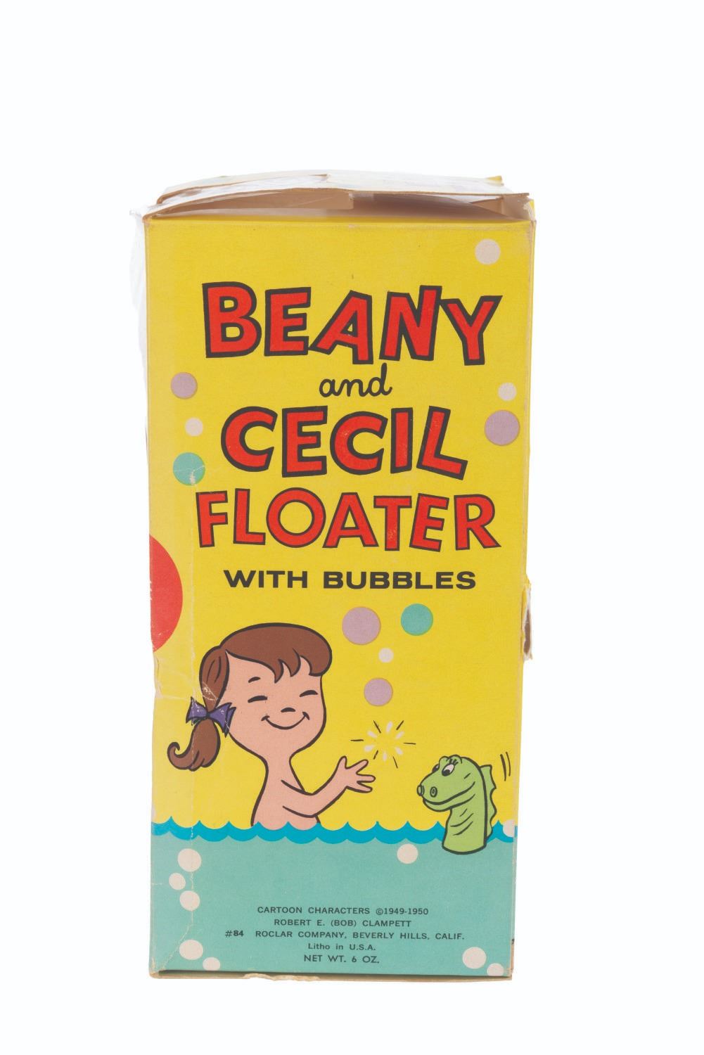 (Roclar, 1960s) A Beany & Cecil Floater with Bubbles toy. The figural Cecil container doubles as a floating bath toy when empty. Measuring 8” x 3” x 4.5” deep, the container is in fine as-new condition in the original 8” x 3.75” x 3.75” box which displays in good condition with handling wear, light creases, and a tear to the cellophane display window.