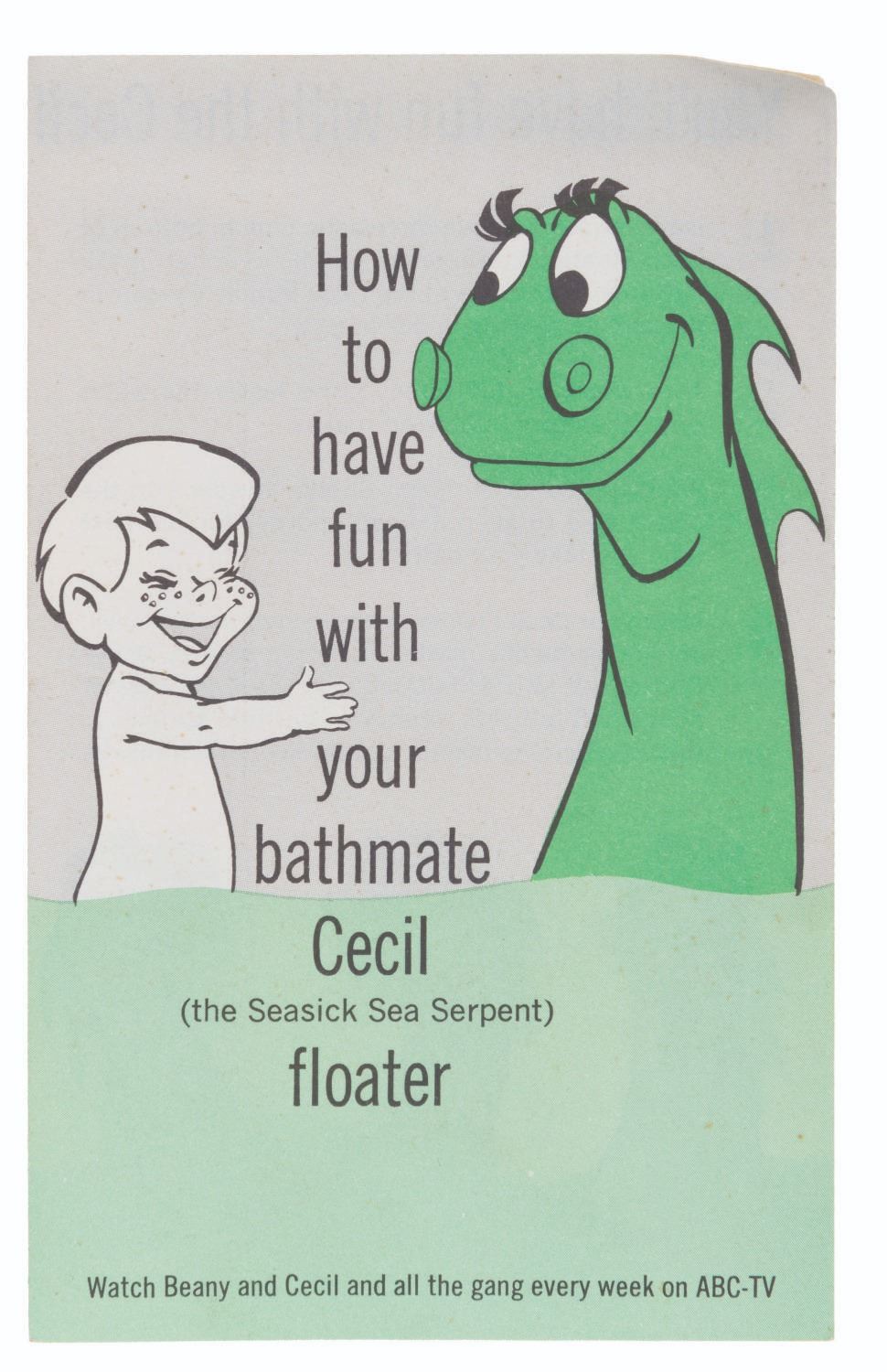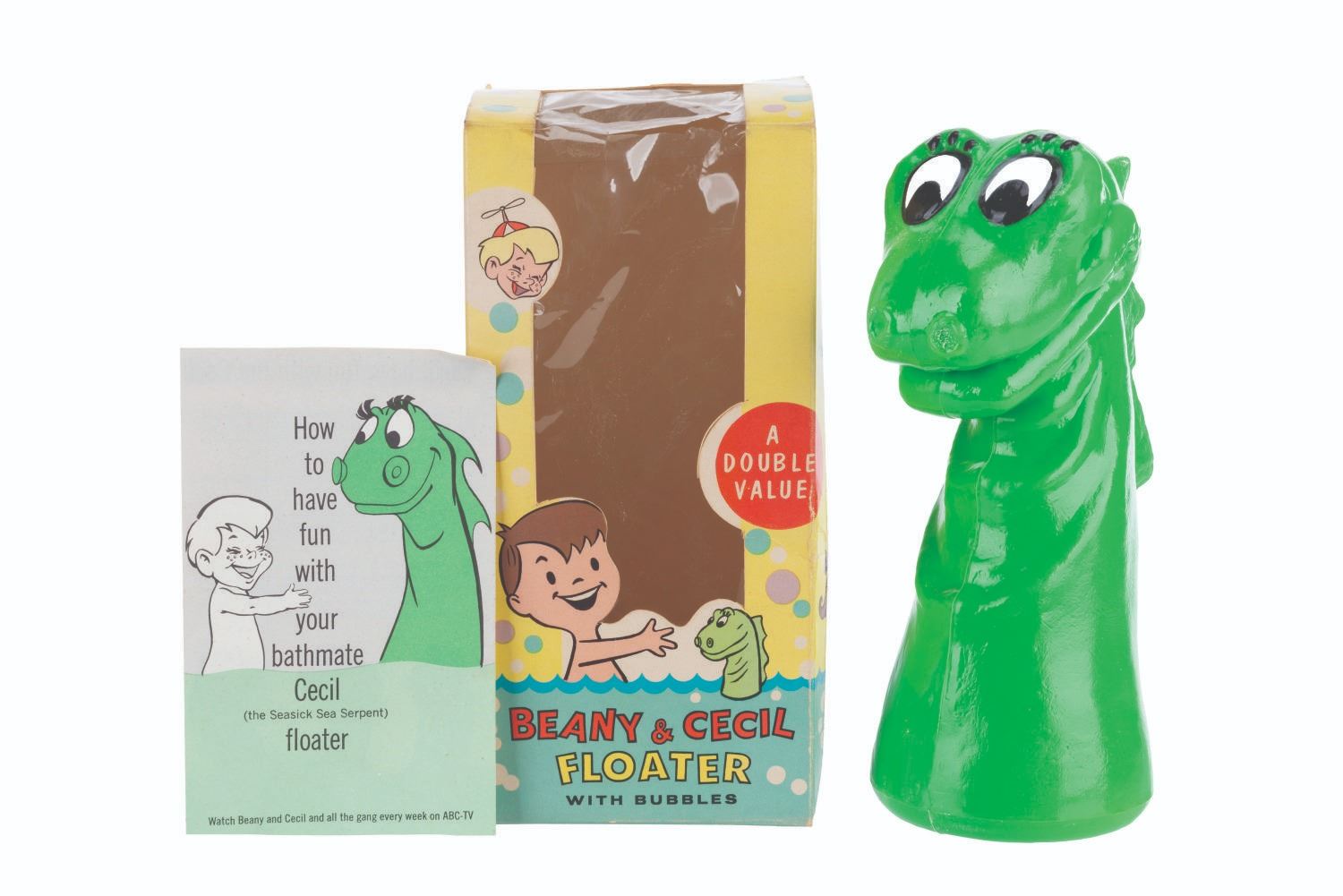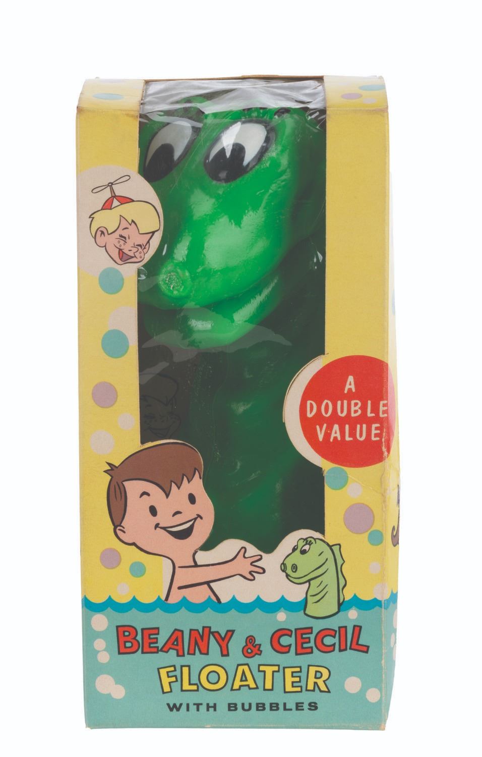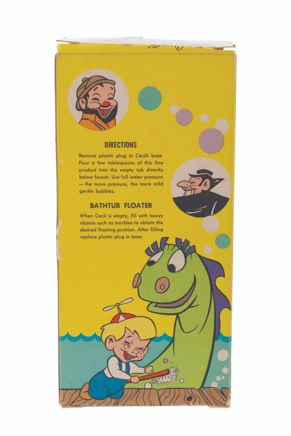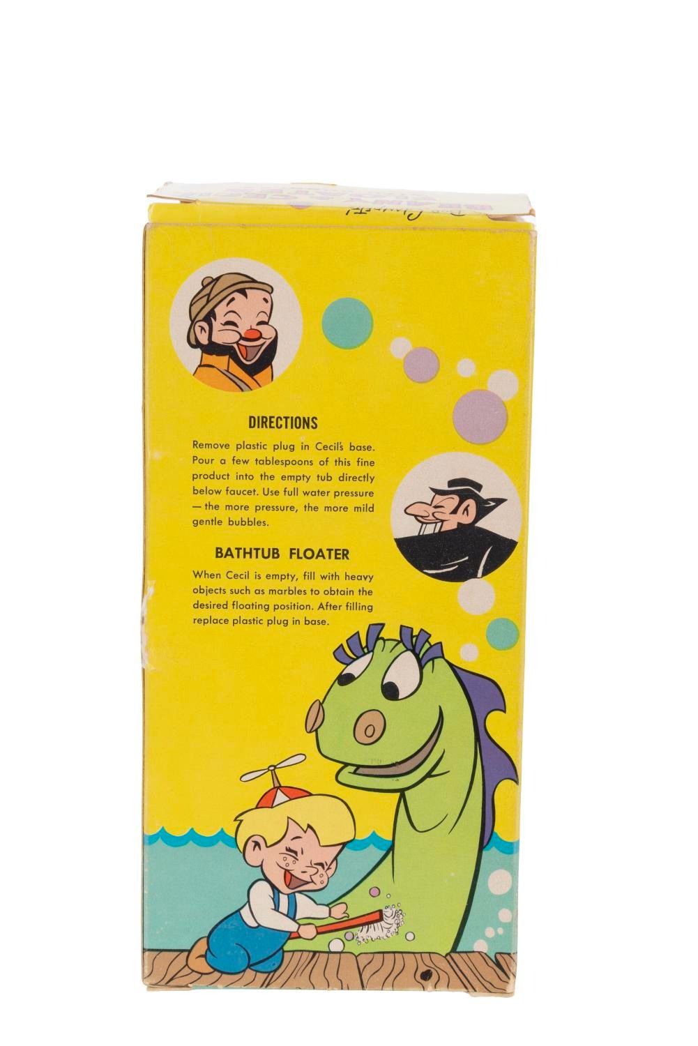 (Roclar, 1960s) A Beany & Cecil Floater with Bubbles toy. The figural Cecil container doubles as a floating bath toy when empty. Measuring 8” x 3” x 4.5” deep, the container is in fine as-new condition in the original 8” x 3.75” x 3.75” box which displays in good condition with handling wear, light creases, and a tear to the cellophane display window.