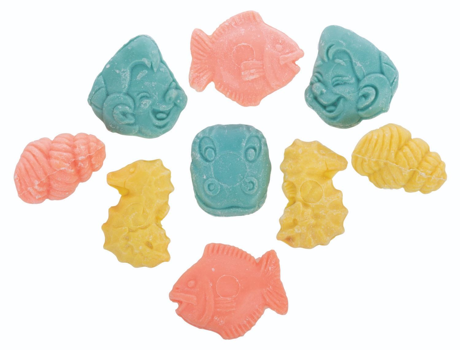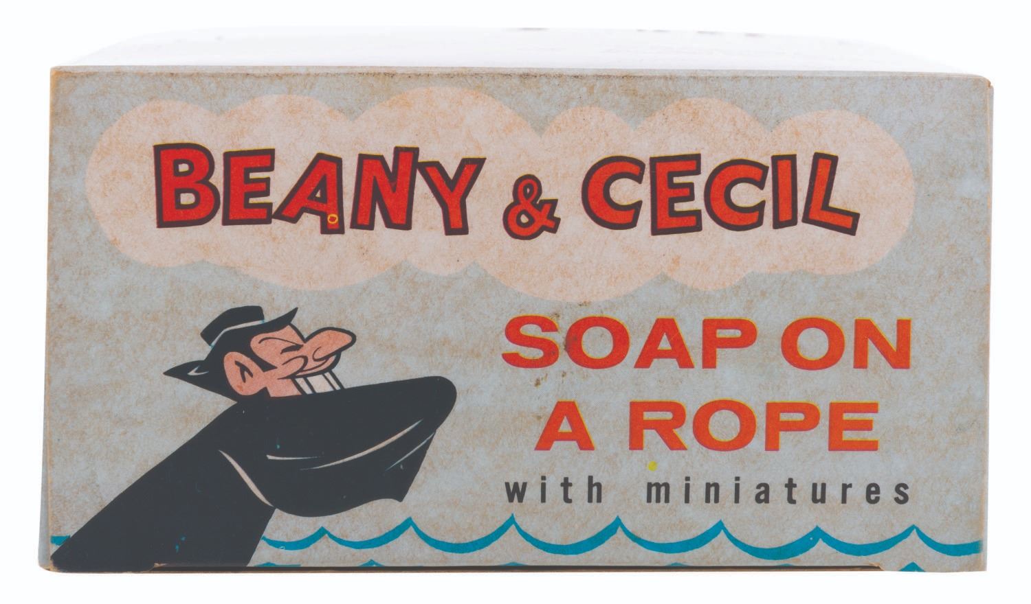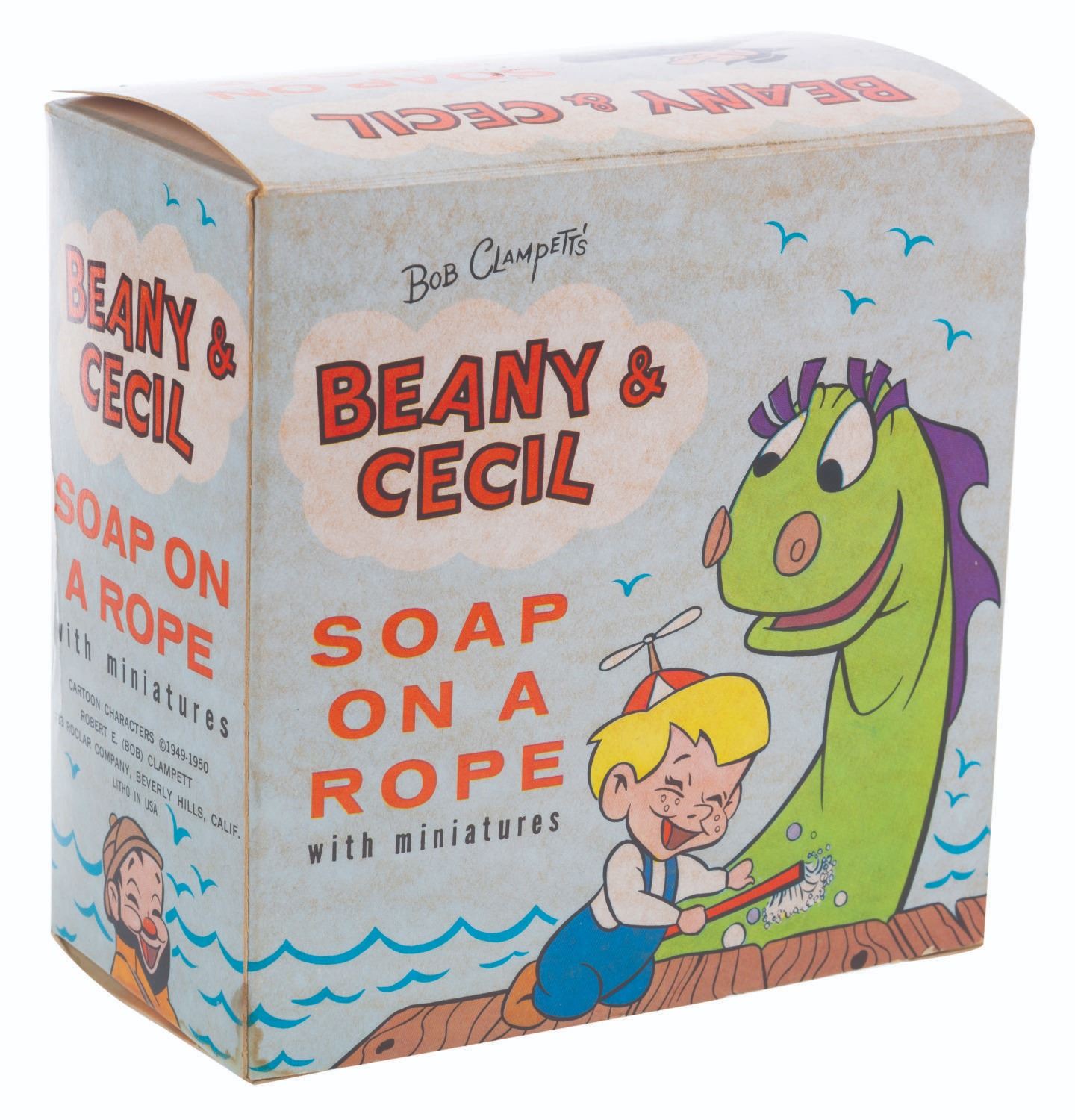 (Roclar, 1960s) A Bob Clampett’s Beany & Cecil Soap On a Rope with Miniatures set. Included with the set are one Cecil-shaped soap on a rope and 9 small bars of sea-themed soaps. Ranging in size from 1.5” x 1.5” x 0.25” thick to 4” x 2.5” x 2.5” thick, the soaps are in very good, unused condition with a slight area of wear and discoloration to the front of the larger Cecil soap. The soaps come with the original 5” x 5” x 2.5” box, in very good condition with light discoloration from age.