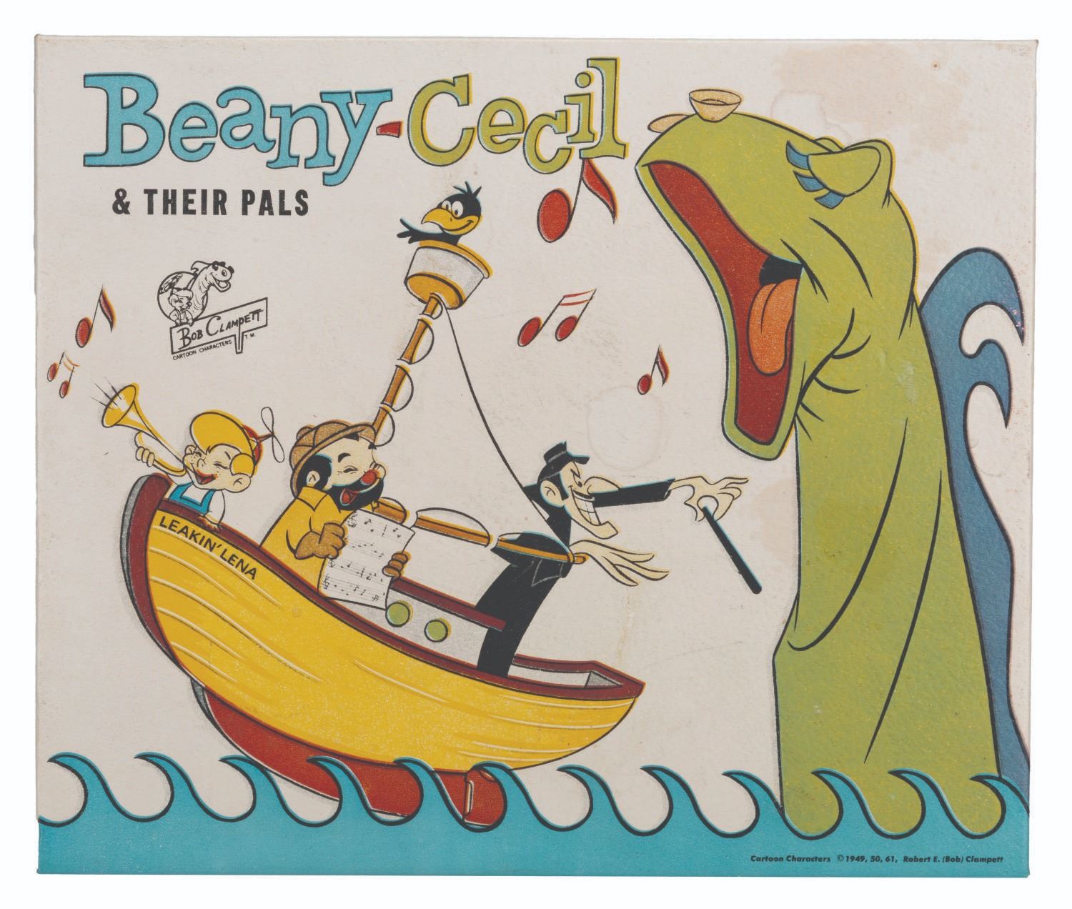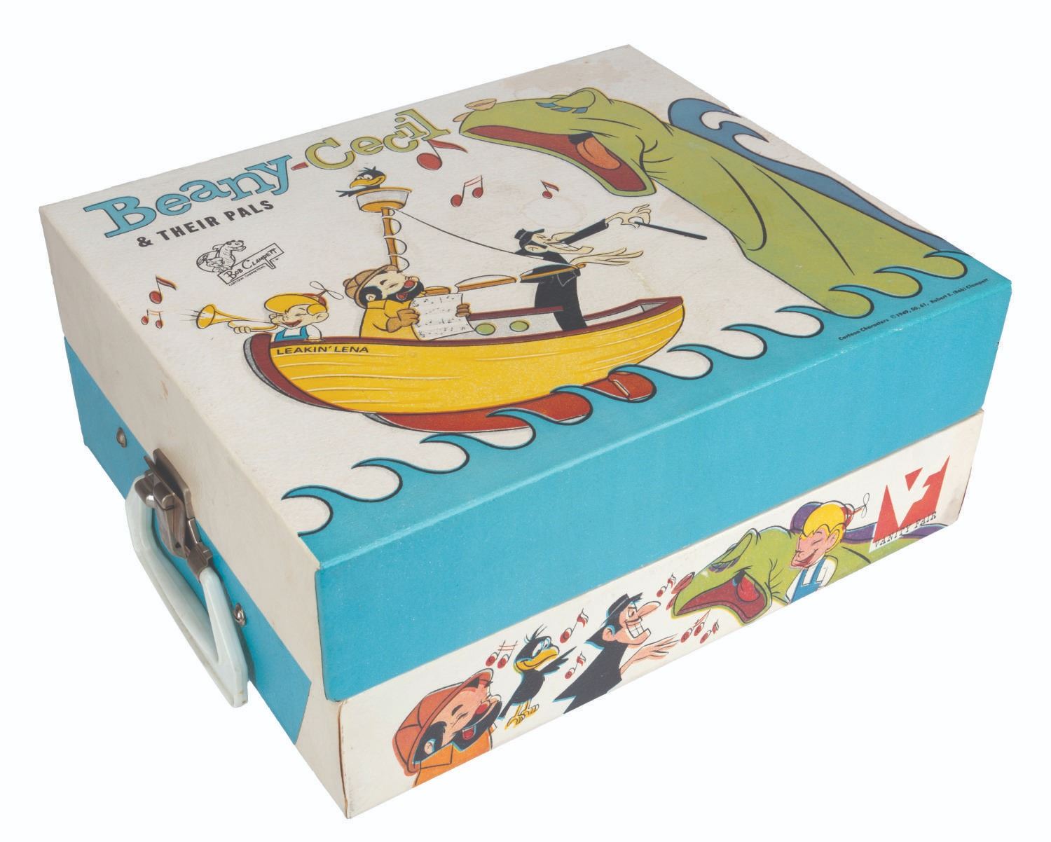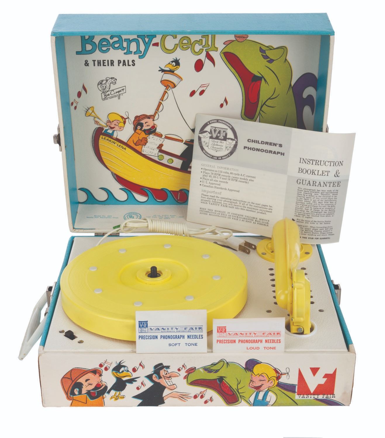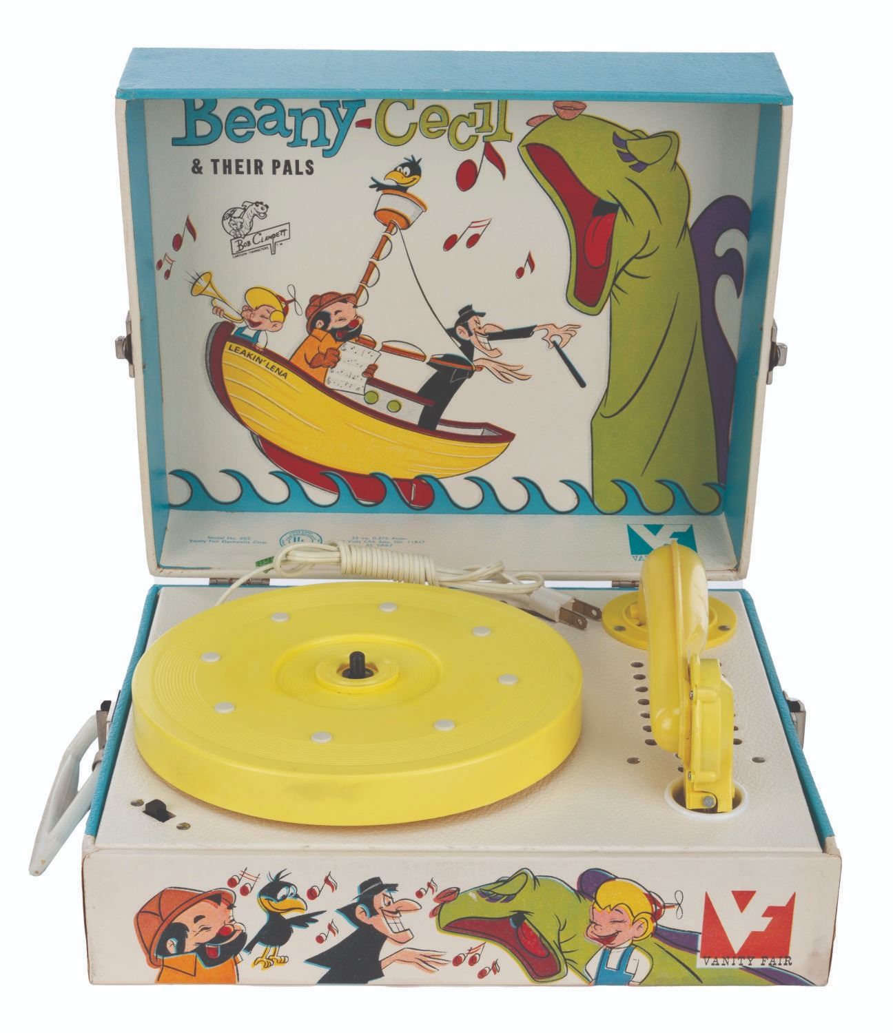 (Vanity Fair, 1960s) A Beany-Cecil & Their Pals phonograph featuring the cast of “Beany and Cecil,” with instructions and two sealed packages of needles. The phonograph appears unused but does not function when tested. Measuring 10.5” x 12” and 5” tall, the piece displays in very good condition with light stains to the top lid and water damage to the bottom right side and back right corner.