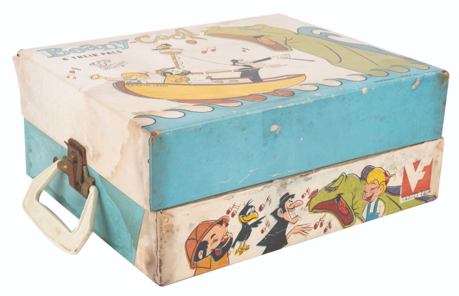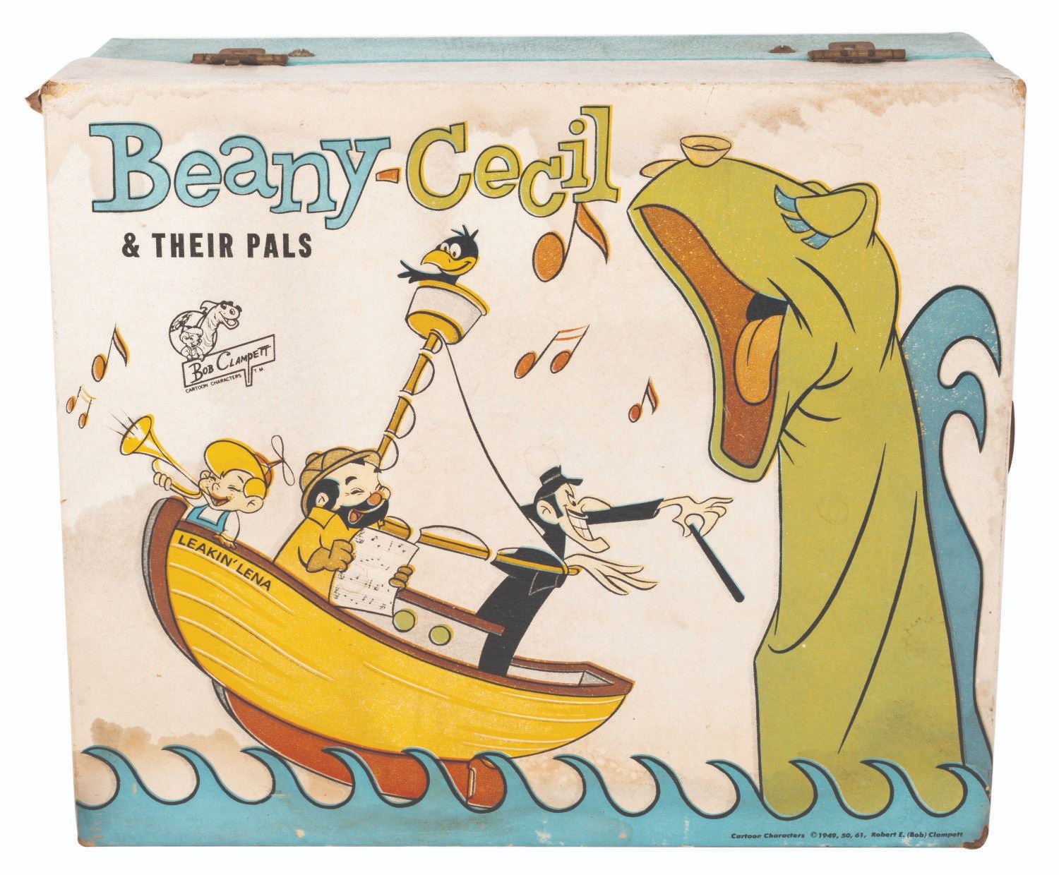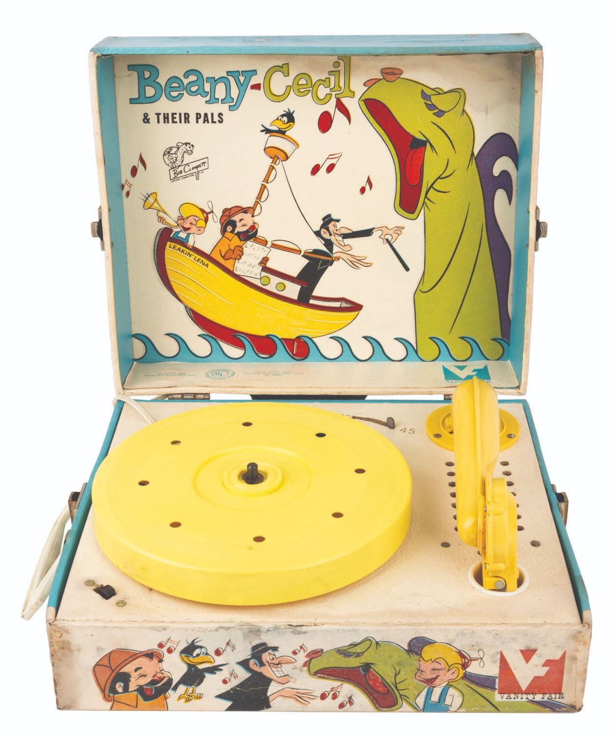 (Vanity Fair, 1960s) A Beany-Cecil & Their Pals phonograph featuring the cast of Bob Clampett’s “Beany and Cecil.” The phonograph does not have a needle and the motor did not function when tested. Measuring 10.5” x 12” x 5” tall, the piece is in poor condition with heavy stains, faded colors, and oxidization to the metal latches.