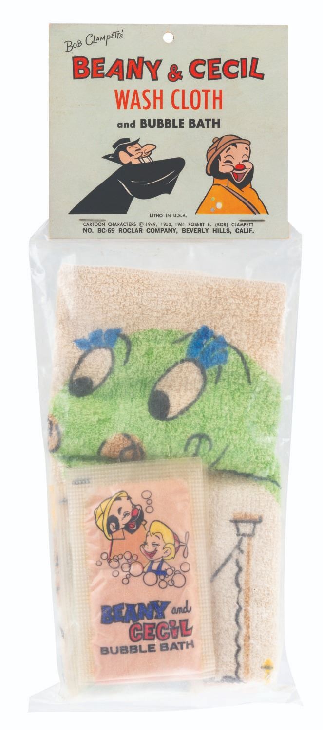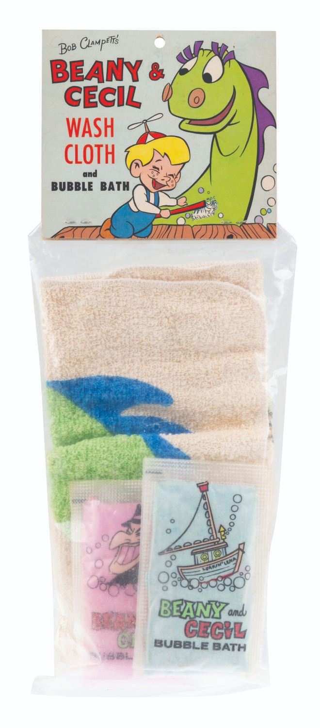 (Roclar, 1961) An unopened Bob Clampett’s Beany & Cecil Wash Cloth and Bubble Bath set. Included are eight individually packaged bubble baths and a washcloth featuring the stars of “Beany and Cecil.” Measuring 5” x 13”, the unopened set is in very good condition with discoloration from age.