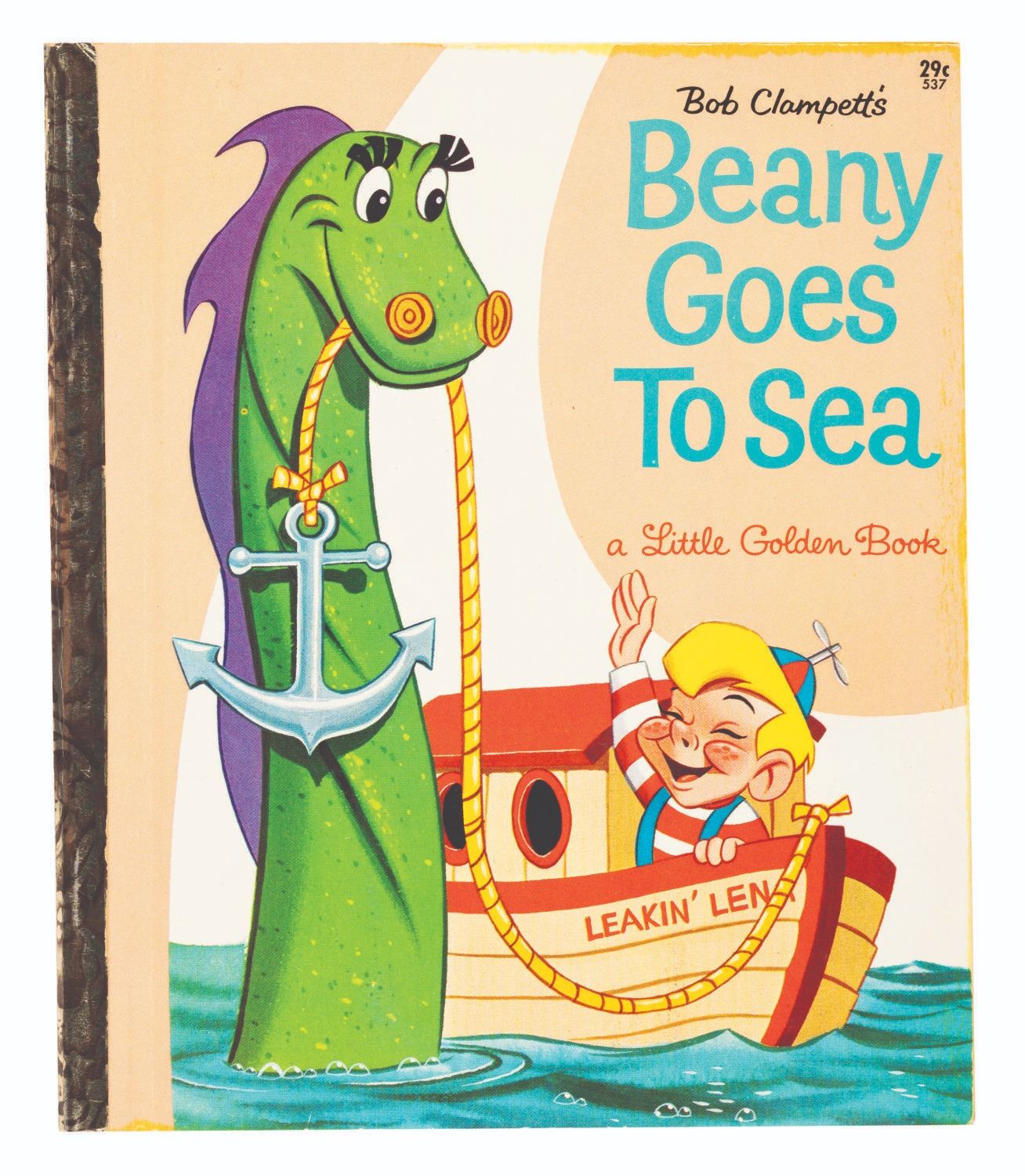 (Western Publishing, 1963) A “Beany Goes to Sea” Little Golden Book featuring Beany and Cecil. Measuring 8” x 6.75”, the book is in very good condition, with typical light wear from handling and age, and a spot of wear to the back bottom edge near the spine.