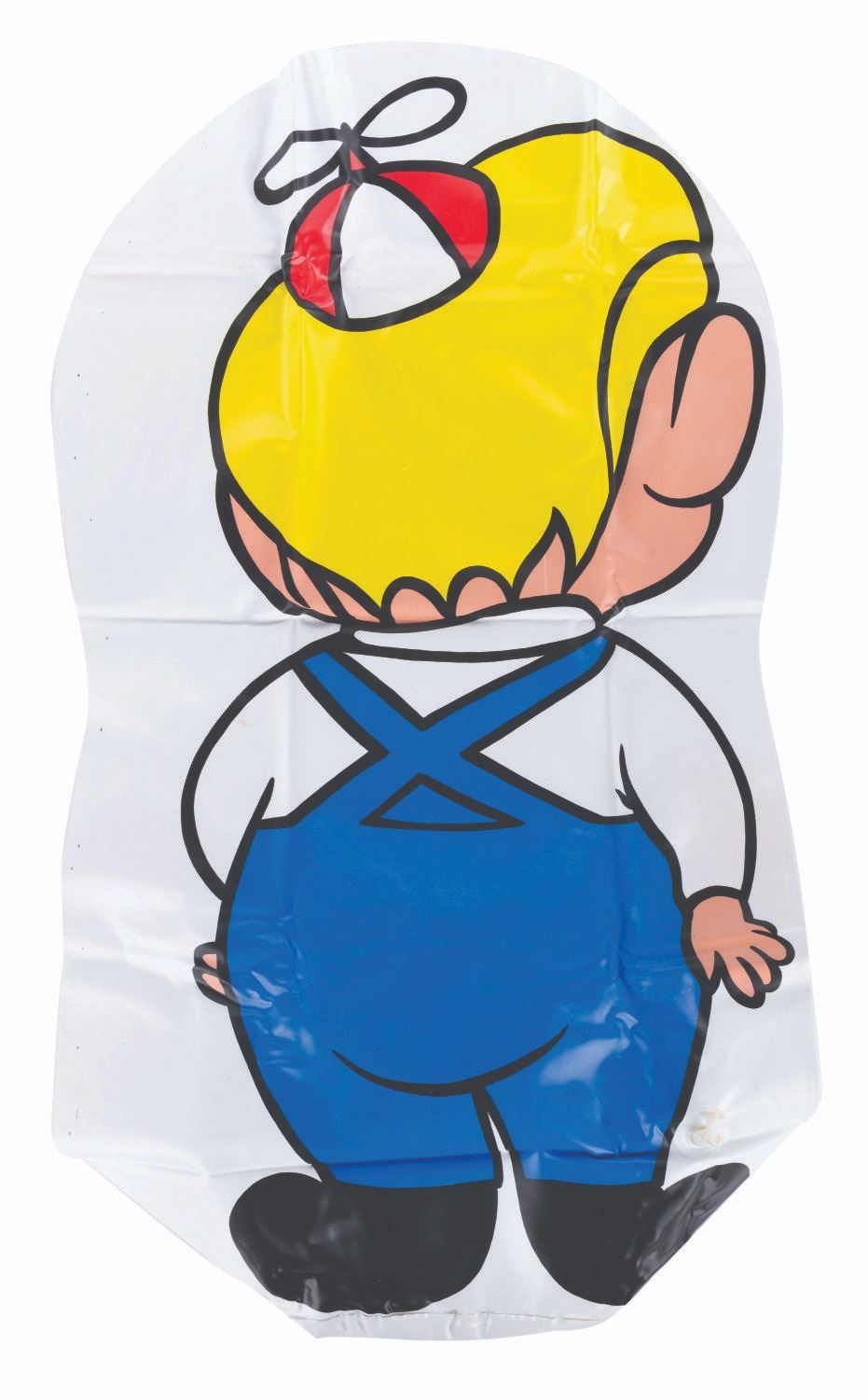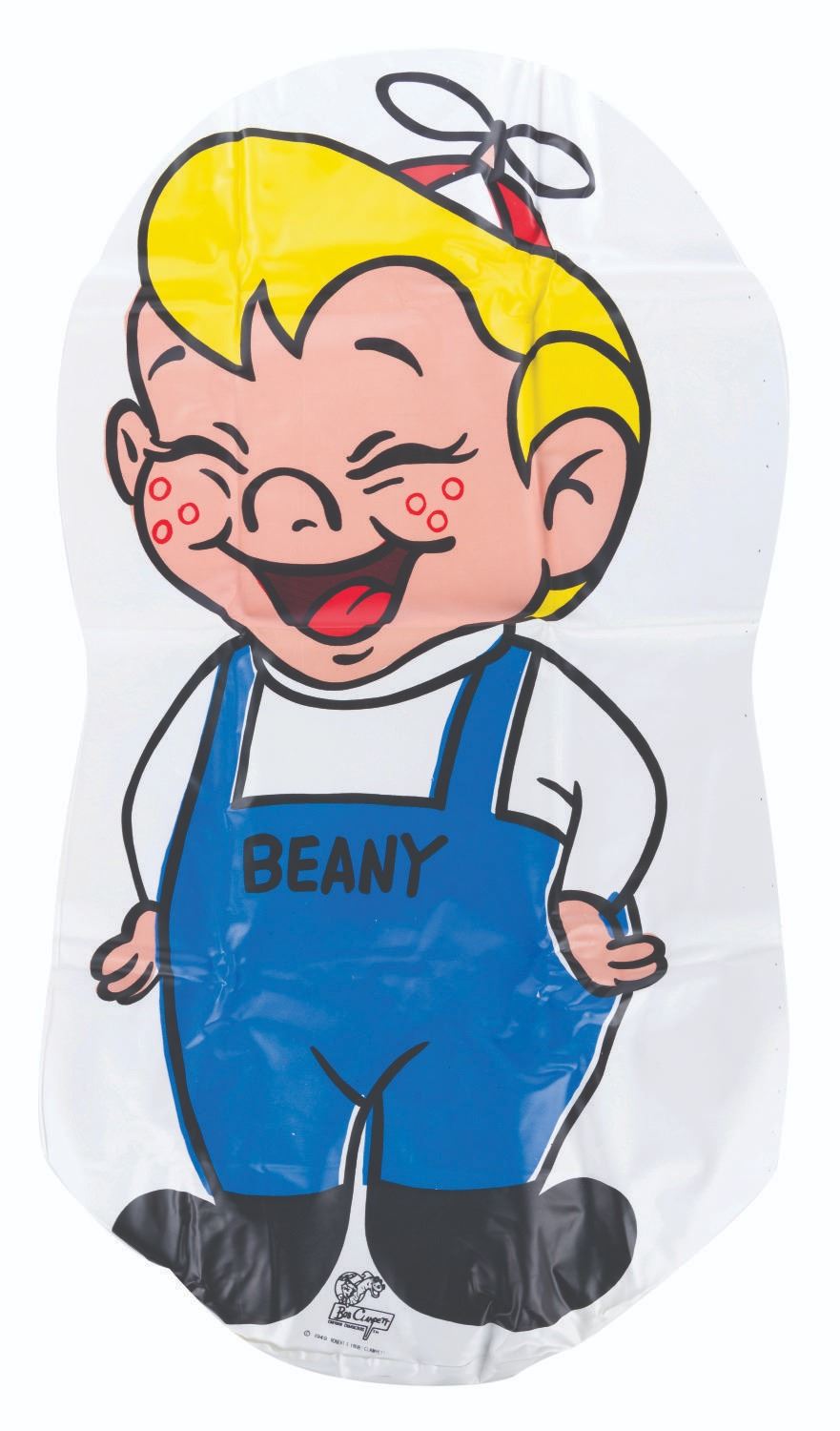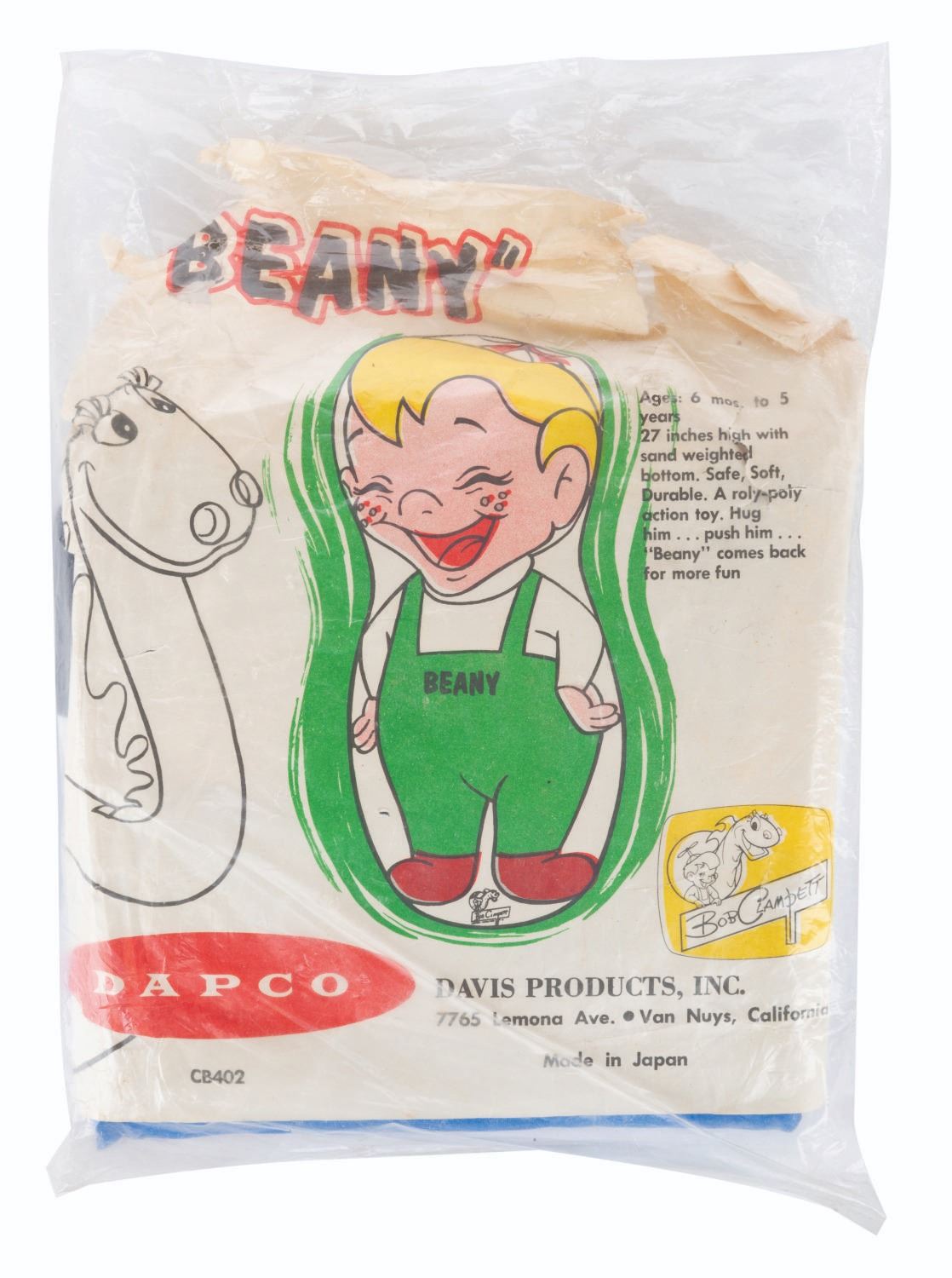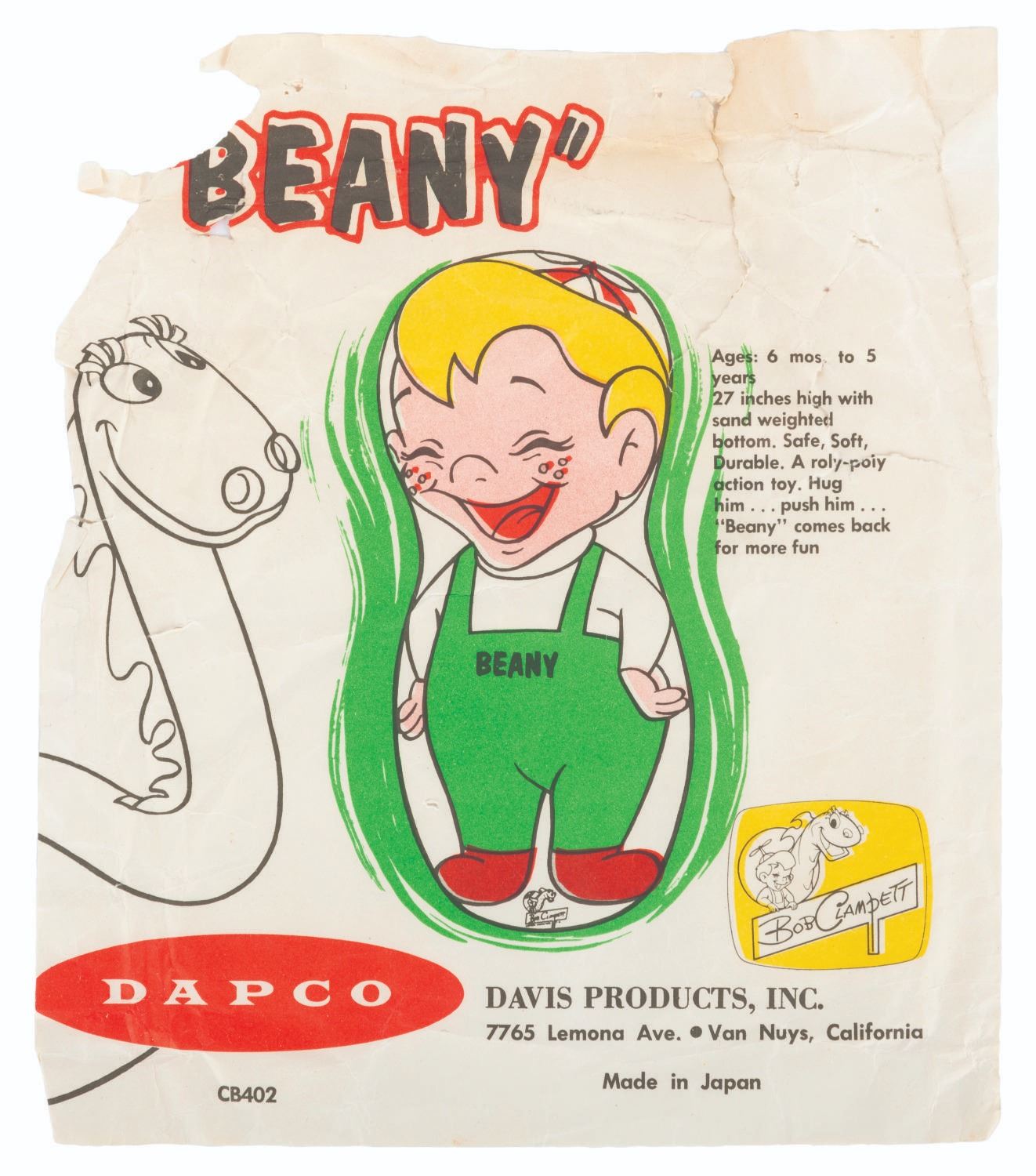(Dapco, 1950s-60s) A Beany inflatable toy weighted with sand in the bottom, so he’d bounce back when pushed. The package describes the toy as 27” tall. The vinyl toy appears in very good to fine condition, slightly tacky to the touch, and has not been tested for inflatability. The envelope and product paper measuring 8” x 10” overall are in fair condition, with much handling wear, and tears and creases to the top of the paper.