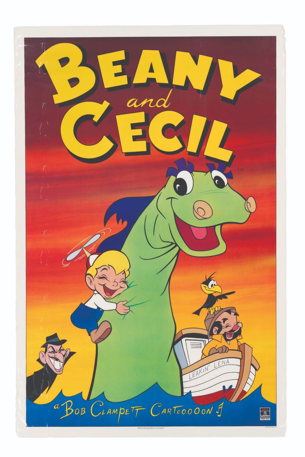 (Columbia Home Video, 1984) A poster for the original home video release of “Beany and Cecil” on videotape in 1984. Measuring 27” x 41”, the poster is in fair condition with heavy edge wear, small creases throughout, and larger creases down the left side.