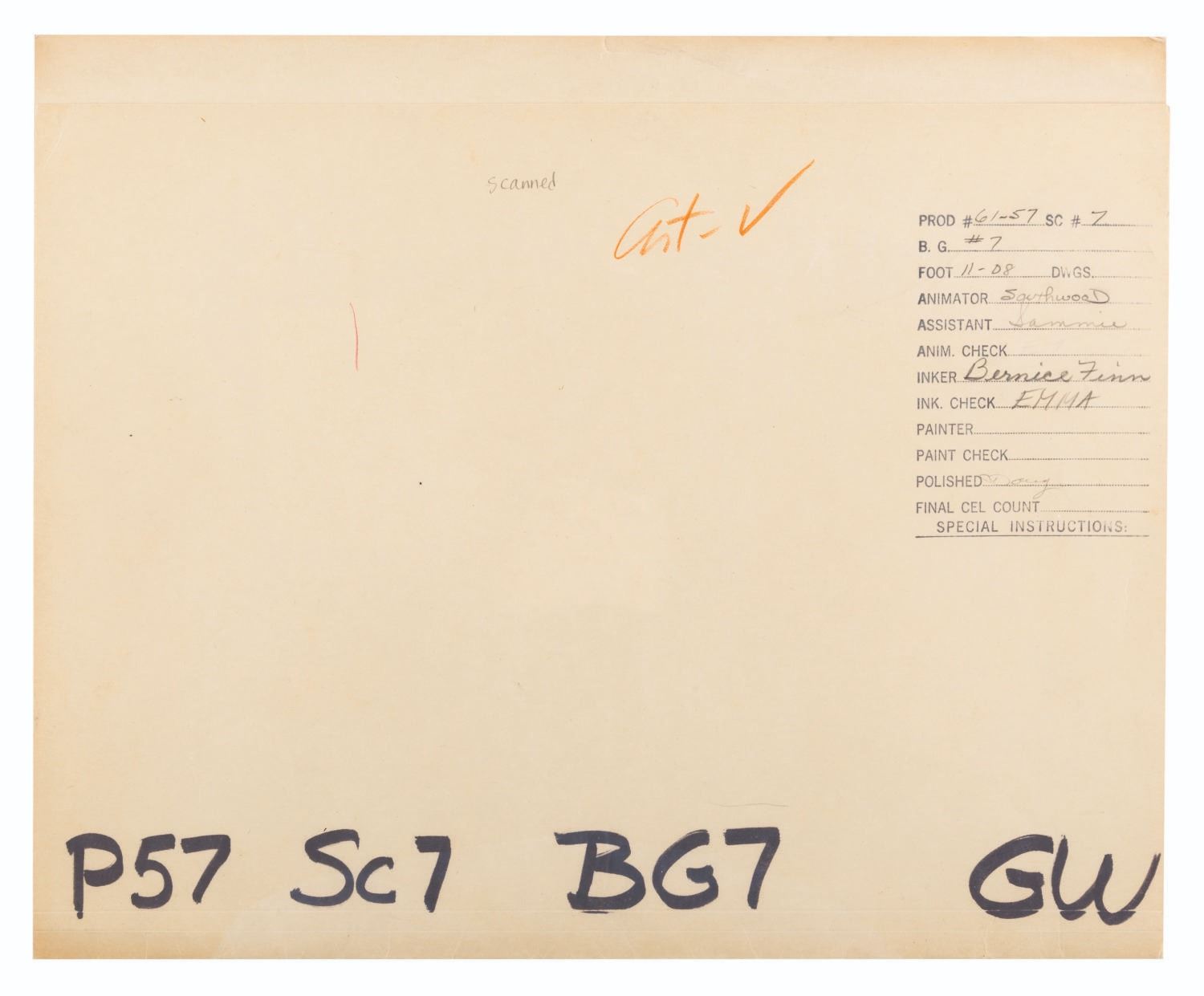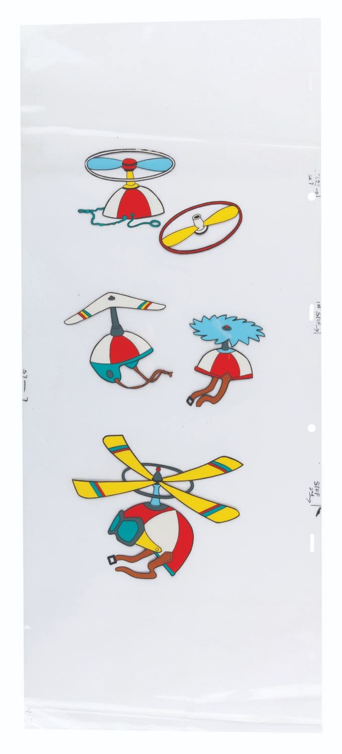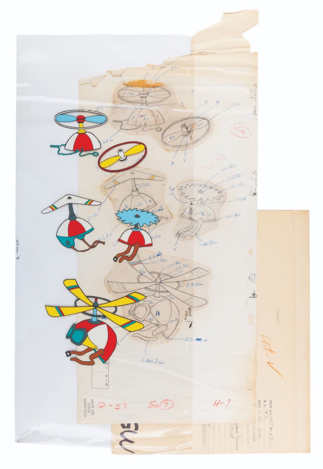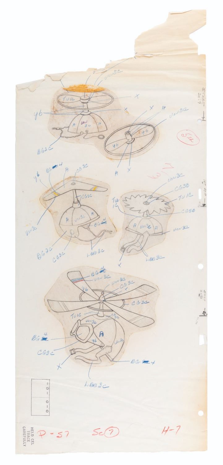 (Clampett, 1962) An original production cel and matching drawing of Beany’s propellor hats from the “Beany and Cecil” episode “Beany’s Beany-Cap Copter." Measuring 25” x 10” each, the cel is in good condition with horizontal folds, curling, and rips, and the drawing is in fair condition with separation to the paste-ups from age, paper discoloration, edge wear, and tears.