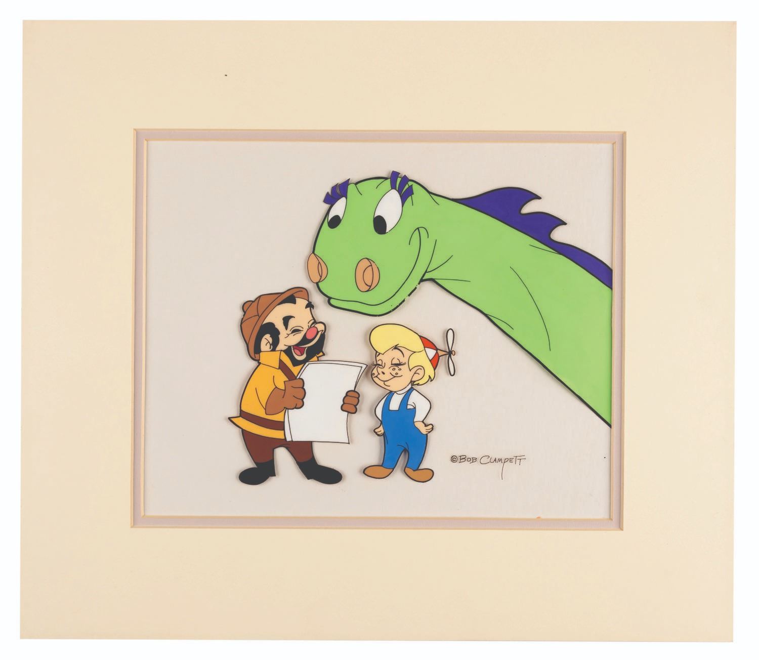 (Clampett, 1962) An original production-used color model cel from “Beany and Cecil,” hand-labeled “BG Dept Model” in marker under the matte. With a character image size of 9” x 7” on a 10.5” x 11.5” visible cel, presented in a 14” x 16” matte with an 8.5” x 10.5” opening, the piece displays in very good condition with light line loss to Cecil’s chin.