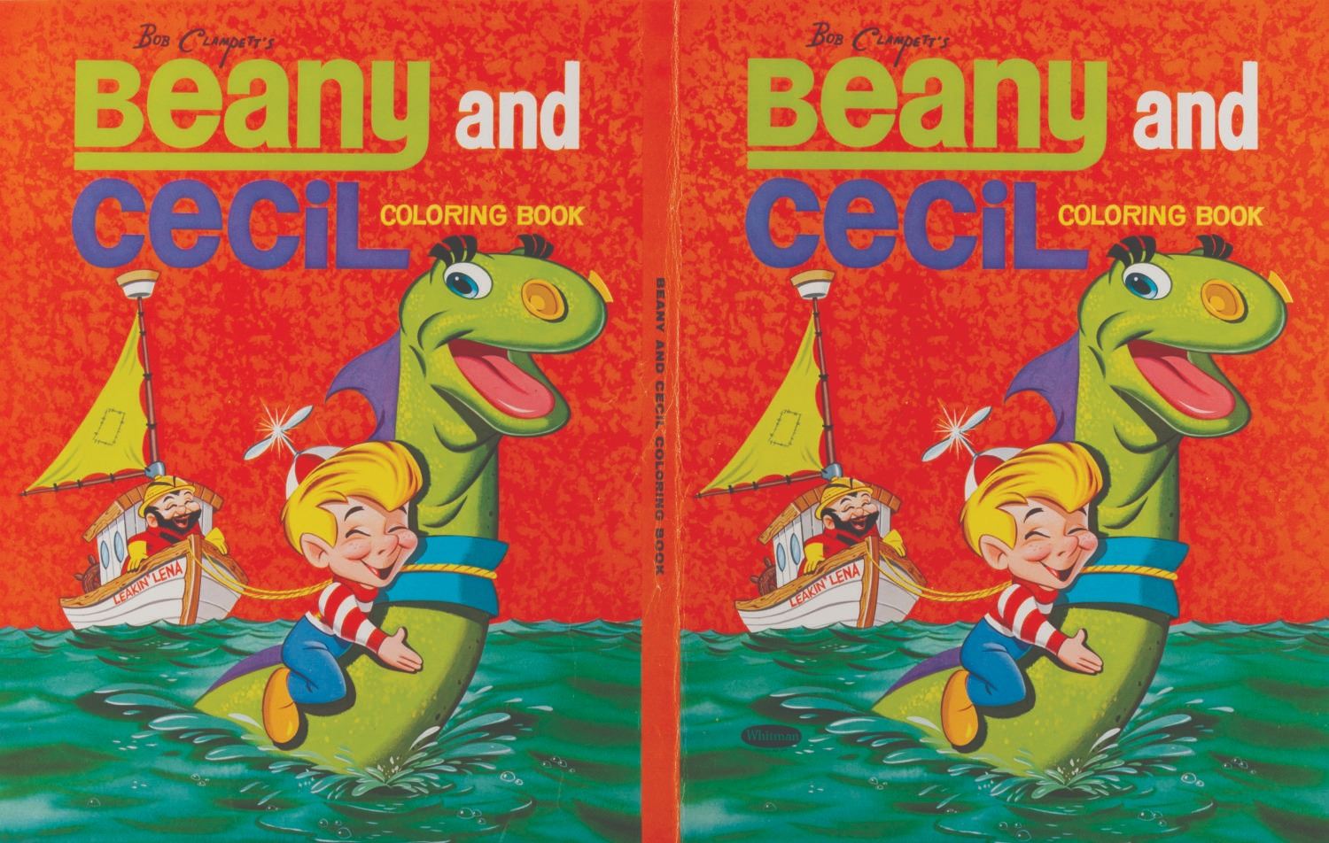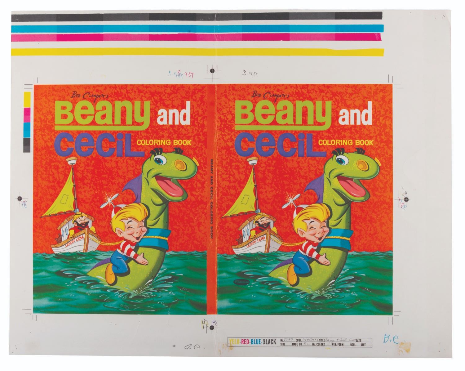 (Clampett, 1960s) A test print for the cover of a Bob Clampett’s “Beany and Cecil” coloring book. Measuring 17” x 21”, the print is in good condition with pinholes, edge wear, creasing, a vertical fold down the center, spots of adhesive residue, and light discoloration from age.
