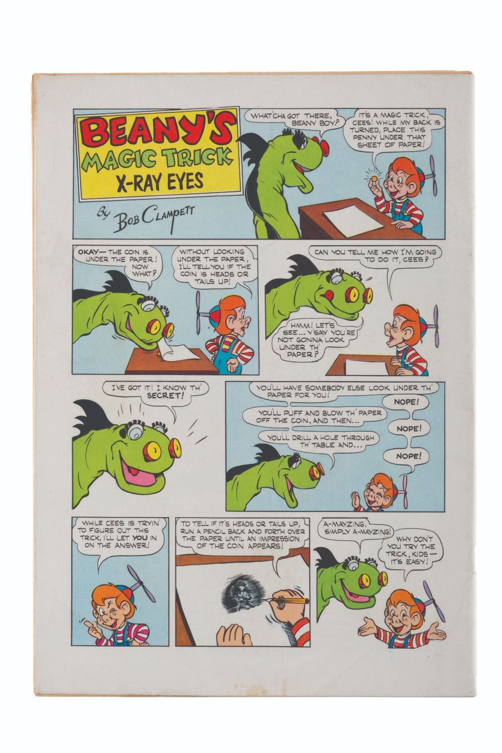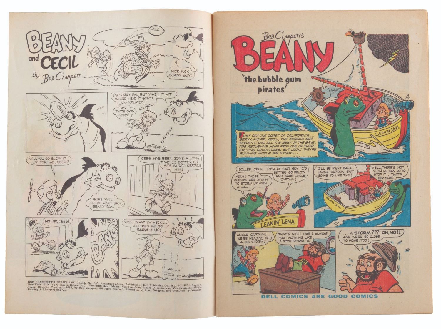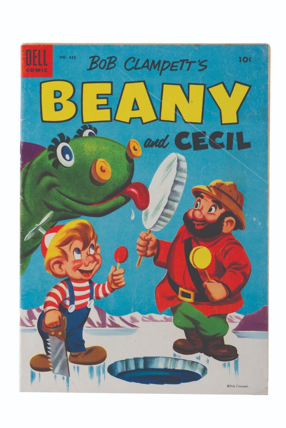 (Dell, 1955) An issue of Dell Four Color Comics # 635 featuring Beany and Cecil. Measuring 7.5” x 10.5”, the comic book is in good condition with a crease to the front cover, light soiling, wear to the spine including small creases, and a spot of discoloration to the corner of several pages.