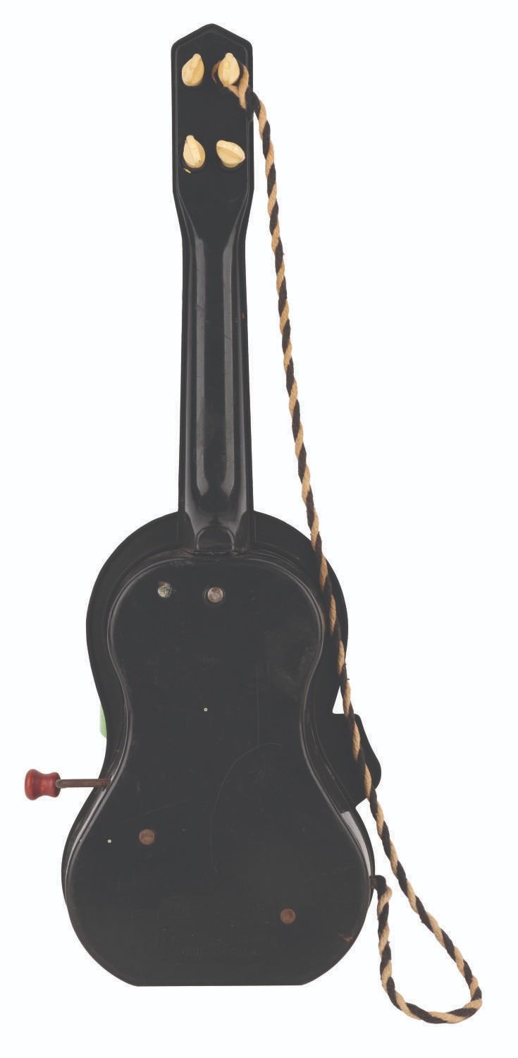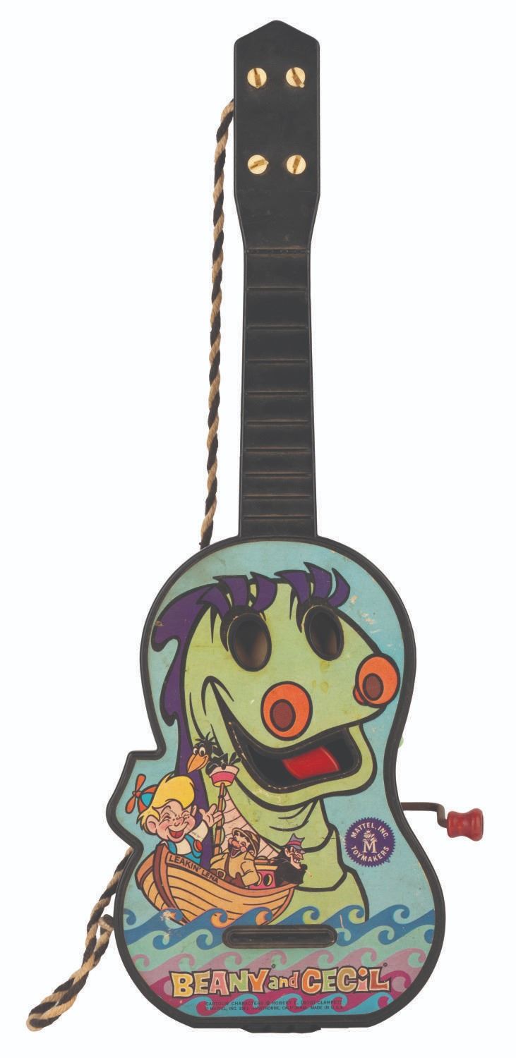 (Mattel, 1961) A wind-up “Beany and Cecil” Ge-tar by Mattel featuring Beany, Cecil, Crowy, Capt. Huffenpuff, and Dishonest John. The toy’s crank-operated music box function, wagging tongue, and eye-moving features did not work when tested. Measuring 5” x 1.5” x 14” long, the toy guitar is in fair condition missing strings, its eyes loose inside, scuffs, stains, wear, and discoloration from use.