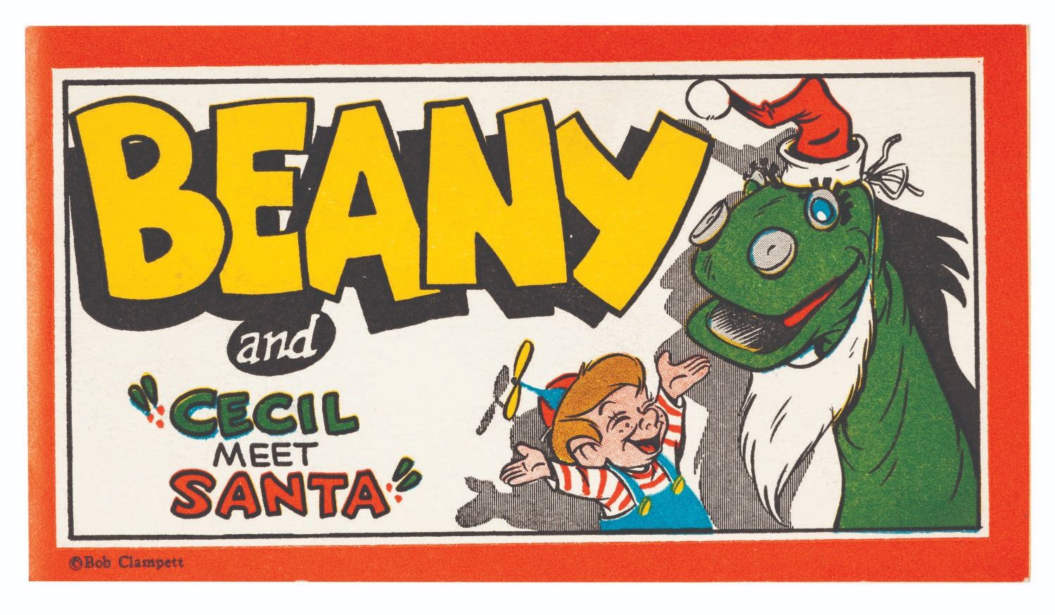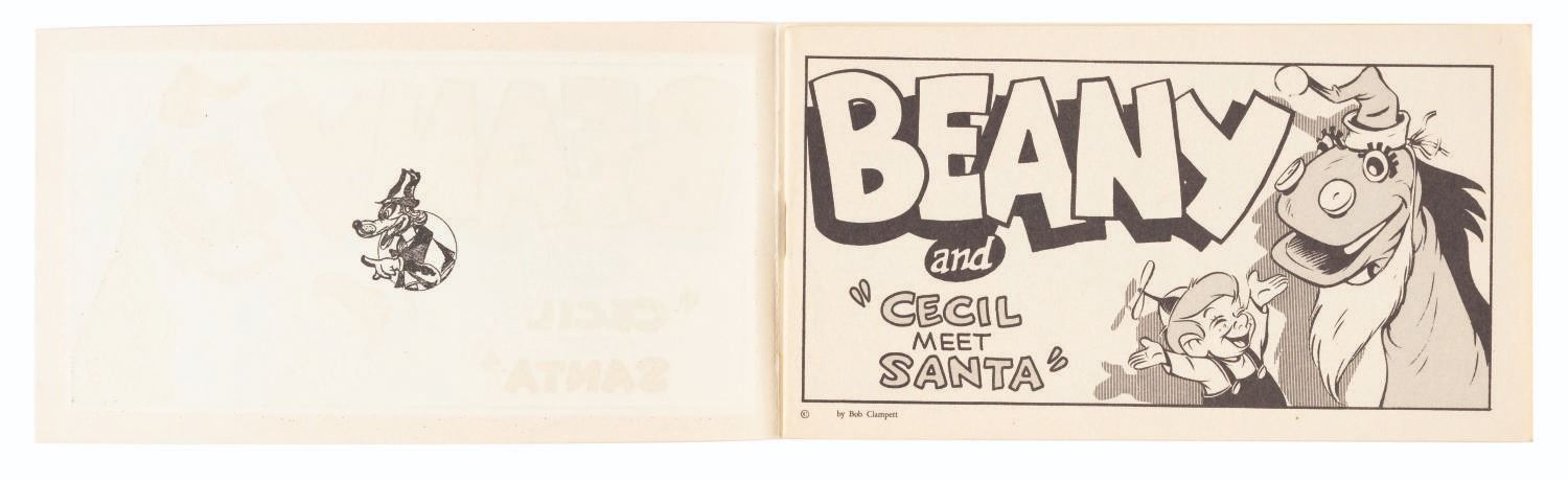 (Clampett, 1950s-60s) A Beany and Cecil Meet Santa comic book. The black and white comic with a full-color cover, tells the story of Cecil rescuing Santa from Dishonest John and saving Christmas for Beany. Measuring 3.5” x 6”, the comic book is in very good condition with a detached cover and light wear.
