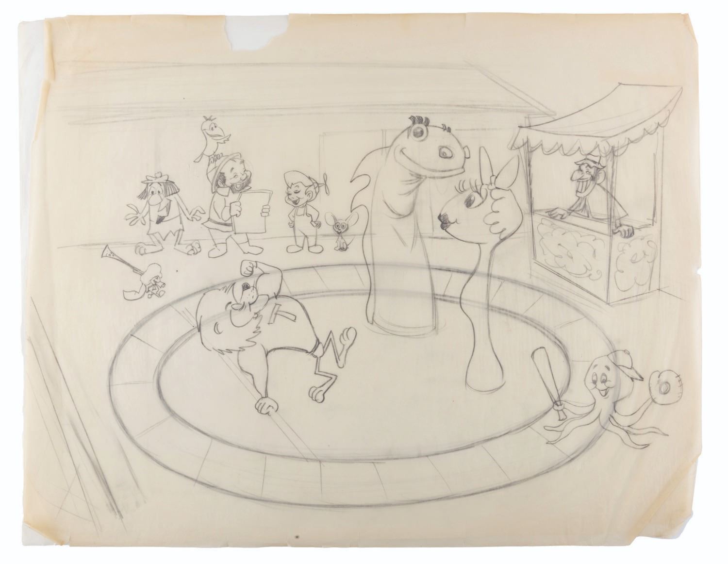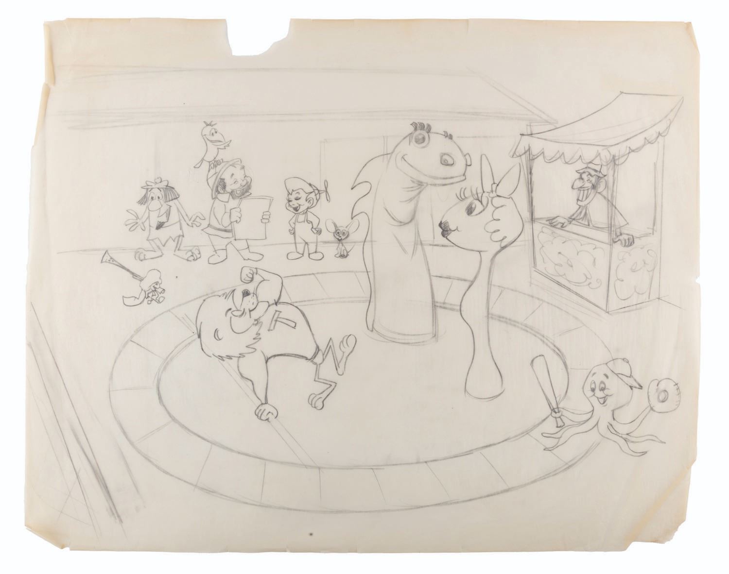 (Clampett, 1960s) A drawing by Bob Clampett of his “Beany and Cecil” characters poolside used to create a layout for a TV guide photoshoot in Clampett’s own backyard. In the TV Guide article from 1962, the Clampetts are pictured swimming alongside Beany, Cecil, Dishonest John, Captain Huffenpuff, Crowy, and secondary characters, Tear-A-Long the Dotted Lion, Careless the Mexican Hairless, Cecilia, and Go Man Van Gogh. With an image size of 16.5” x 23” on 19” x 23.75” vellum, the graphite drawing is in good condition with creases, wear, corner folds, and edge tears, including a 1.5” x 2.5” tear near the top left.