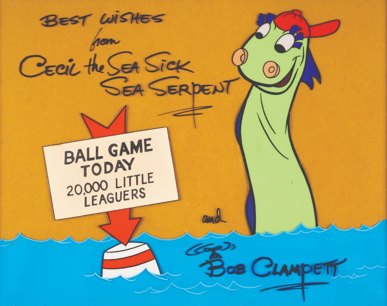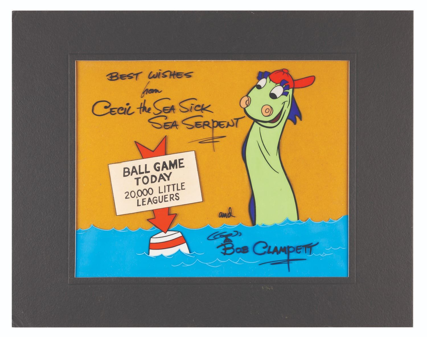 (Clampett, 1962) An original “Beany and Cecil” hand-painted production cel of Cecil from the episode “20,000 Little Leaguers Under the Sea,” signed by Bob Clampett. Measuring 7.5” x 9.5” in an 11” x 14” matte, the cel displays in fine condition.