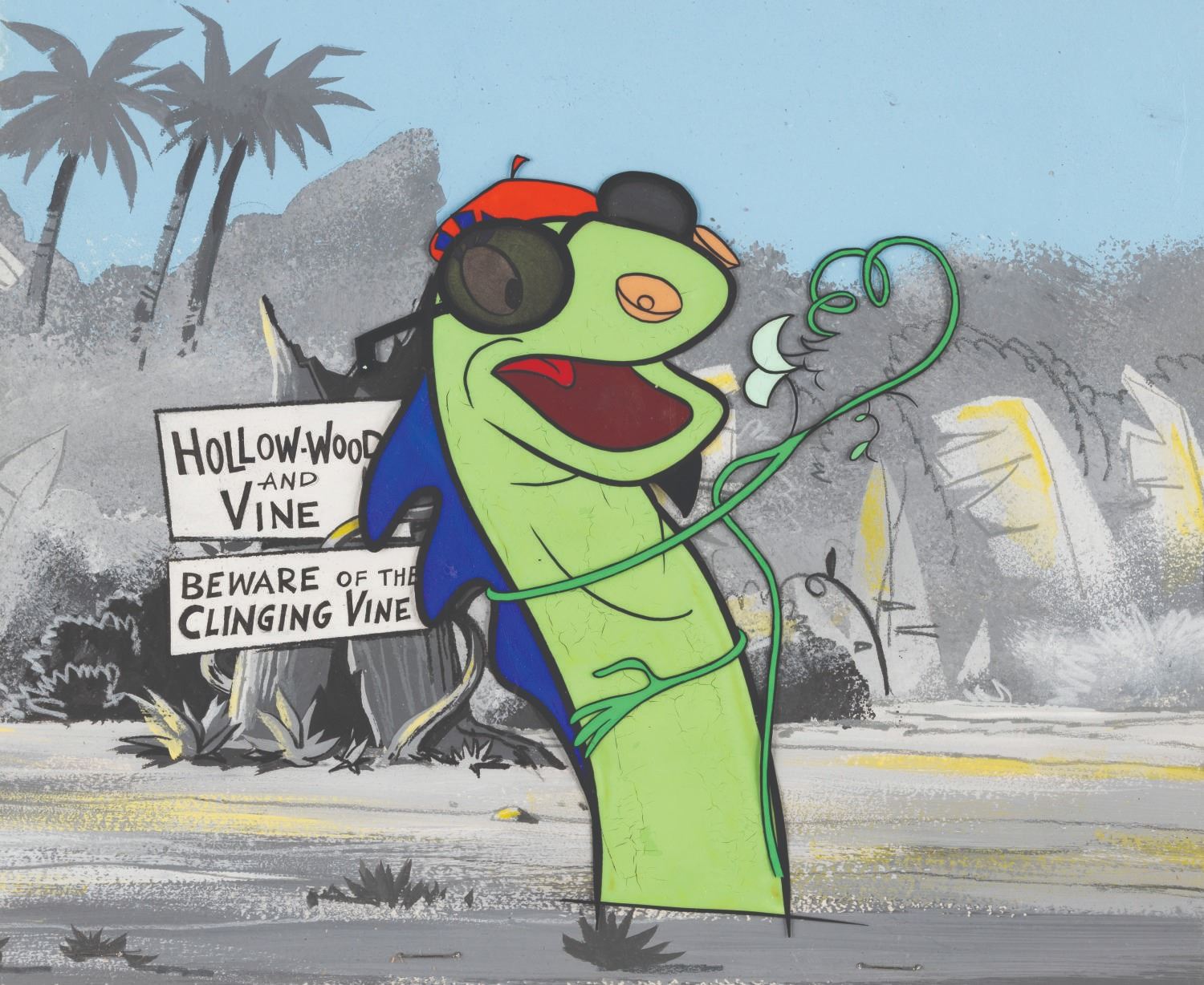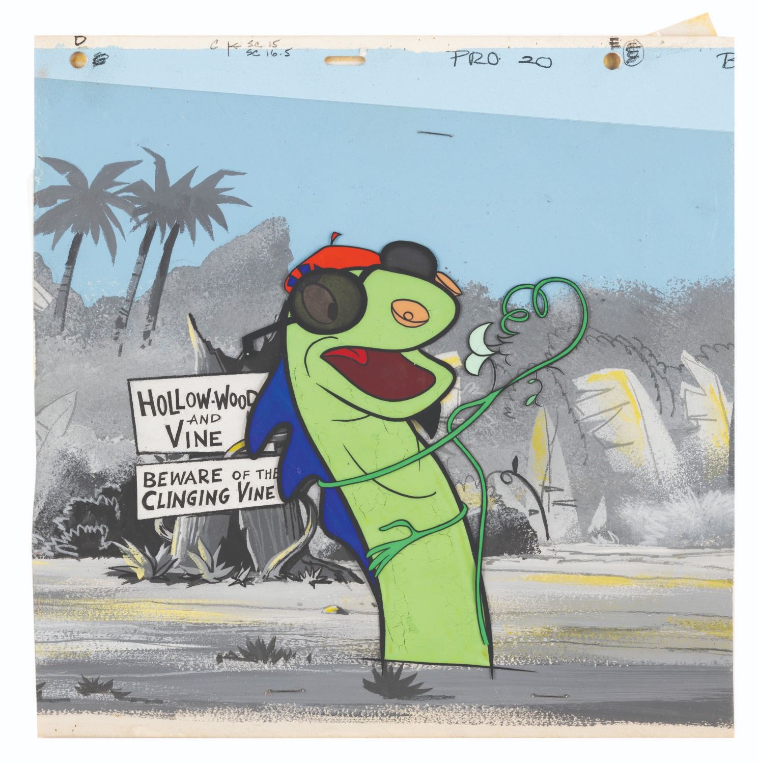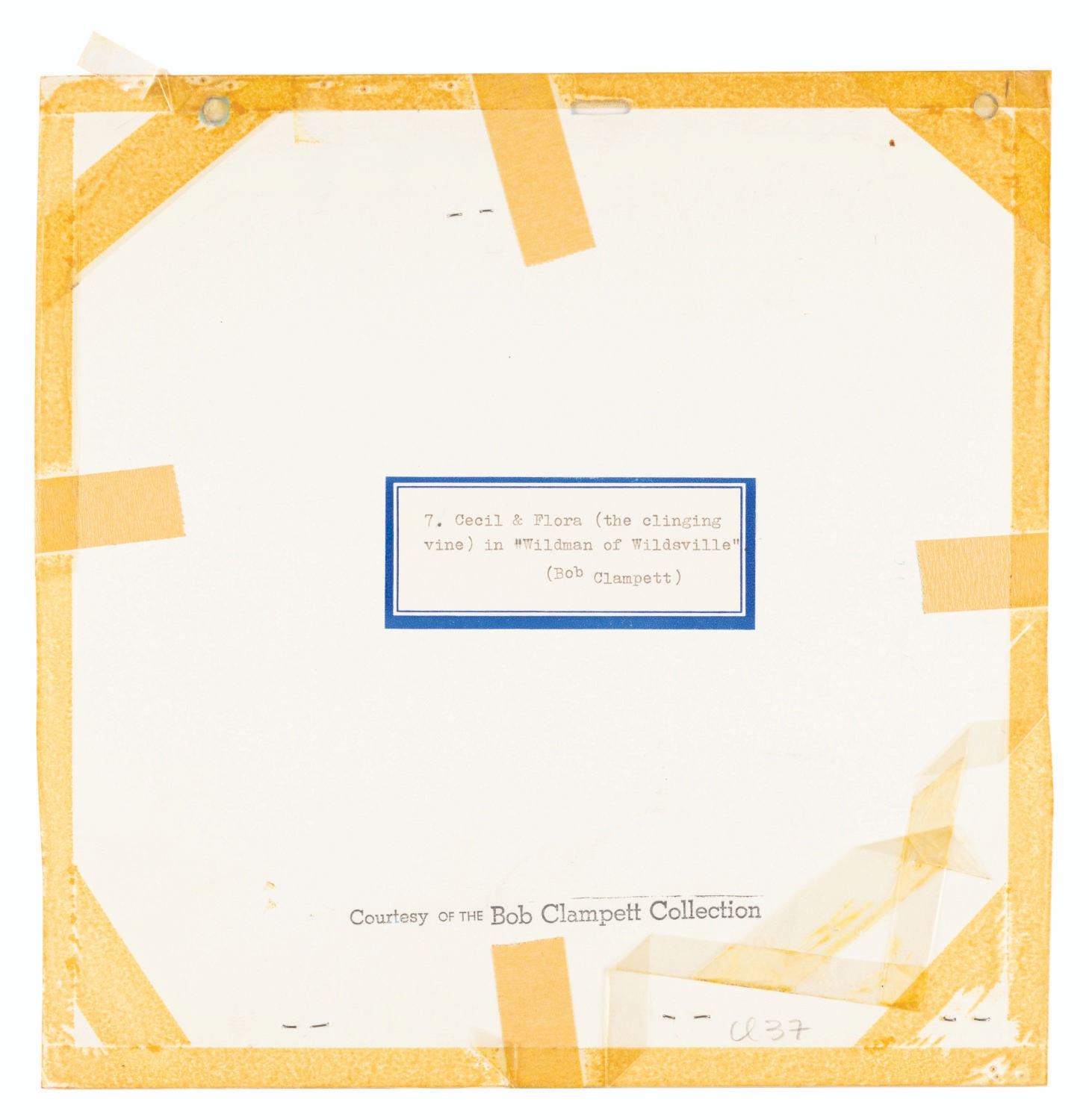 (Clampett, 1962) An original multi-layer production cel of Cecil and Flora from the “Beany and Cecil” episode, “The Wildman of Wildsville.” The cel has been paired with a background from the same episode. With a character image size of 6.5” x 5.25” on a trimmed 9.75” x 10.5” cel and 10.5” x 10.5” background, the piece is in good to very good condition with paint wear to Cecil’s body, and pinholes, and edge wear to the background. The cel has been stapled twice along the bottom and once to the top attaching it to the background.