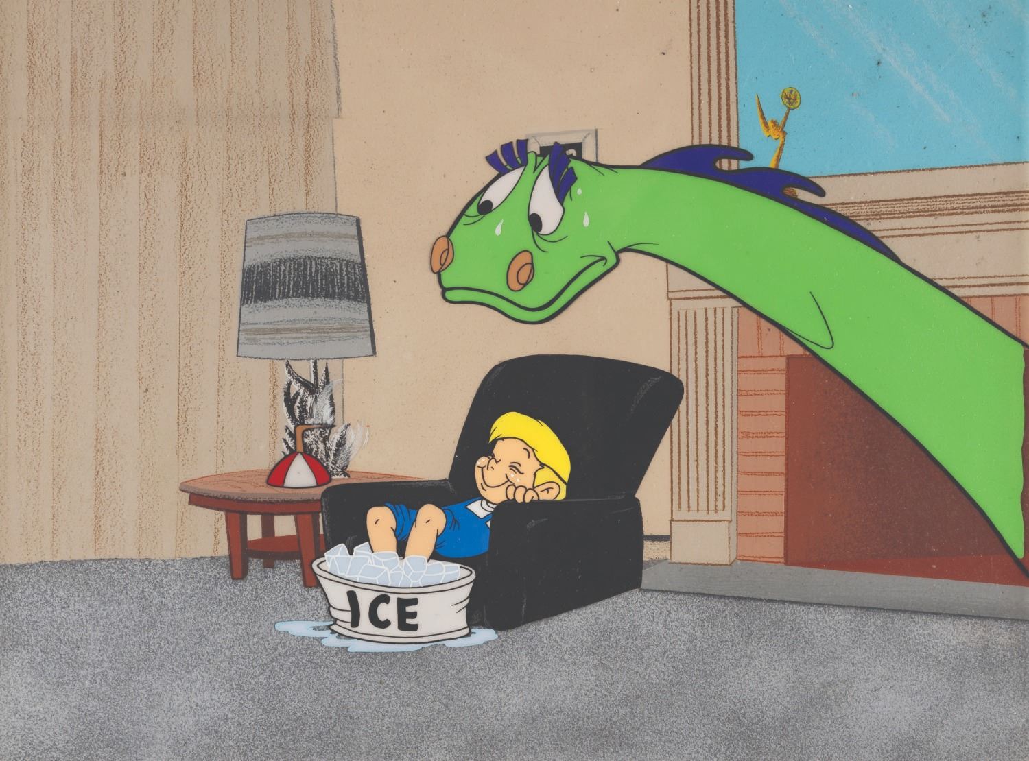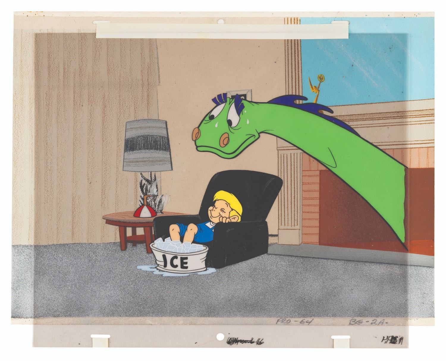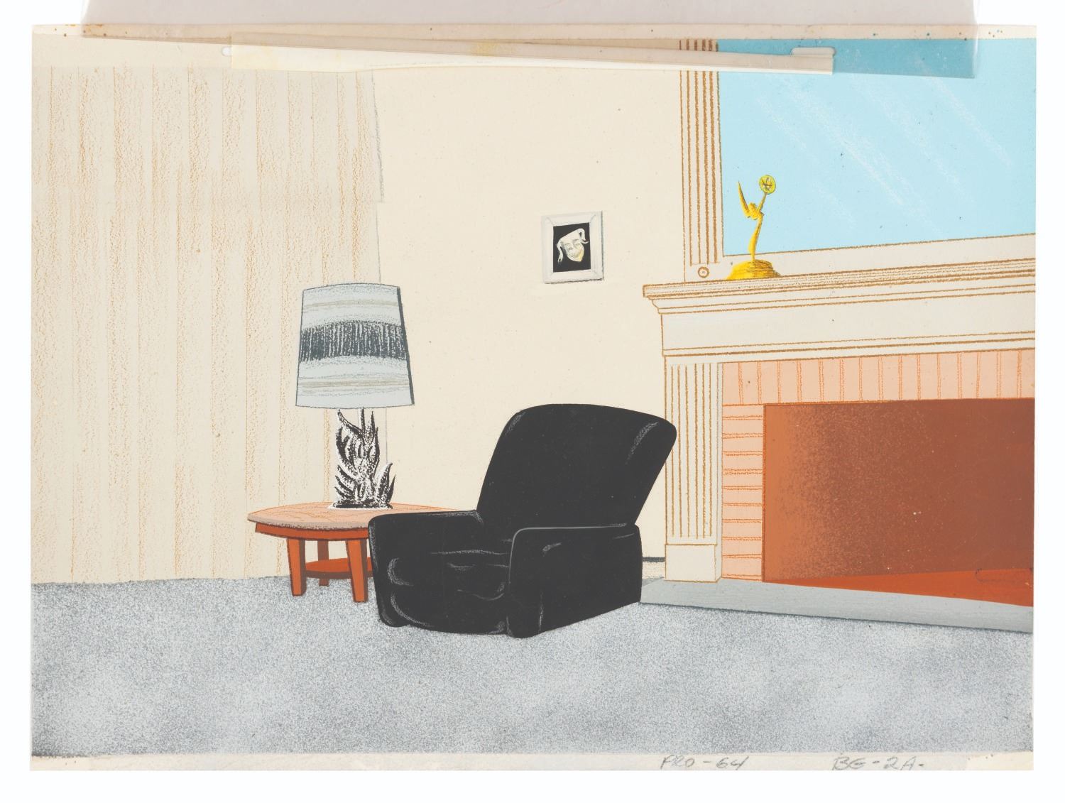 (Clampett, 1962) An original “Beany and Cecil” hand-painted production cel and scene-matching background from the episode “Ten Feet Tall and Wet.” Bob Clampett used his own home and backyard for the designs of the backgrounds in the episode, and in this shot, Bob hid one of his three Emmy Awards onto the mantel. With a character image size of 6” x 8.5” on a 10.5” x 12.5” cel and 10.5” x 14” background, the piece is in fine condition with corner pinholes to the background from production use.