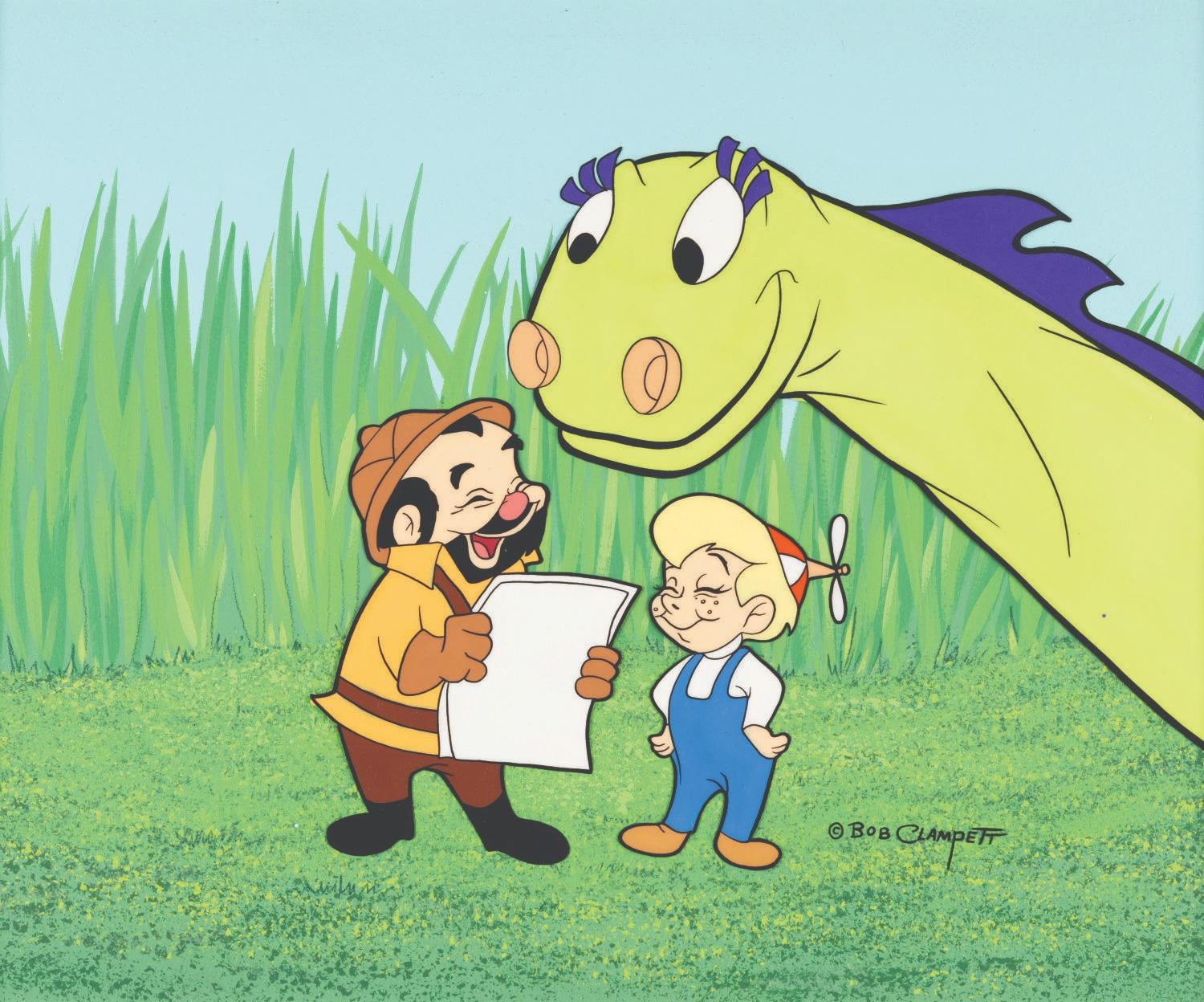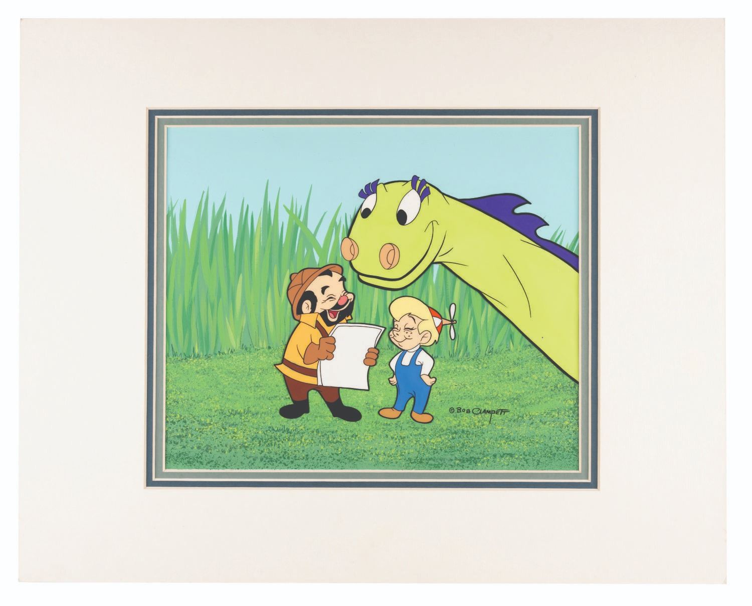 (Clampett, 1960s) An original hand-painted publicity cel of Beany, Cecil, and Captain Huffenpuff from “Beany and Cecil,” paired with an original production background from an unknown episode from the series. With a character image size measuring 7” x 9” on a 9.75” x 11.75” visible cel in a 16” x 20” matte, the cel and background are in fine condition.