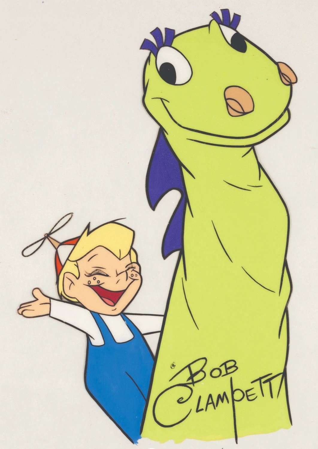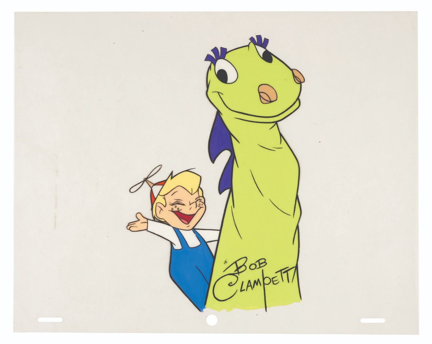 (Clampett, 1960s) A hand-inked and painted “Beany and Cecil” studio publicity cel. Measuring 8” x 10” with a character image size of 7” x 4.5”, the cel is in very good condition with light smudging to Beany’s right eye and a 2” mark of adhesive residue on the left side which does not affect the character image.