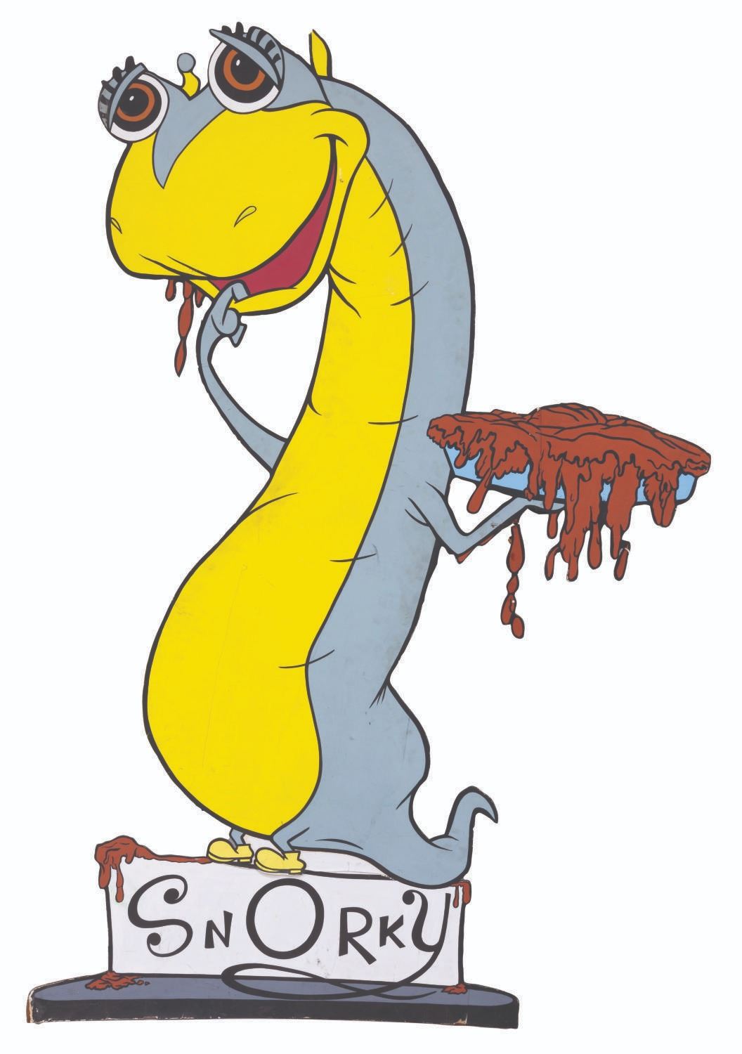 (Clampett, 1960s) A handmade wooden cut-out of Snorky from “Beany and Cecil" holding a melting pie. The character appeared in the final episode of the animated series, where his backstory is narrated through song. Measuring 57.5” x 92.5” and 0.25" thick, the display is in fair condition with scratches throughout, scuffs, peeling, stains, pinholes, wear, and several separations at the bottom of the pie drippings. Due to size and weight, this item requires special shipping arrangements. Please inquire before bidding.