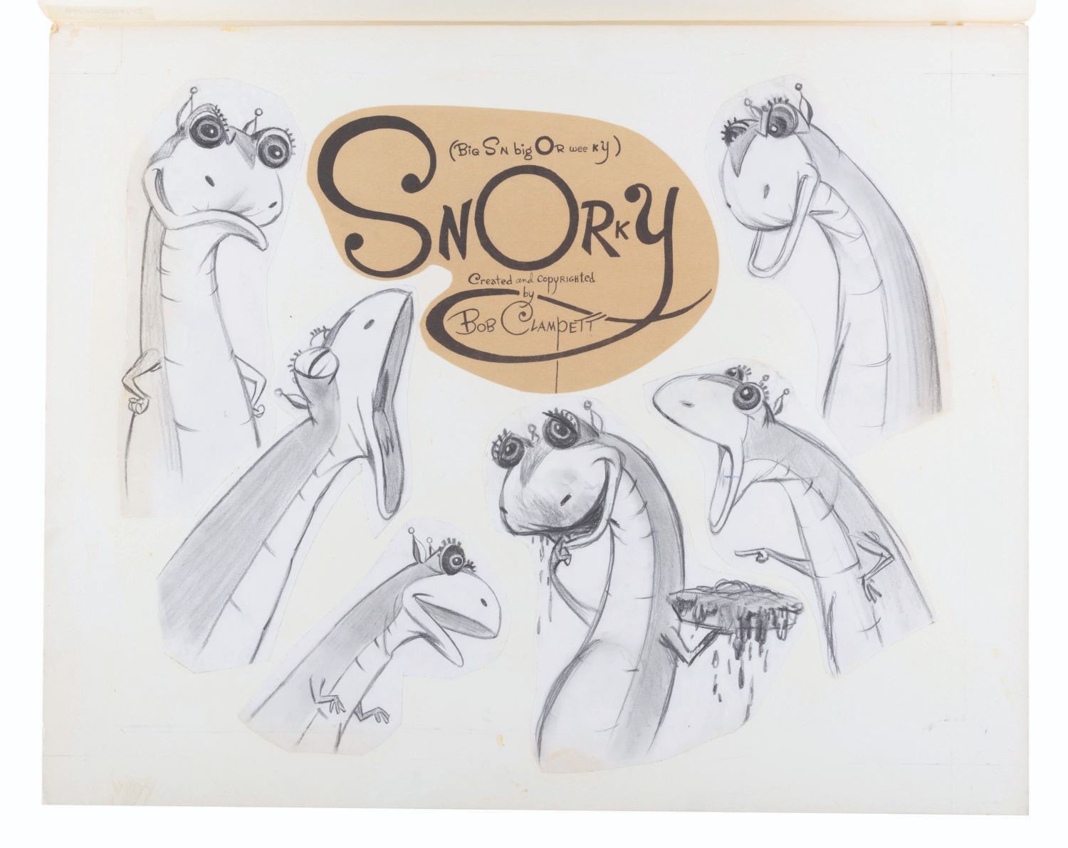 (Clampett, 1962) An original hand-drawn model sheet of Snorky from the “Beany and Cecil” episode “There’s No Such Thing as a Sea Serpent.” The model sheet consists of six graphite drawings of the character and one copy of the text, cut and pasted to illustration board. Measuring 16” x 20” the model sheet displays in very good condition with light discoloration and edge wear from production use.