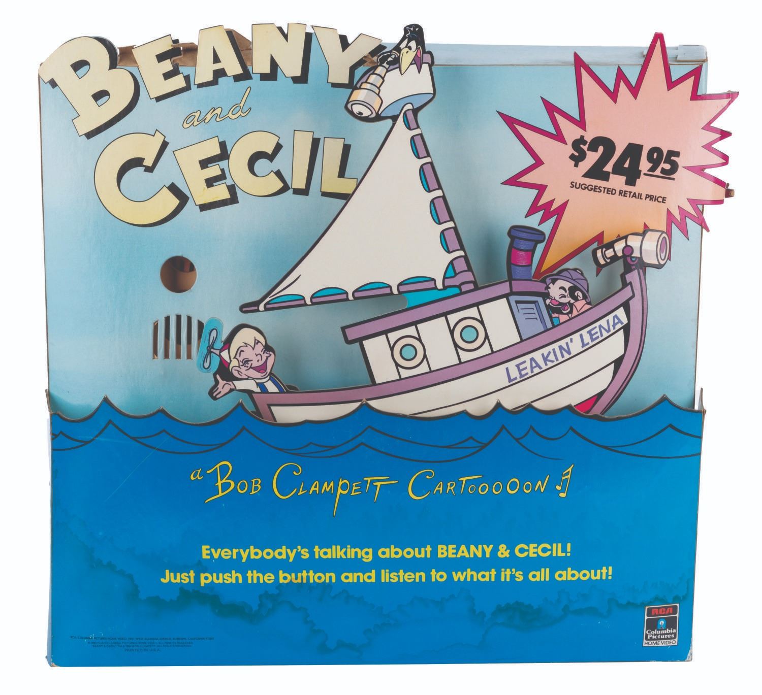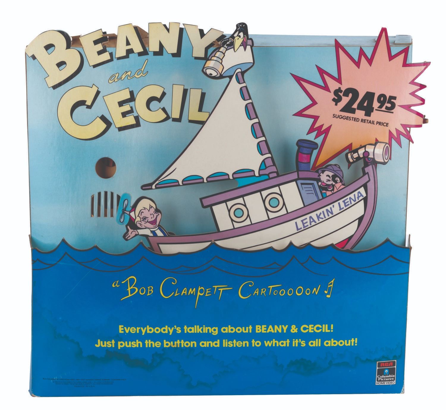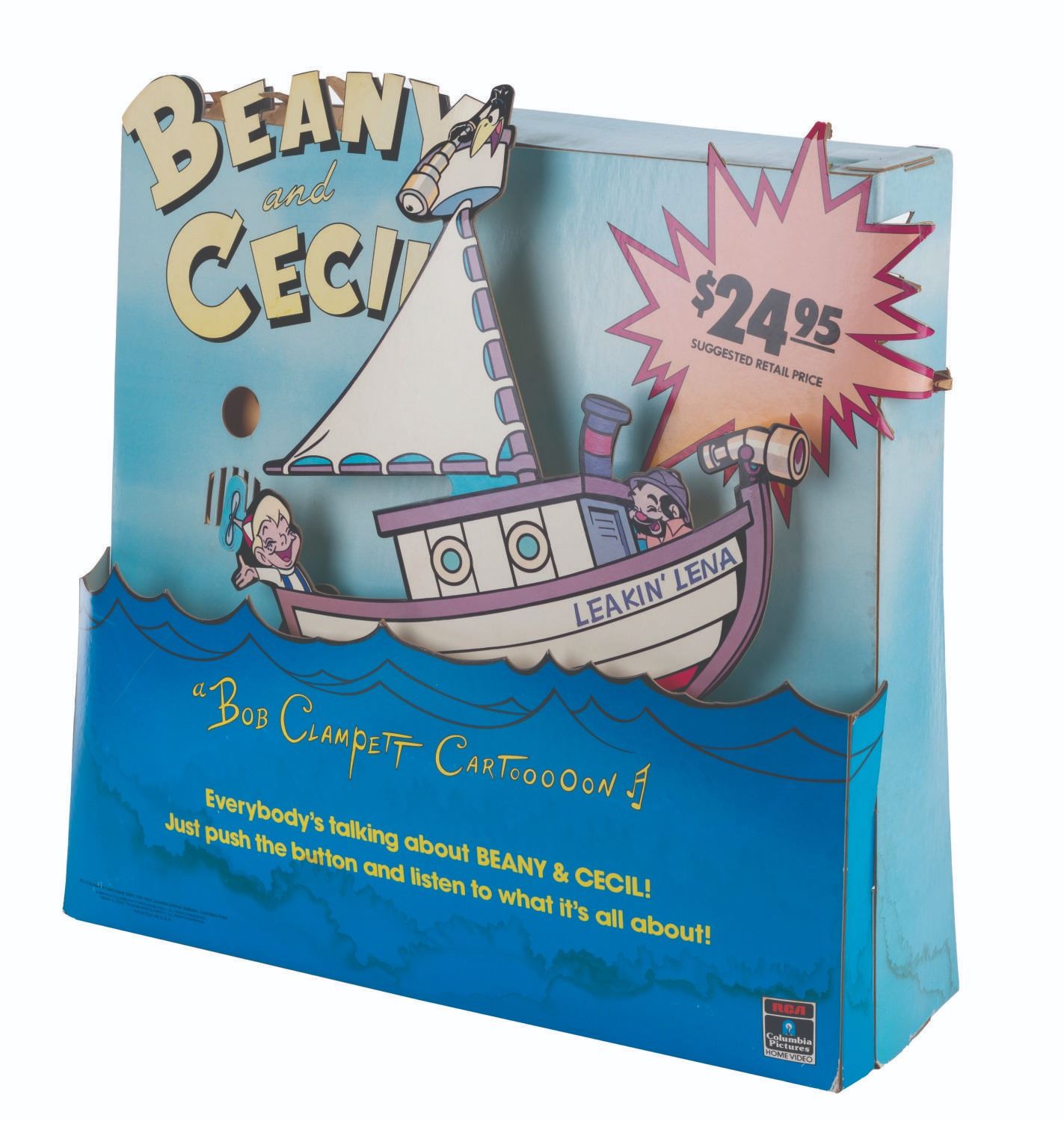 (RCA/ Columbia, 1984) A “Beany and Cecil” motorized and talking video store display promoting the 1984 release of “Beany and Cecil” on VHS and Betamax. With a battery-operated motor and voice box, the Leakin’ Lena was designed to rock back and forth while Cecil emerges from the waves to present a sales pitch for the series. Both the motor and voice box have been tested, and only the voice box is operational with a C-cell battery (not included). Measuring 17.5” x 20” x 5” deep, the display is in good condition with water stains along the bottom, color shift from sun exposure, and edge wear from store use.