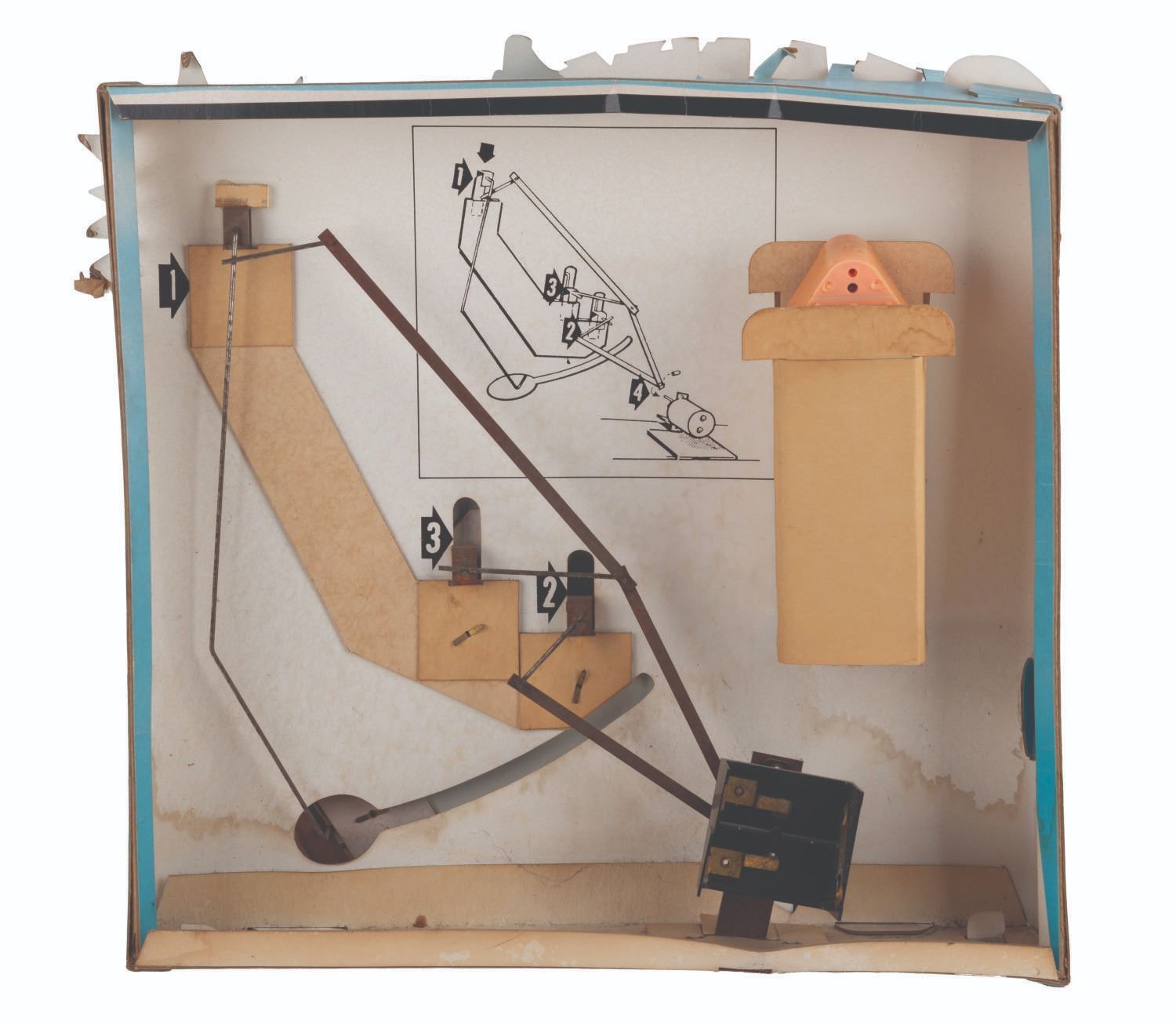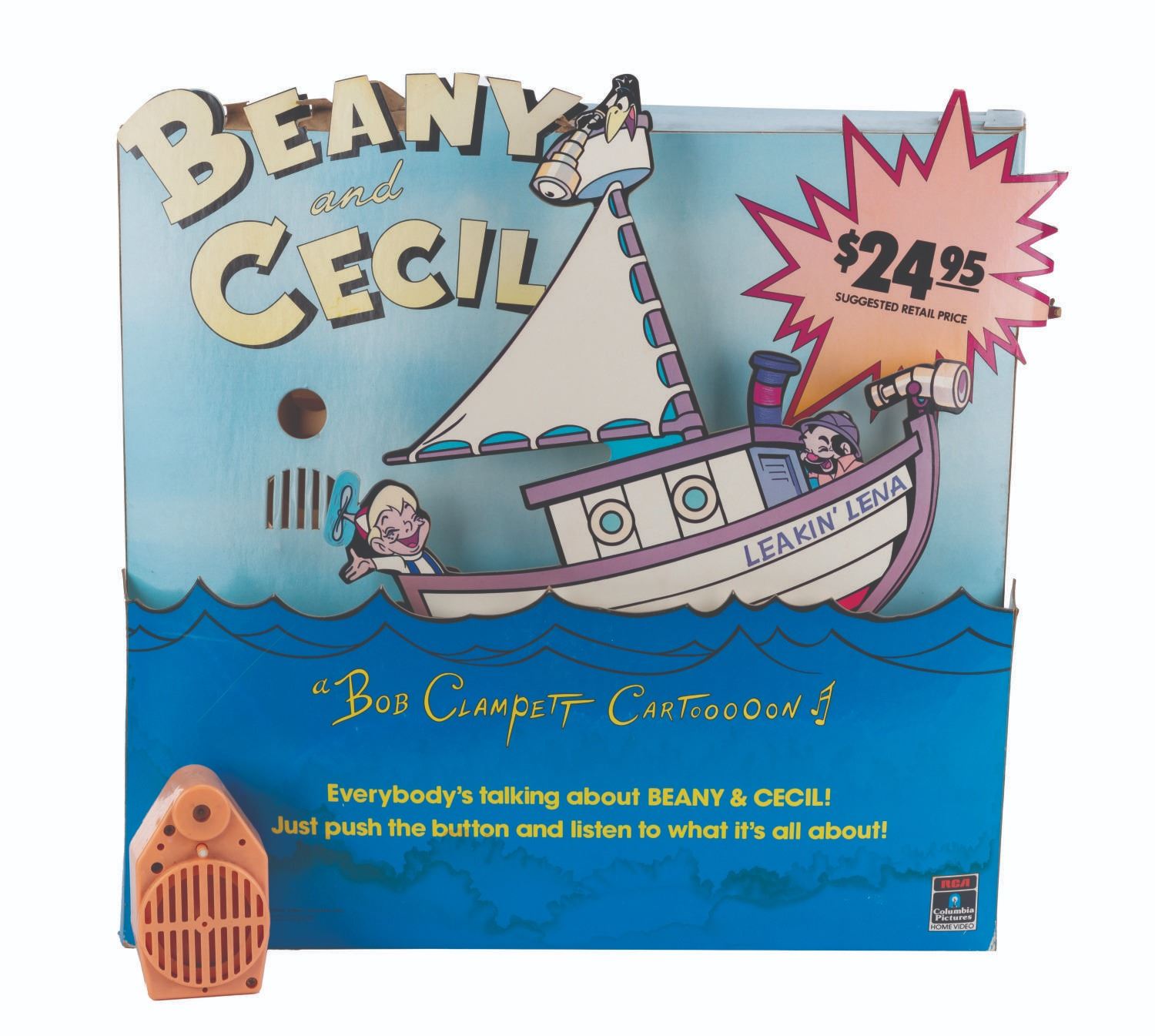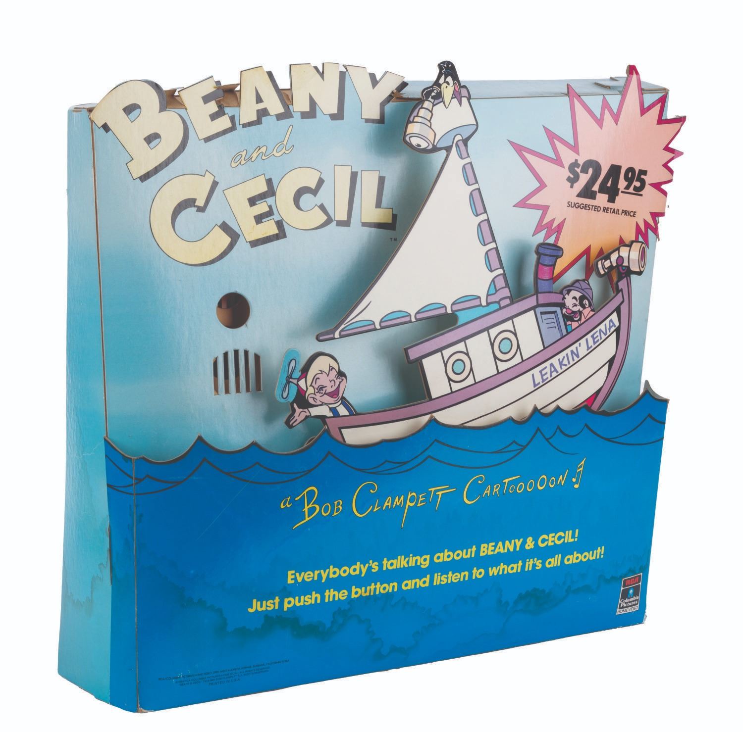 (RCA/ Columbia, 1984) A “Beany and Cecil” motorized and talking video store display promoting the 1984 release of “Beany and Cecil” on VHS and Betamax. With a battery-operated motor and voice box, the Leakin’ Lena was designed to rock back and forth while Cecil emerges from the waves to present a sales pitch for the series. Both the motor and voice box have been tested, and only the voice box is operational with a C-cell battery (not included). Measuring 17.5” x 20” x 5” deep, the display is in good condition with water stains along the bottom, color shift from sun exposure, and edge wear from store use.