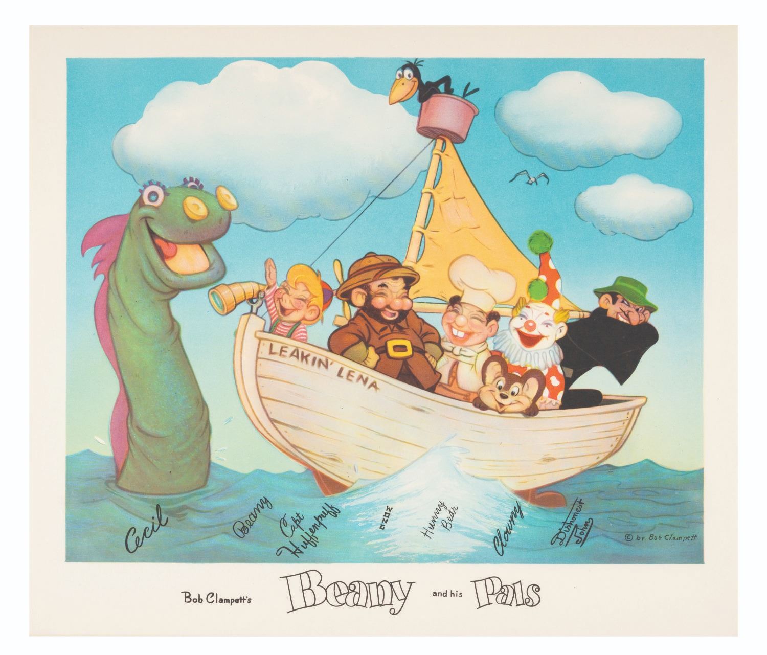(Clampett, 1950s) A fan card featuring Bob Clampett's “Beany and his Pals” with Beany, Cecil, Capt. Huffenpuff, Clowny, Crowy, Hopalong Wong, Hunny Bear, and Dishonest John. Measuring 8.5” x 11”, the card is in fine condition.
