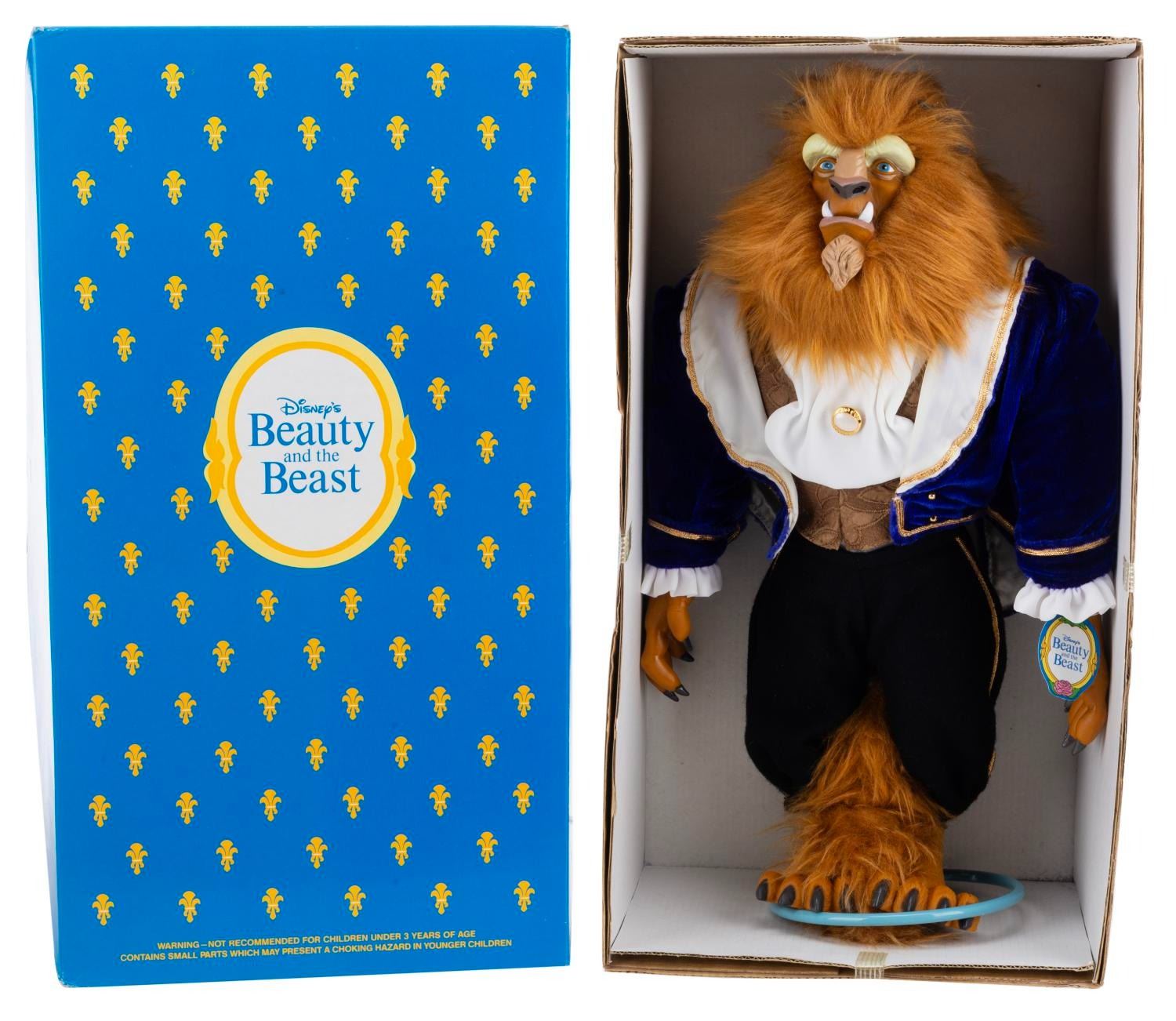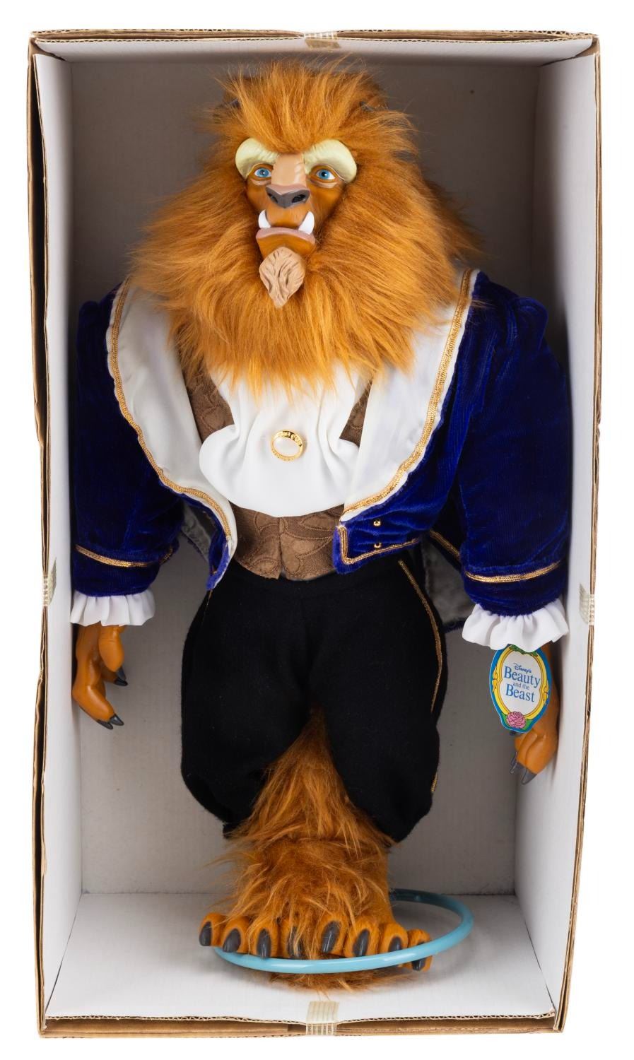 (Dakin, 1990s) A doll of Beast in his elegant dinner outfit from "Beauty and the Beast." The doll features fabric elements with a plastic face and hands. Measuring 14" tall in its 8.5" x 6" x 15.5" original box, the doll is in fine condition.