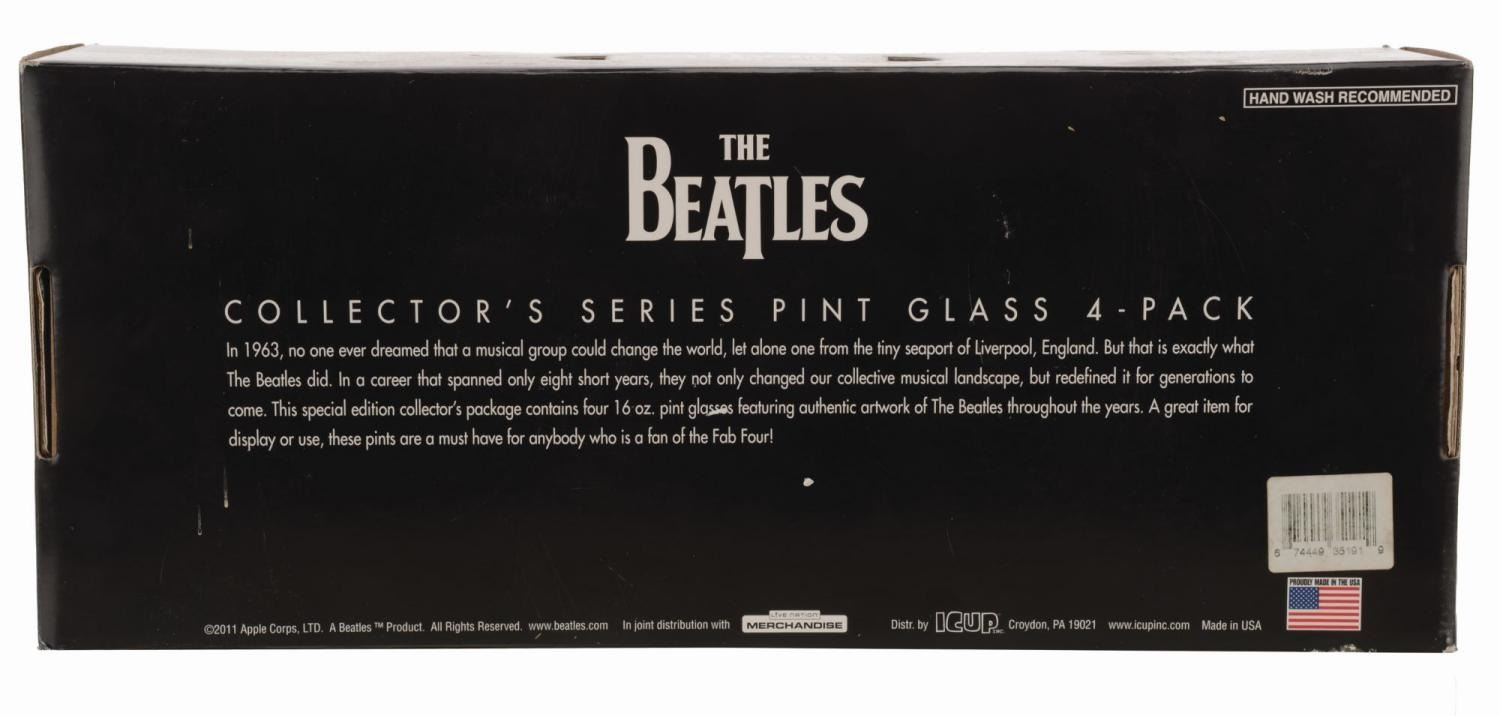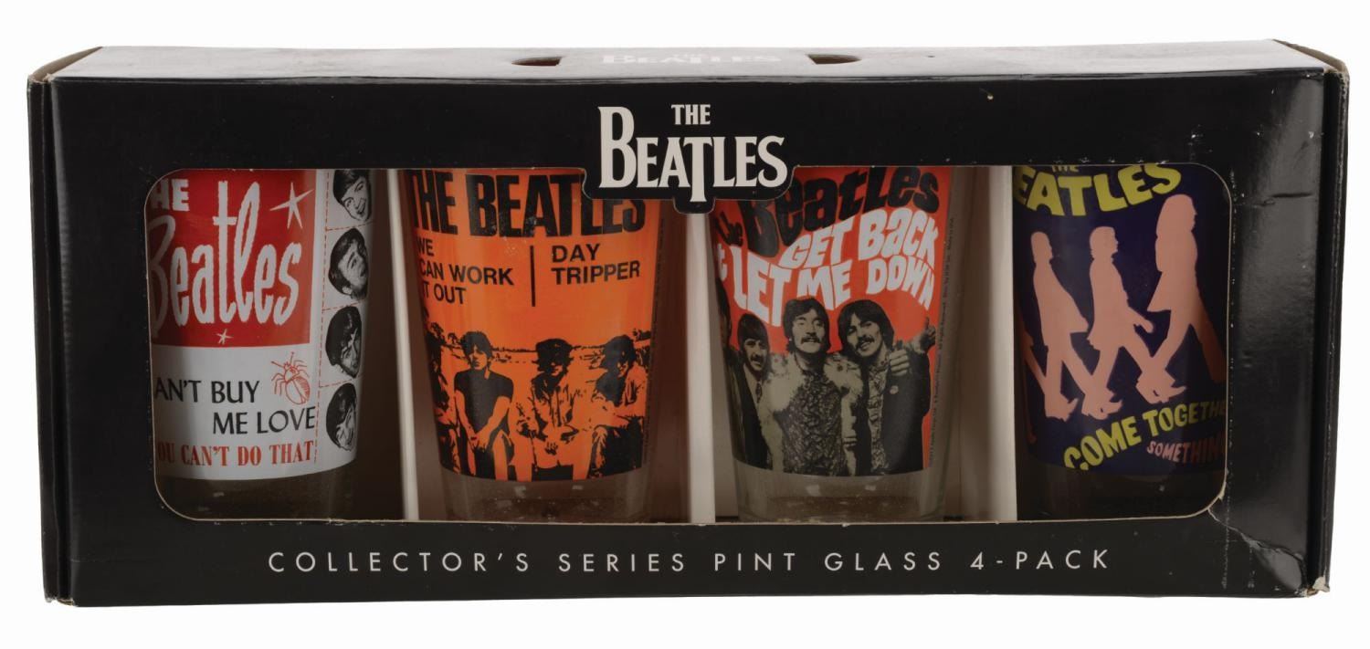(Apple Corps, 2011) A boxed set of four pint glasses themed with Beatles artwork and song titles. The set is in fine condition with light wear to the box from handling and storage.