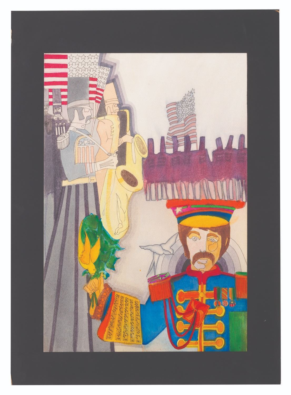 (Wallen, 1990s-2000s) An original painting by artist Bill Wallen, inspired by the Beatles’ “Yellow Submarine” animated film. Wallen signed his last name in marker on the reverse. Measuring 15” x 22” and adhered to a 20” x 27.75” artist’s board, the watercolor and marker painting is in very good condition with light stains and wear, while the board exhibits light scratches.