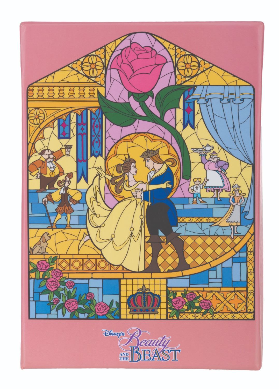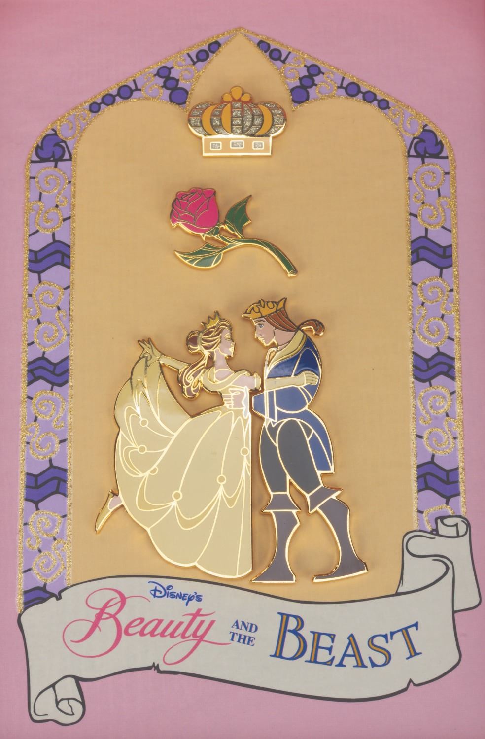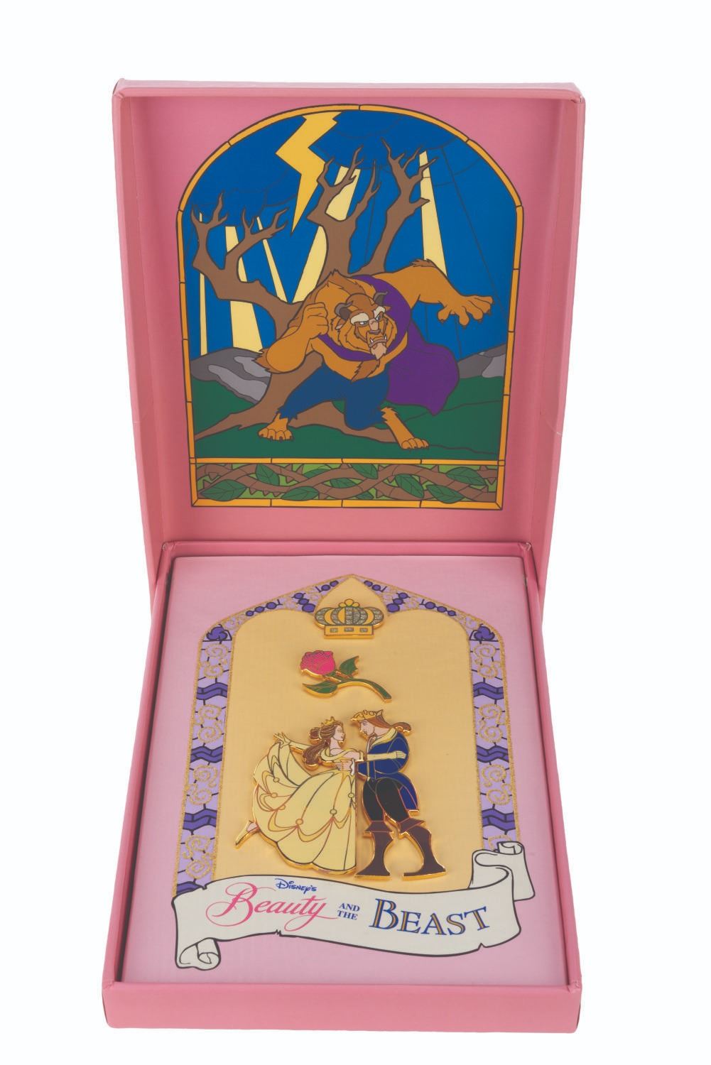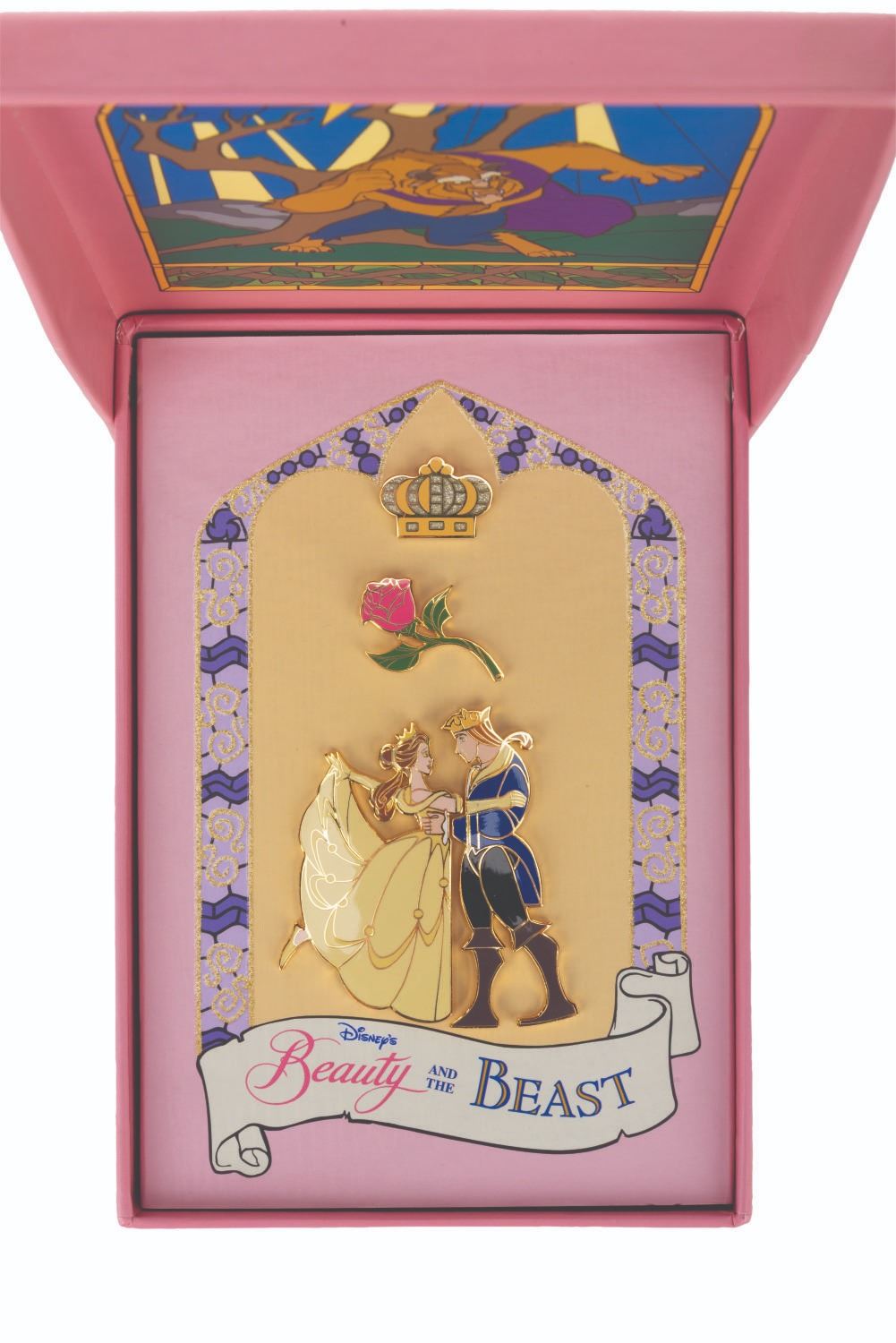 (Disney, 2001) A "Beauty and the Beast" four-pin set featuring a crown, the Enchanted Rose, Belle, and the Prince. Ranging in size from 0.75" x 1.25" to 3" x 3" in their 6.5" x 9" original box, the pins were released in a limited edition of 5000 and are in very good to fine condition with a spot of discoloration, while the box exhibits light wear.