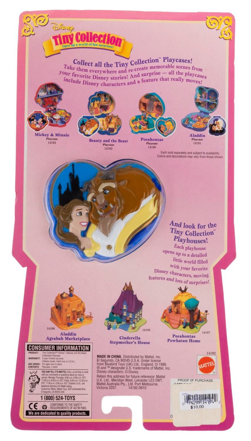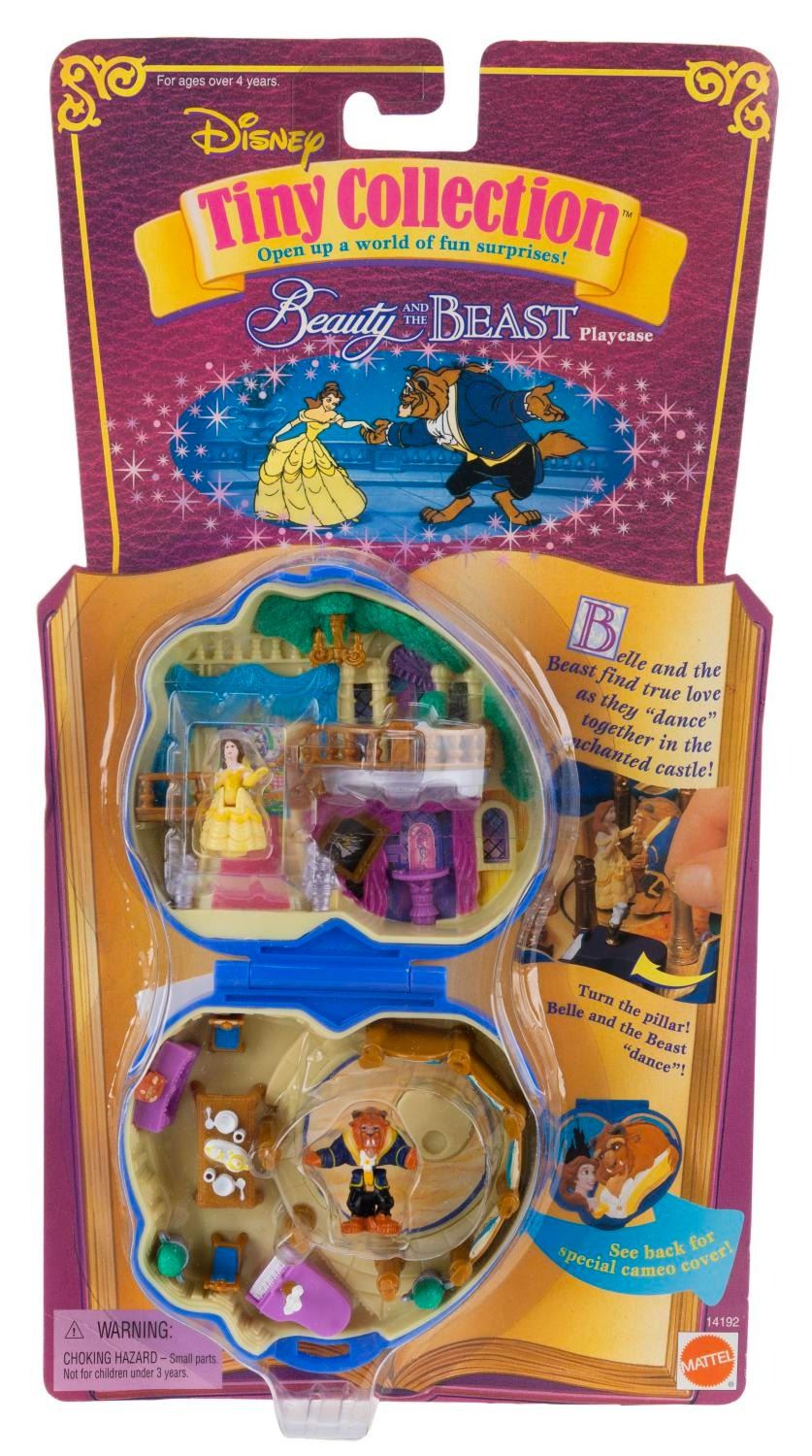 (Mattel, 1995) A "Beauty and the Beast " Tiny Collection Playcase set. Included are tiny Belle and Beast figures and Beast's Enchanted Castle interior. Measuring 2 " x 7 " x 12.5 " in the original packaging, the set is in fine condition while the packaging exhibits light edge wear and creasing.