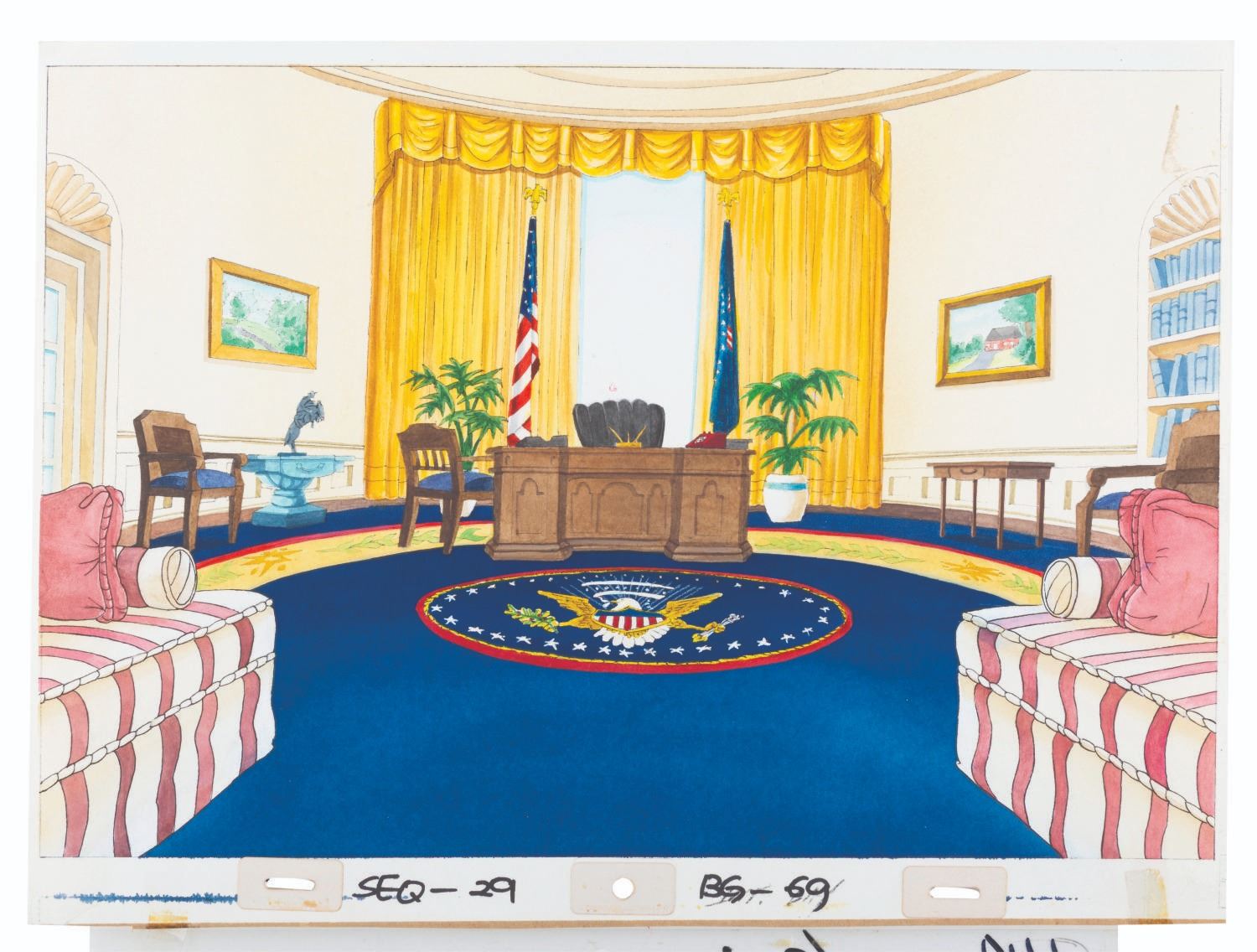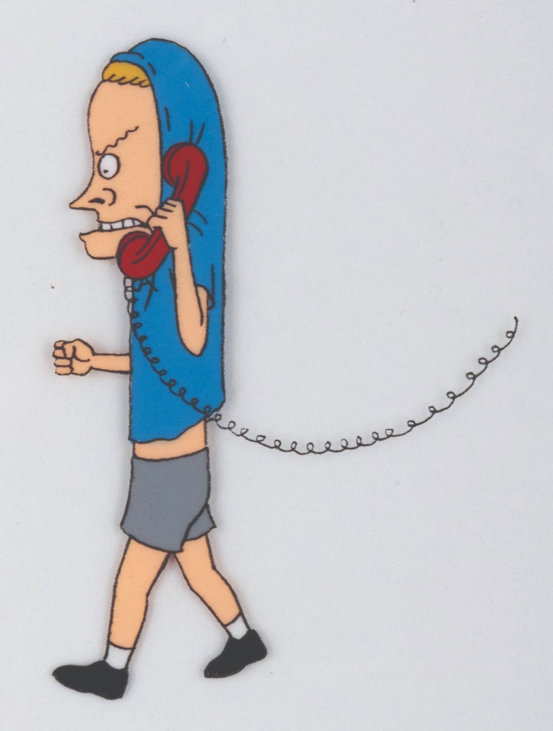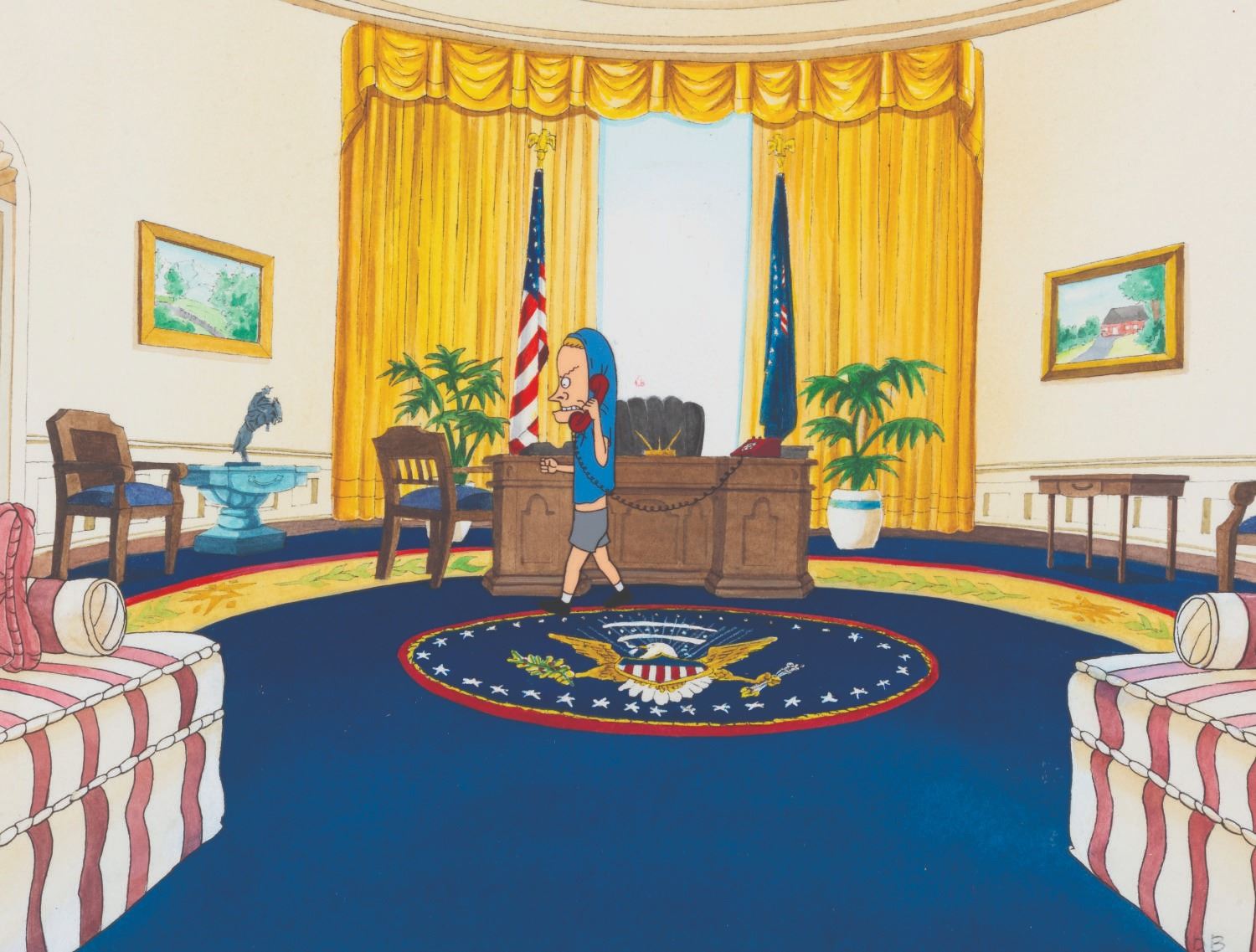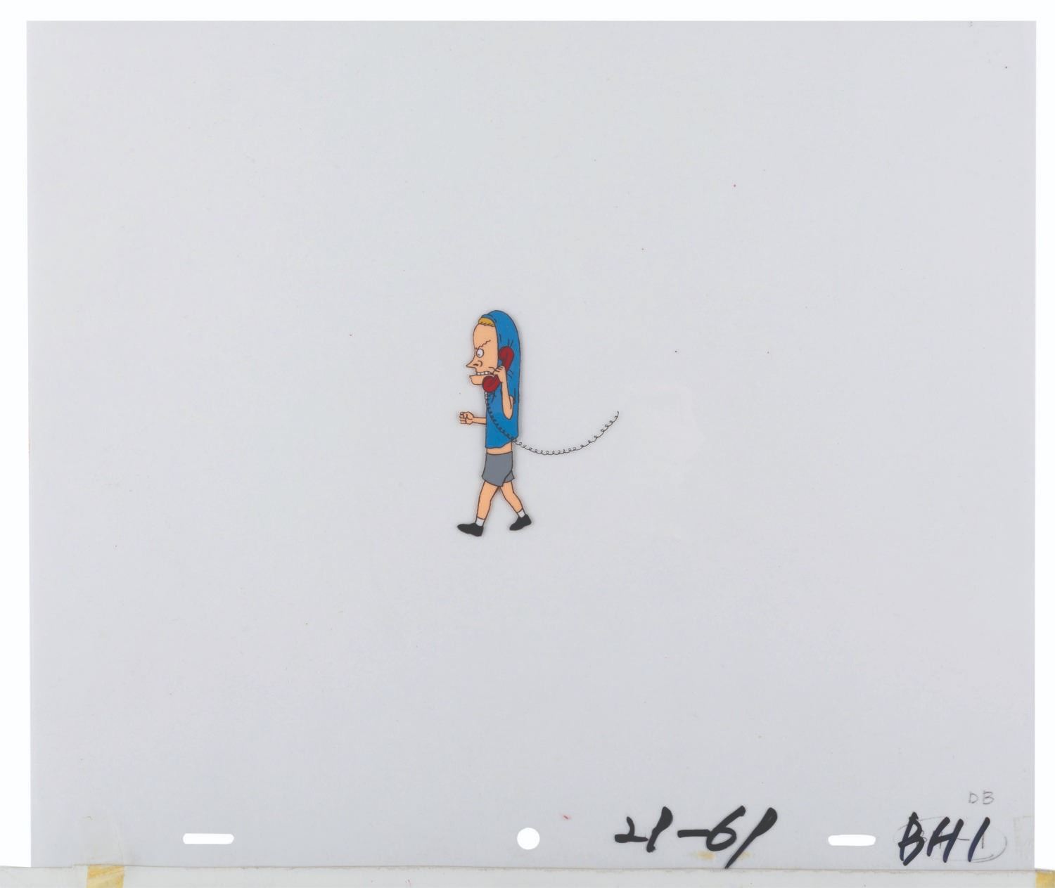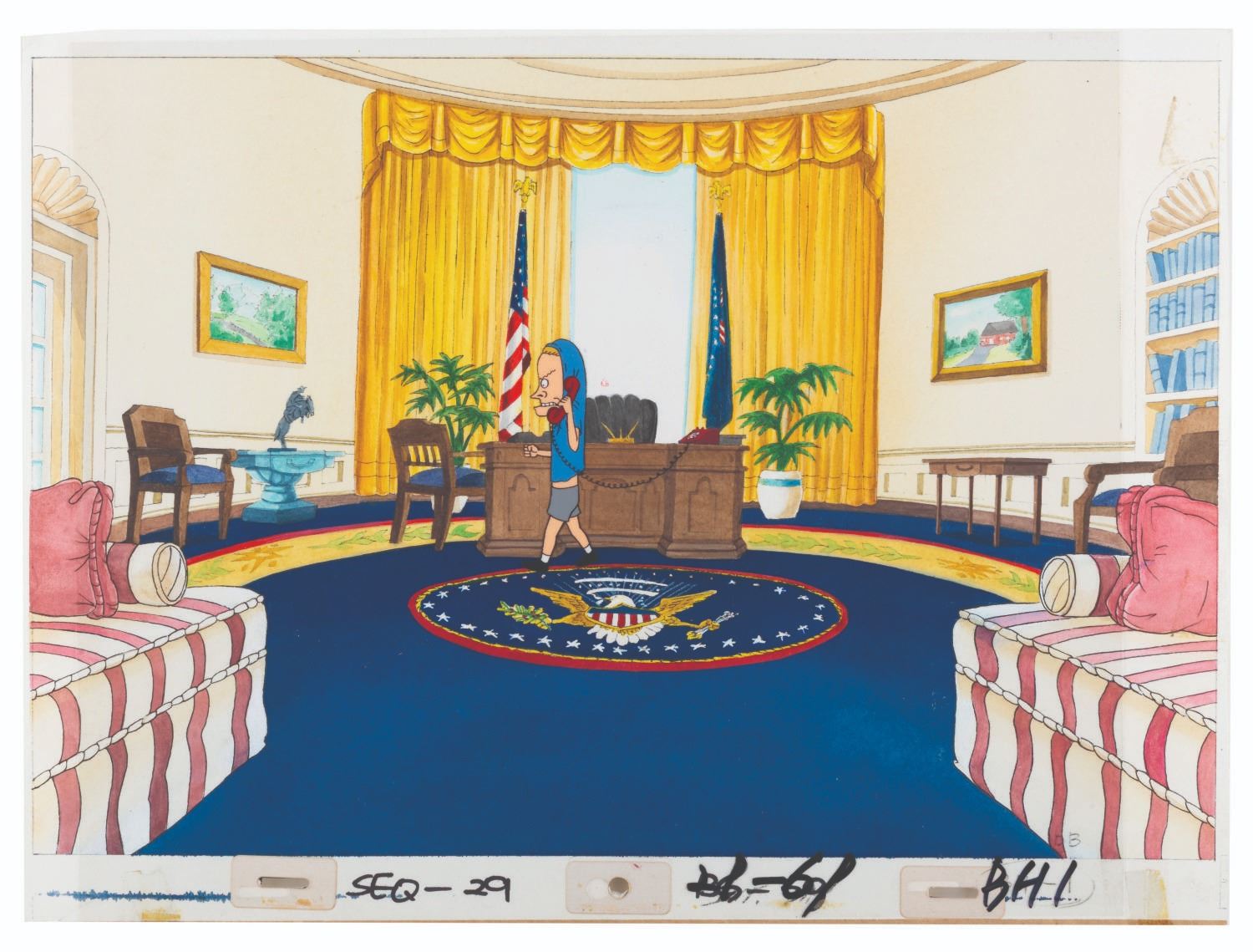 (MTV/Paramount, 1996) A very rare original production cel and background from the feature film"Beavis and Butt-Head Do America." The cel is from the climactic moment when Beavis, as Cornholio, puts the country on nuclear alert from the President’s phone in the Oval Office. The 10.5" x 12.5" cel has a character image size of 2.75" x 2" and is in fine condition. The background accomplished in watercolor measures 10.5" x 14.5" and displays in very good condition with a tiny spot of red paint transferred from the back of the cel that does not show when displayed, and a 1.5" scuff in the upper left corner of the artwork, but outside of the cel’s field.