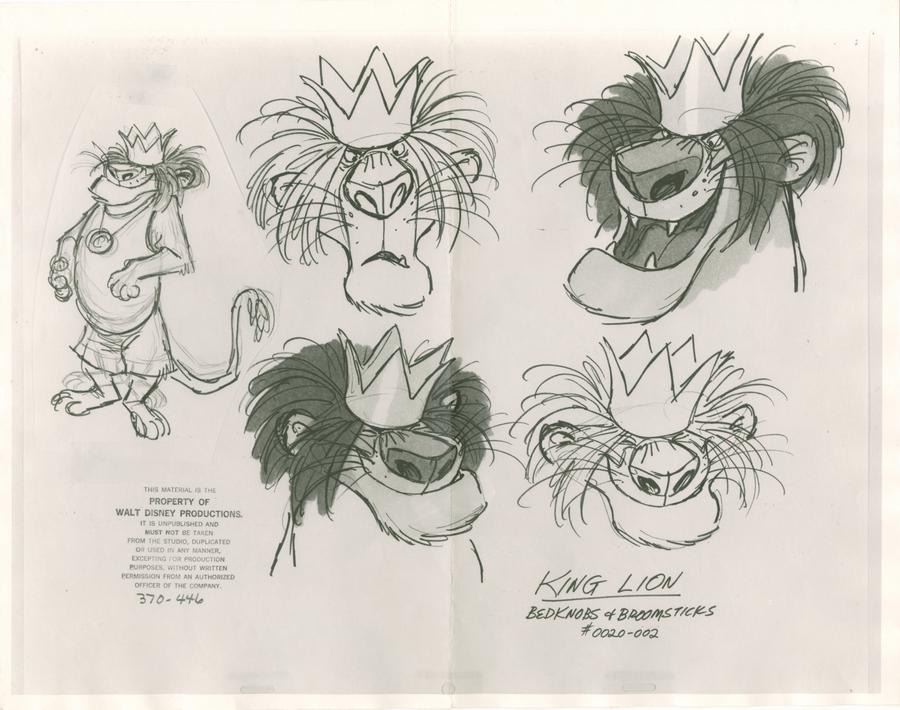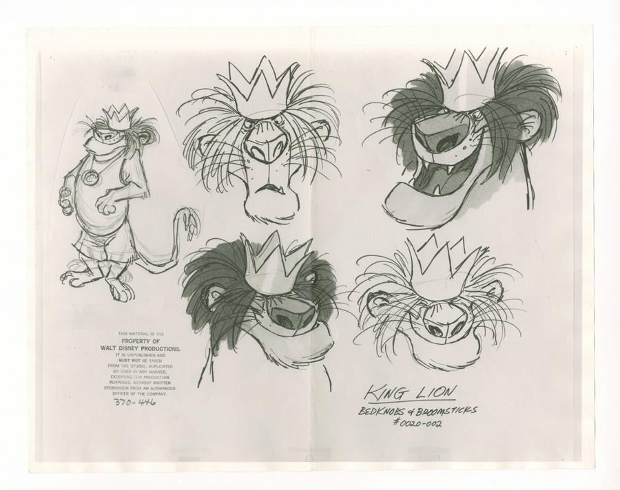 (Disney, 1971) An original photostat model sheet of King Leonidas from the live-action and animated “Bedknobs and Broomsticks.” Model sheets such as this were distributed to animators and crew working on the film to ensure character design continuity. Measuring 11” x 14”, the model sheet is in good condition with minor edge wear and a vertical crease from Studio use and storage.