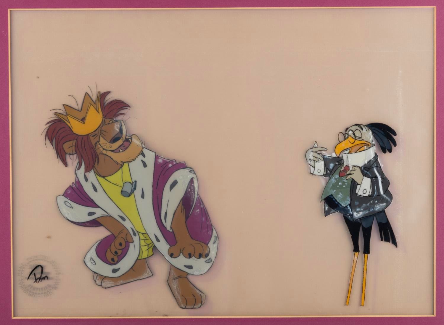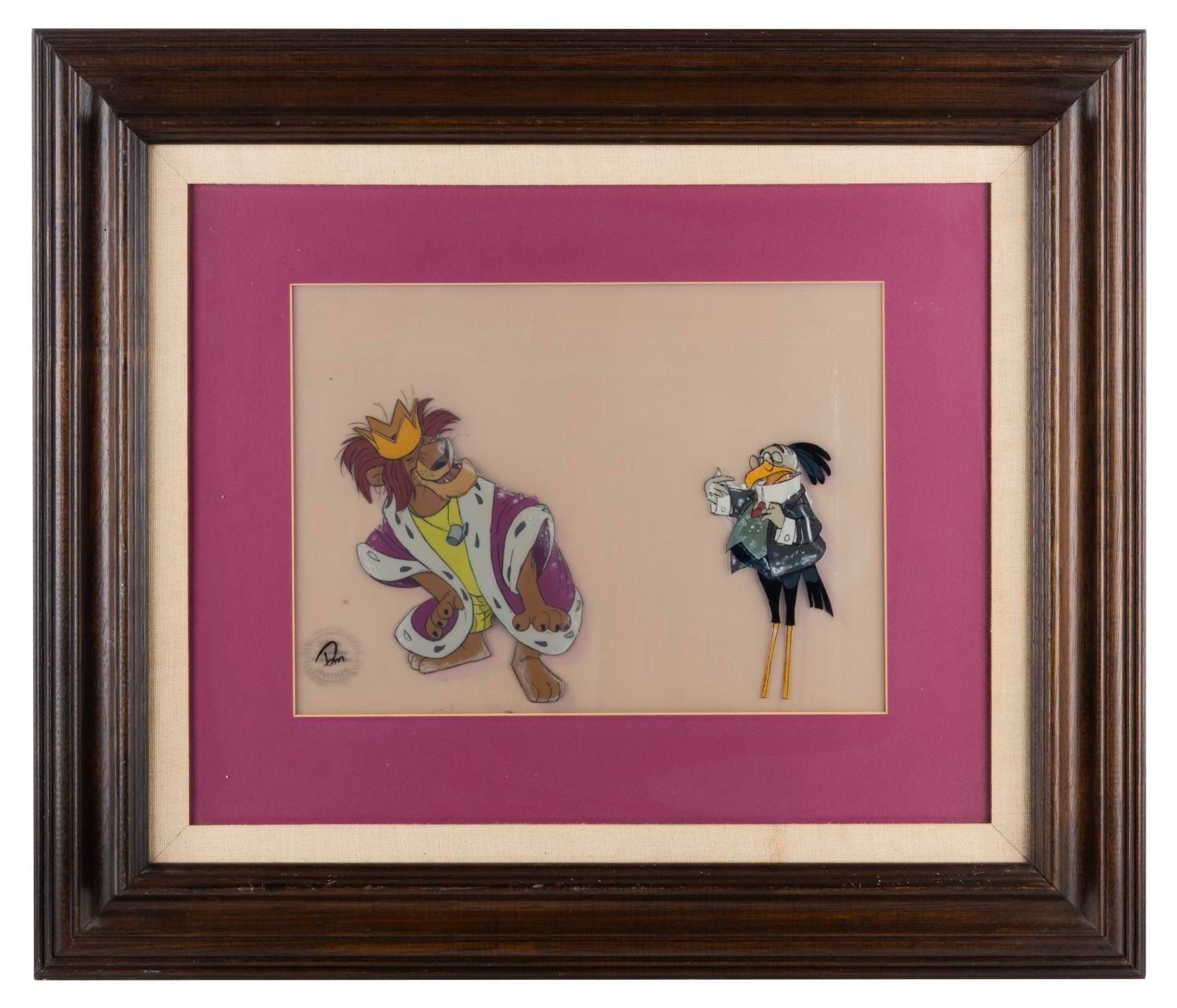 (Disney, 1971) An original production cel of King Leonidas and his secretary bird from the live-action and animated "Bedknobs and Broomsticks." King Leonidas and the bird have an image size of 7.5" x 12.5" on the 10.5" x 14.5" visible framed and matted cel. The cel displays in fair condition with paint lifting, rippling, and spots of discoloration throughout the characters.