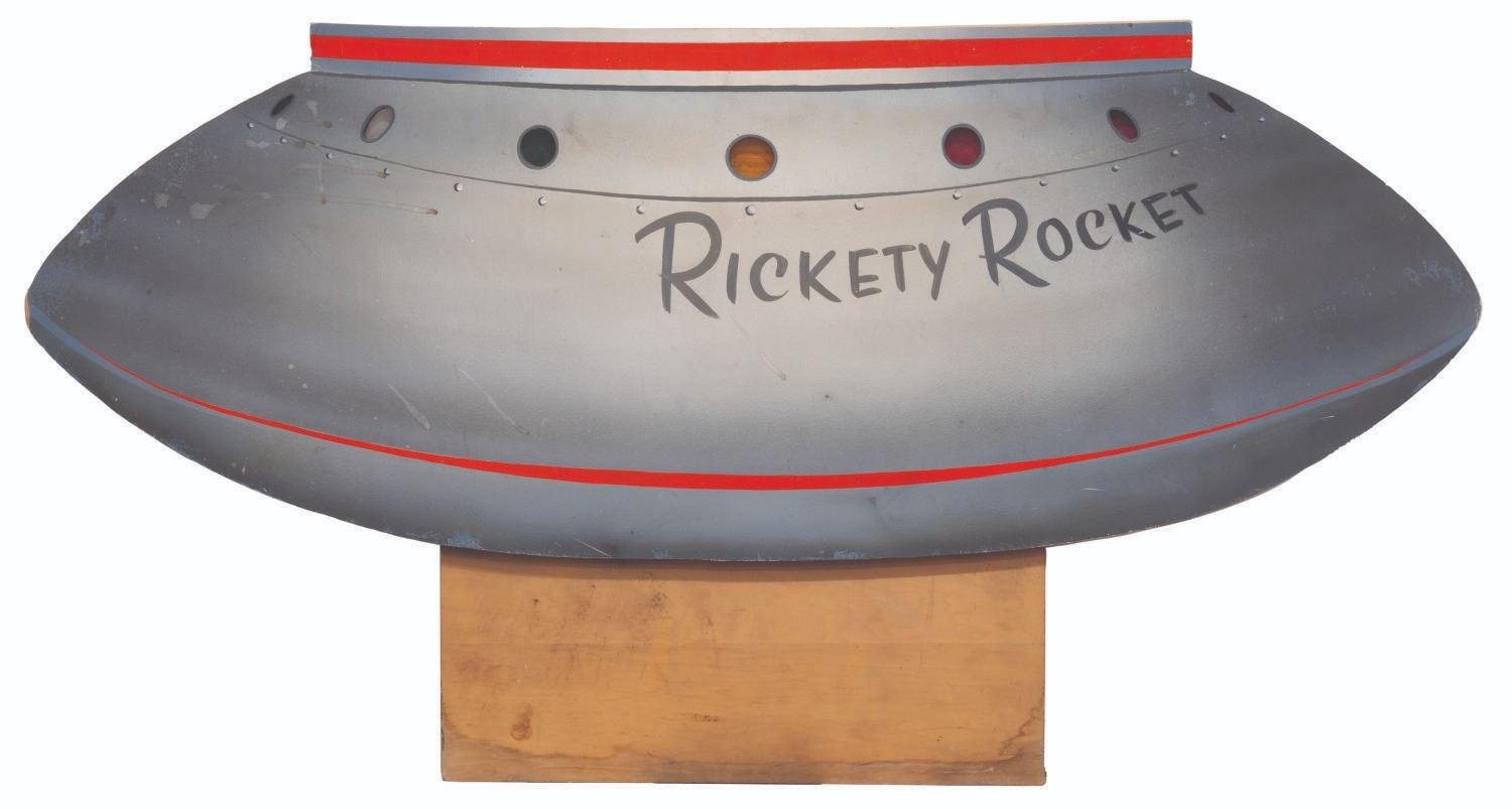 (Clampett, 1959) A wooden Rickety Rocket prop used in test footage for Bob Clampett’s unproduced series "Beeper and His Guided Muscle.” Measuring 14.5” x 39.75” and 0.5" thick and 21” x 39.75” x 0.75" with the wooden base, the ship displays in good condition with stains, scratches, scuffs, and wear. Due to size and weight, this item requires special shipping arrangements. Please inquire before bidding.