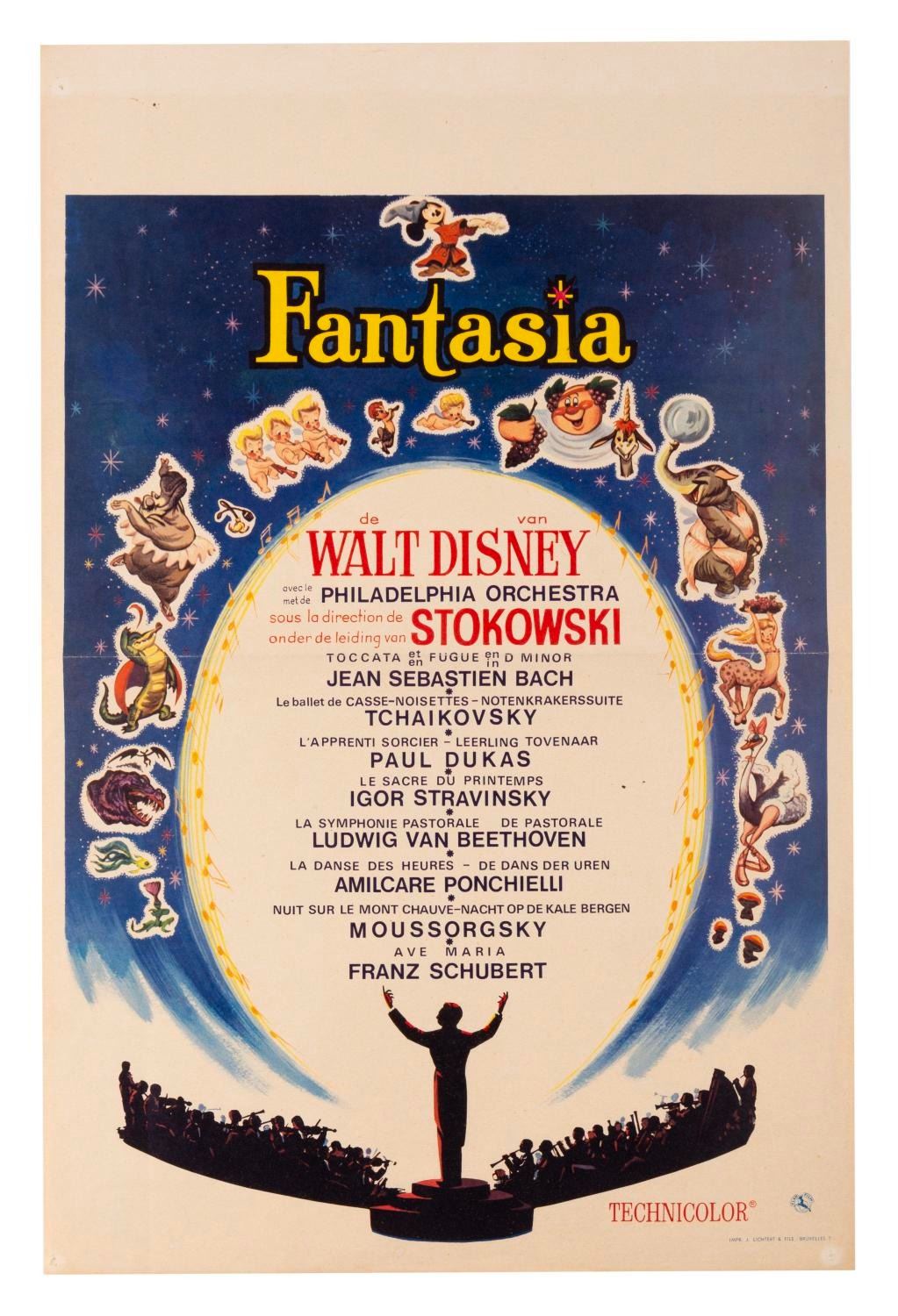 (Disney, 1953) A French-language “Fantasia” poster, most likely from the film’s first release in Belgium in 1953. Measuring 14” x 21”, the poster displays in very good condition with pinholes, slight discoloration from age, very slight spotting, and an original horizontal fold.
