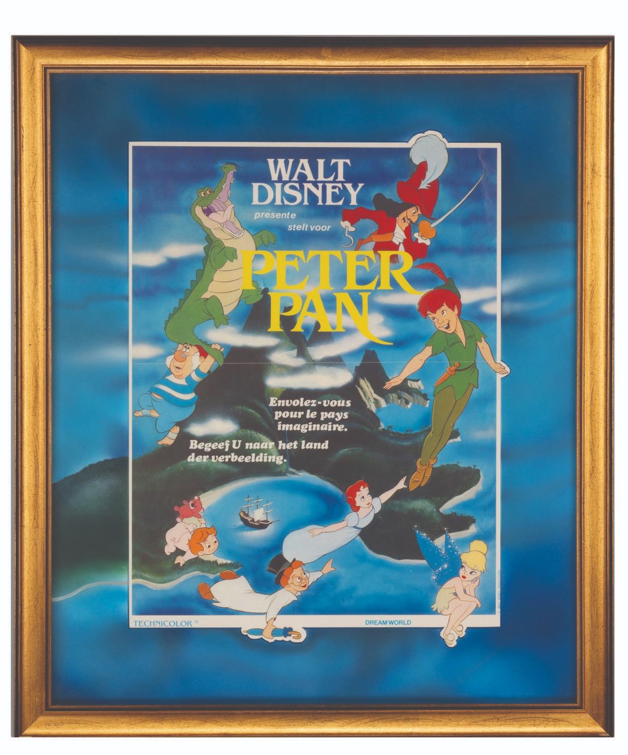 (Disney, 1966) A Belgian movie poster for "Peter Pan" with text in both French and Dutch. The poster shows 13" x 18" within a beautiful custom-painted matte and frame measuring 20.75" x 24.75" overall. The poster displays in very good condition with an original fold through the center.