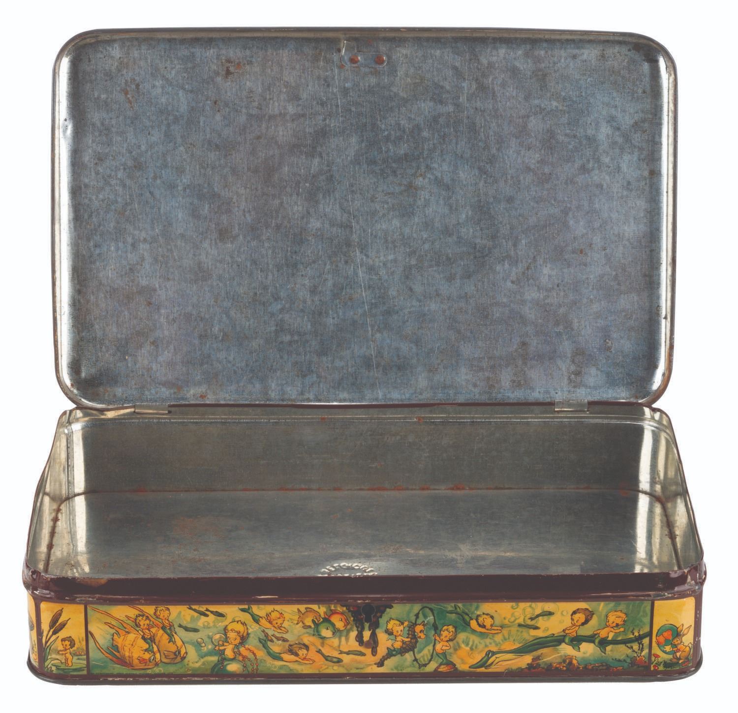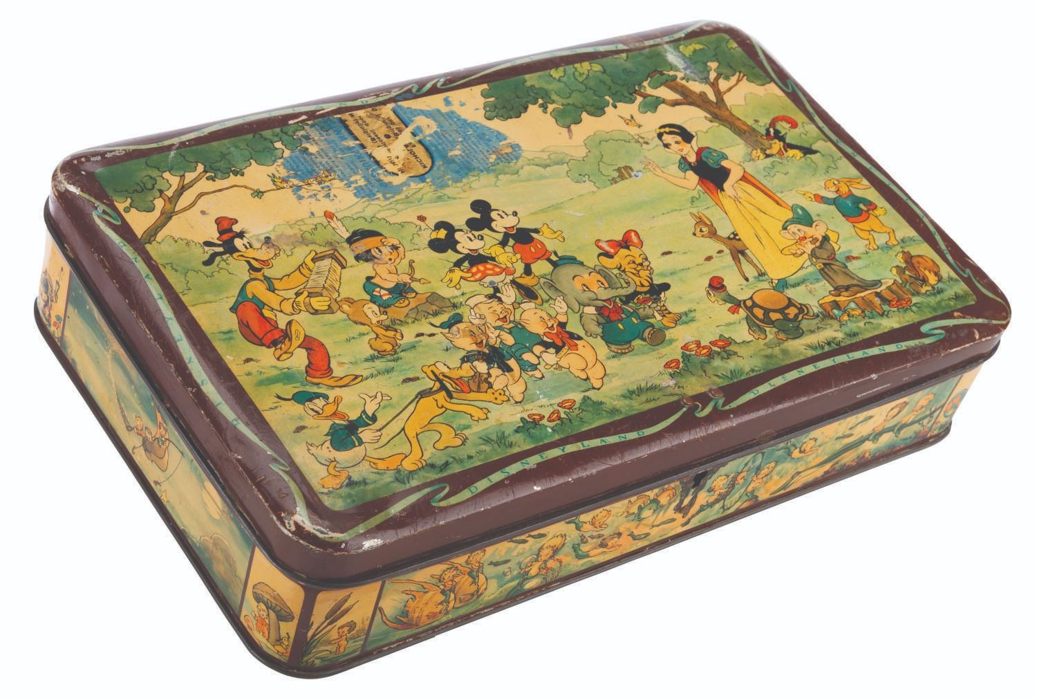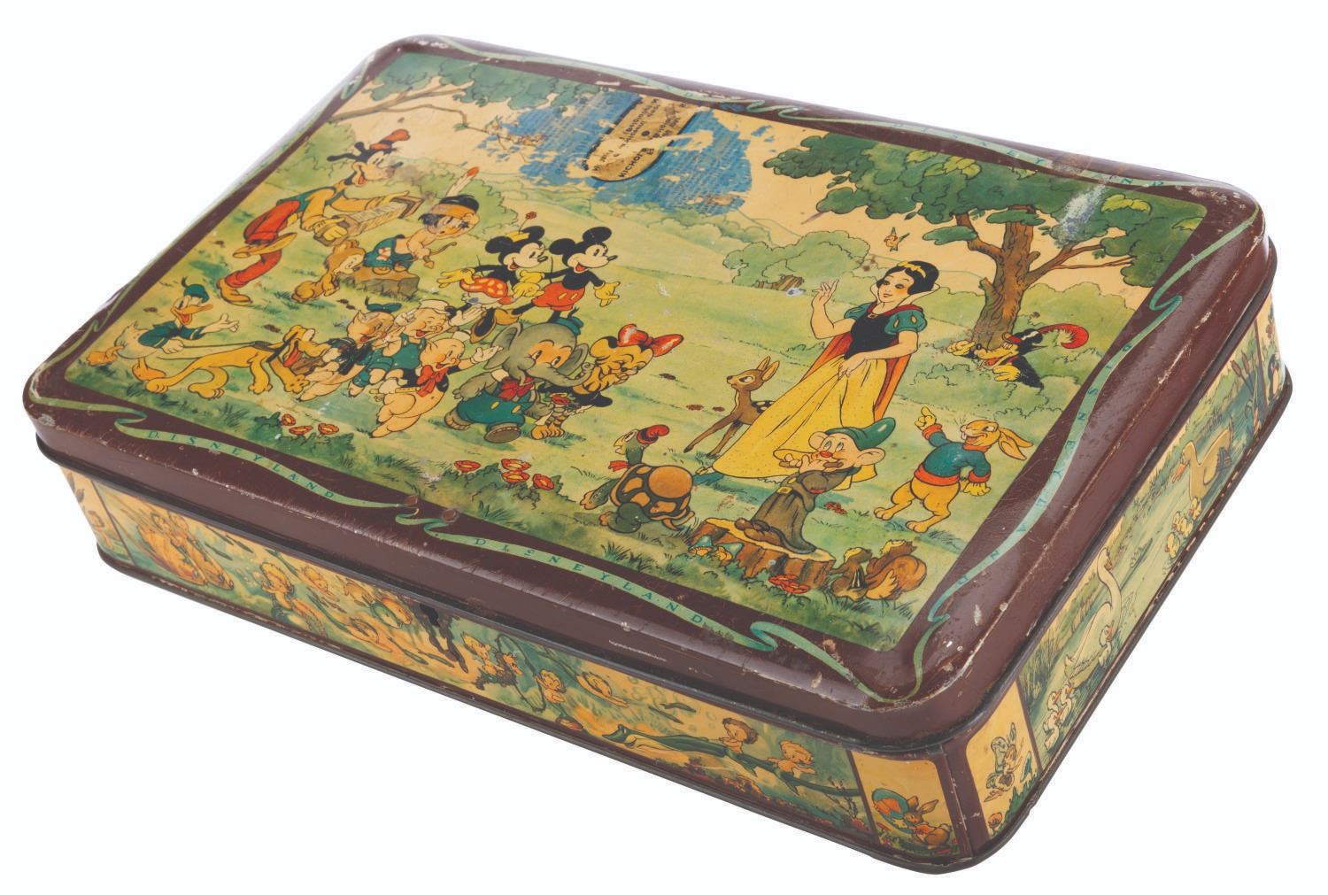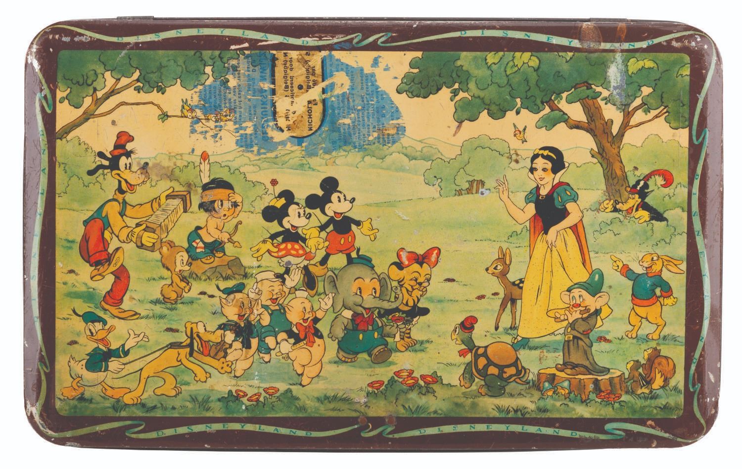 (Disney, 1930s) A Belgian metal lockbox featuring Snow White, Mickey and friends, and Silly Symphonies characters including the Three Little Pigs, Little Hiawatha, Elmer Elephant, and more. The box is missing the key and does not lock. Measuring 12.75” x 7.75” x 2.5”, the box is in fair condition with heavy scratches, scuffs, and oxidation, and a 3.25” x 2” area of text and pigment transfer to the top from contact with a magazine or other print material.