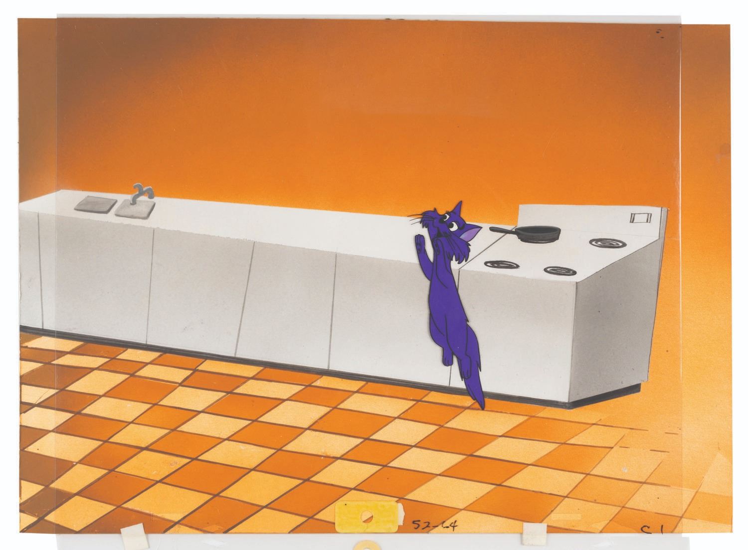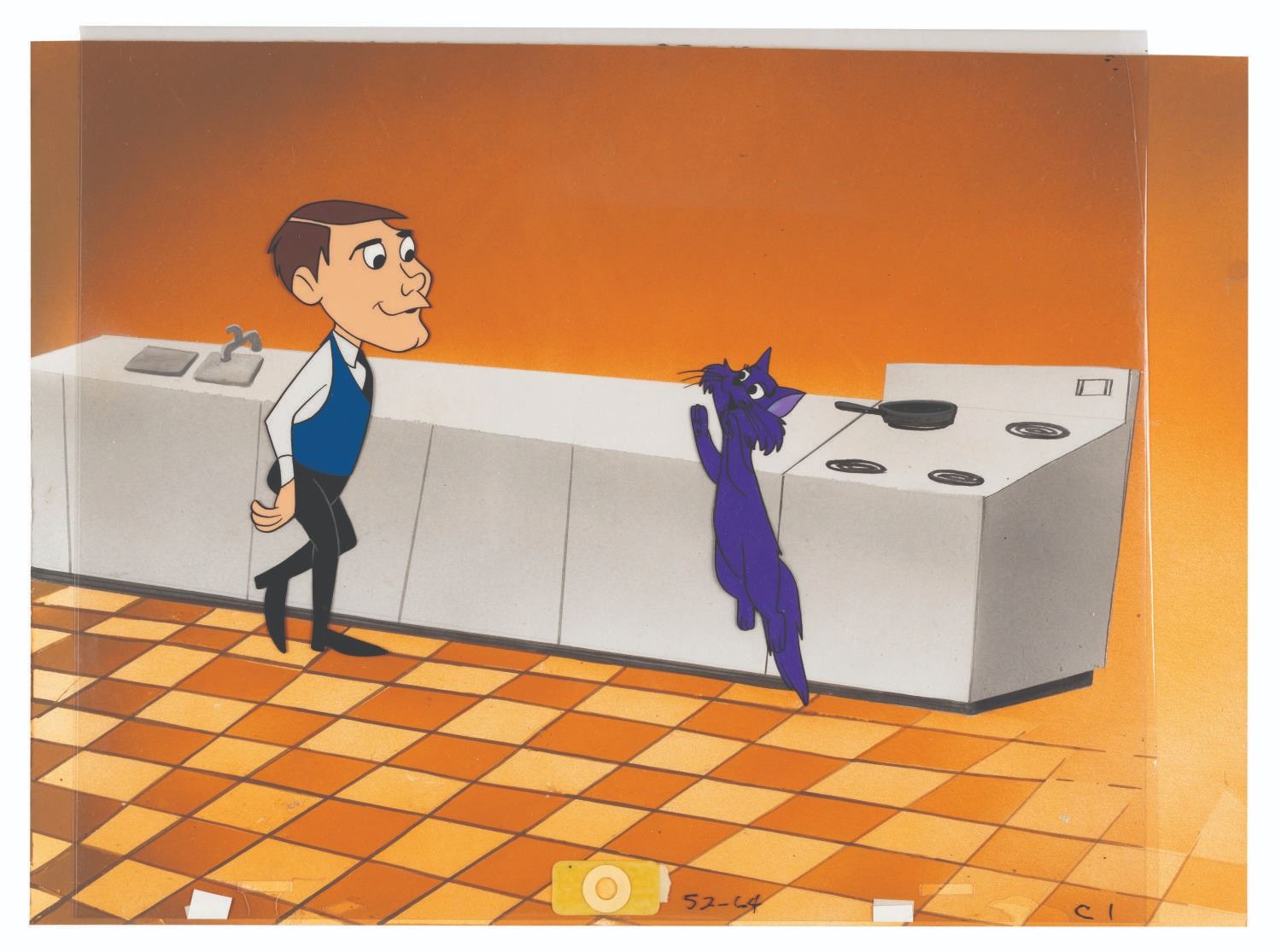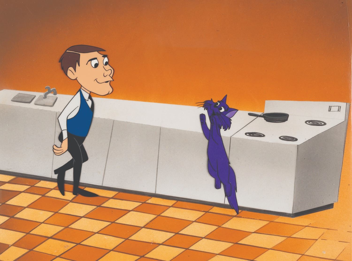 (Hanna-Barbera, 1964) A multi-layer production cel of Samantha in cat form and Darrin Stephens, from the title sequence of ABC’s “Bewitched.” Measuring 10.5” x 12.5” overall, with the character images measuring 4.25” x 4.25” and 5.75” x 2”, the cel is in fine condition. The cel is presented with a custom 10.25” x 14.25” hand-painted background, also in fine condition.